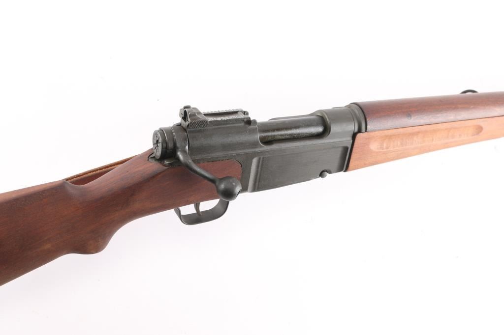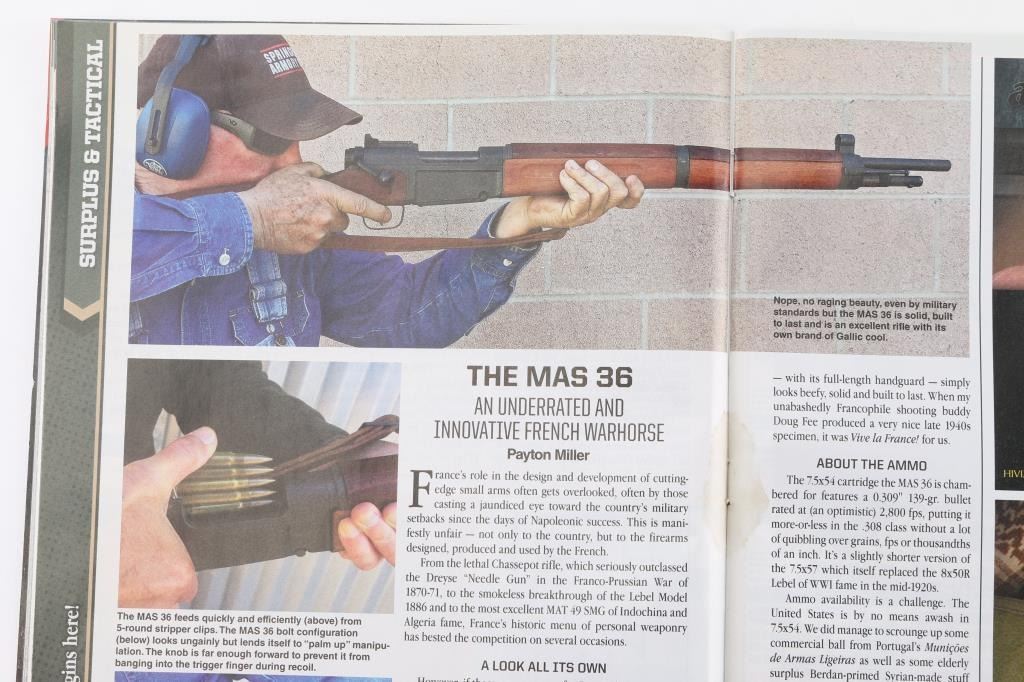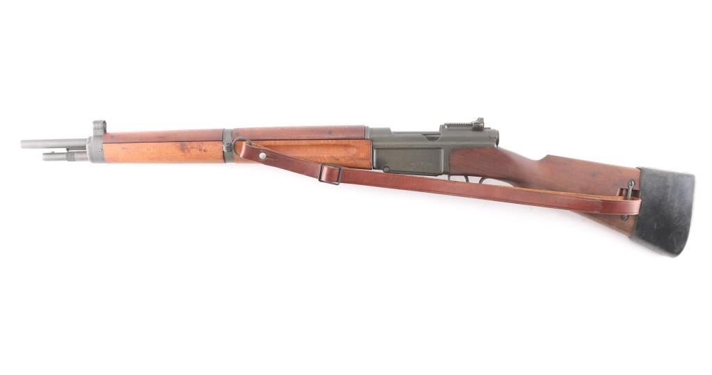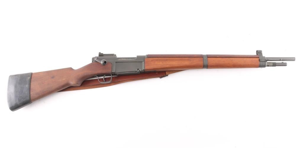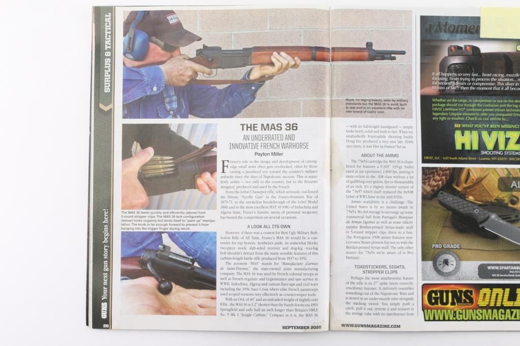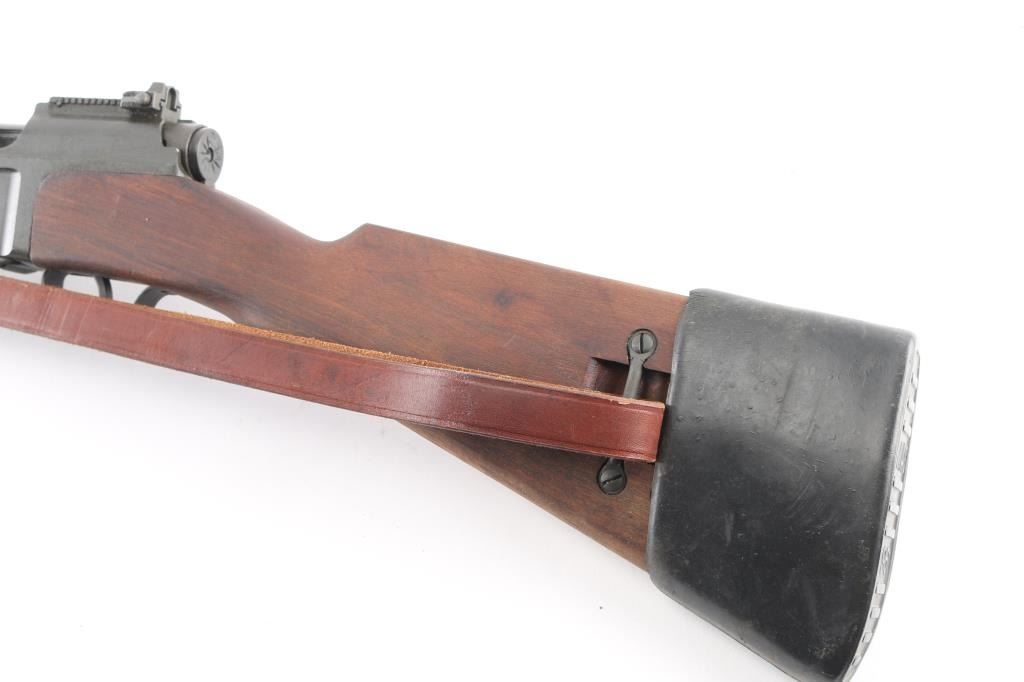 French military semi-automatic service rifle chambered in 7.5x54mm, manufactured circa 1937-1952. Imported by CAI Vermont, very feint markings on left receiver. Features: parkerized finish, 22.5" barrel, spike bayonet, stacking hook, hooded blade front sight, receiver mounted peep rear sight with tangent elevation slide, dog leg bolt, smooth wood handguard & forend, and pistol grip shoulder stock. Bore appears very good, bright, strong rifling, Parkerized finish is excellent, wood is excellent, action is smooth. Correct brown leather sling attached. Black issue slip-on recoil pad, marked “MAS 1951”. This rifle was featured in the Sep 2020 issue of Guns Magazine in the “Surplus & Tactical” article “The MAS 36” by Payton Miller. Issue included.NRA Condition-Excellent. C&R Firearm.