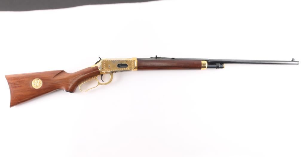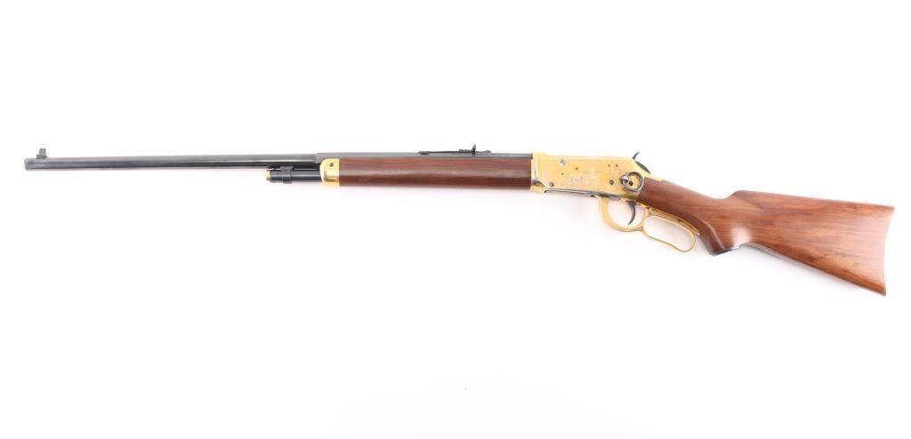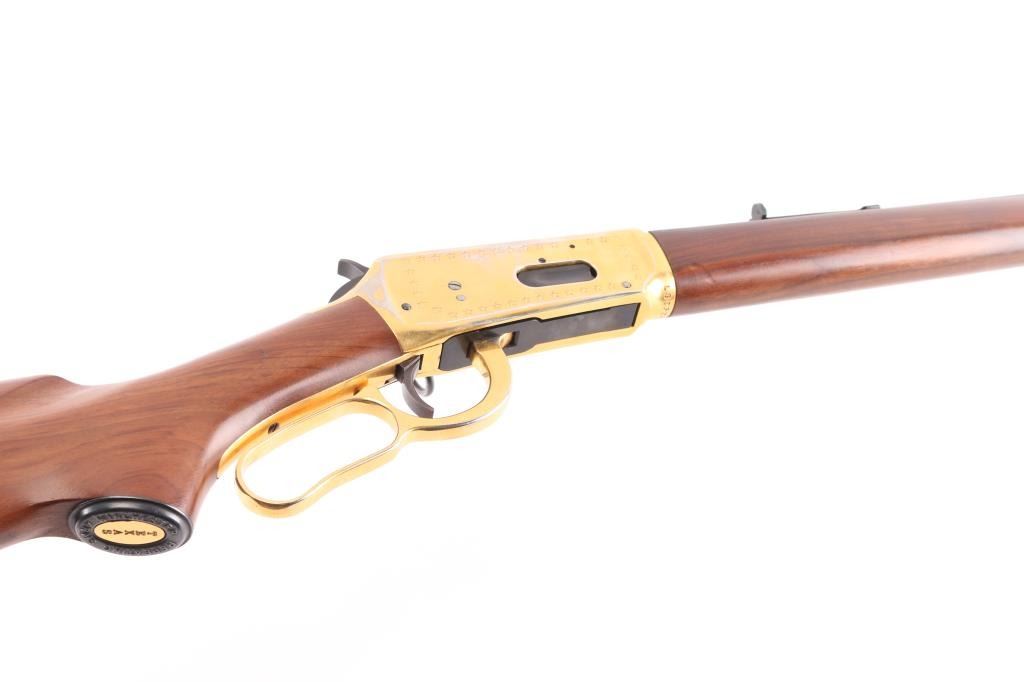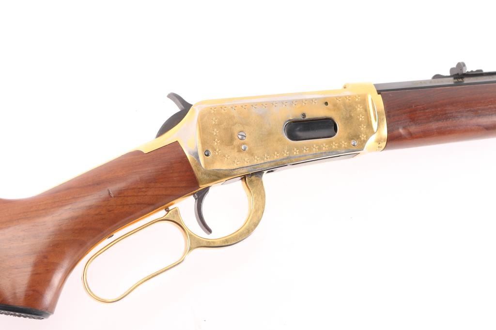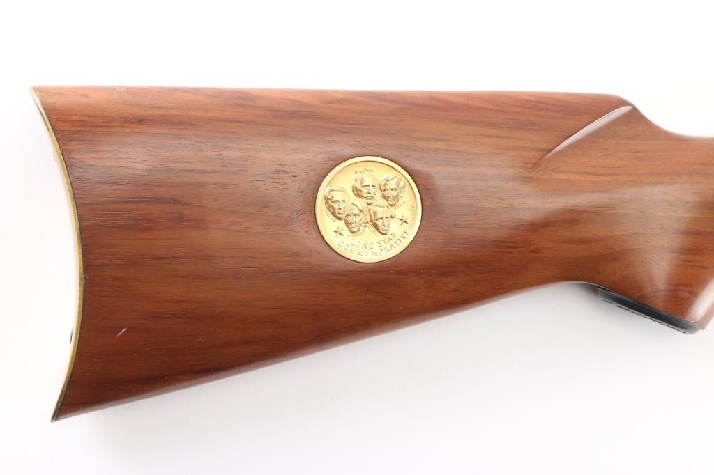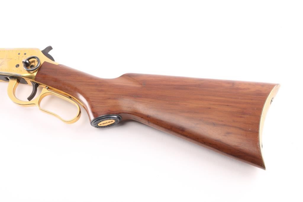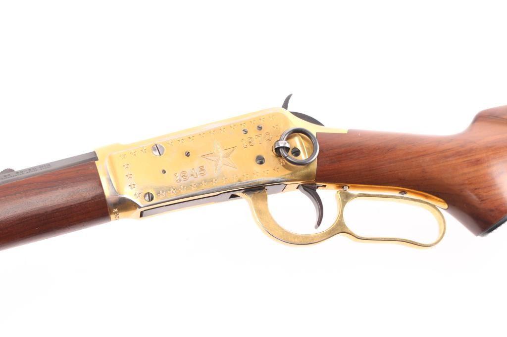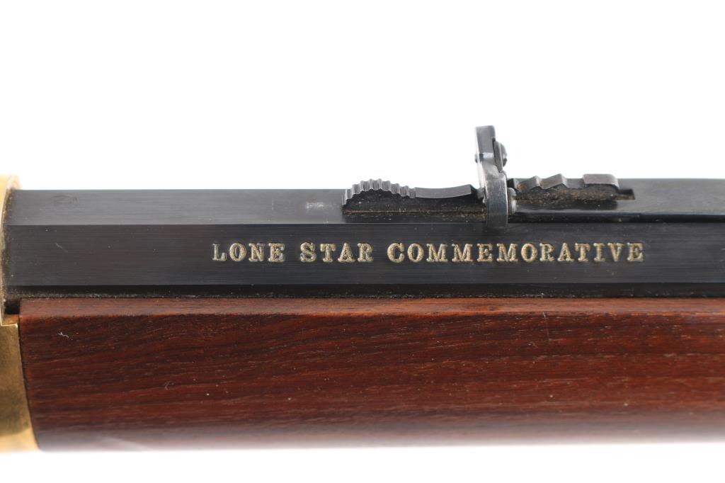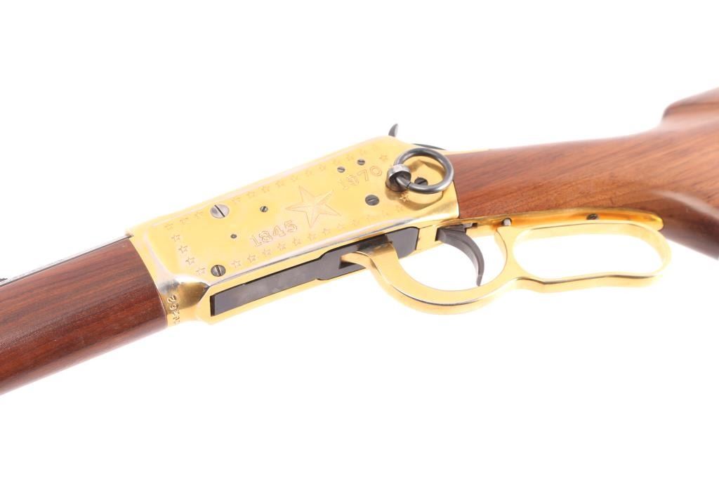Lone Star" commemorative rifle, circa 1970. Blued 26" part octagon bbl, 1/2 length tube magazine, rear sporting sight blade/bead front sight, brass colored receiver & accent pieces, saddle ring, curved lever, smooth wood forend and pistol grip shoulder stock with inlayed commemorative medallion in the right side. The receiver is drilled & taped for a side mount sight. The barrel finish is excellent and the receiver shows handling wear with edge losses. Bore is excellent/bright. Wood stocks are fine.Condition is NRA very Good+. C&R Firearm.