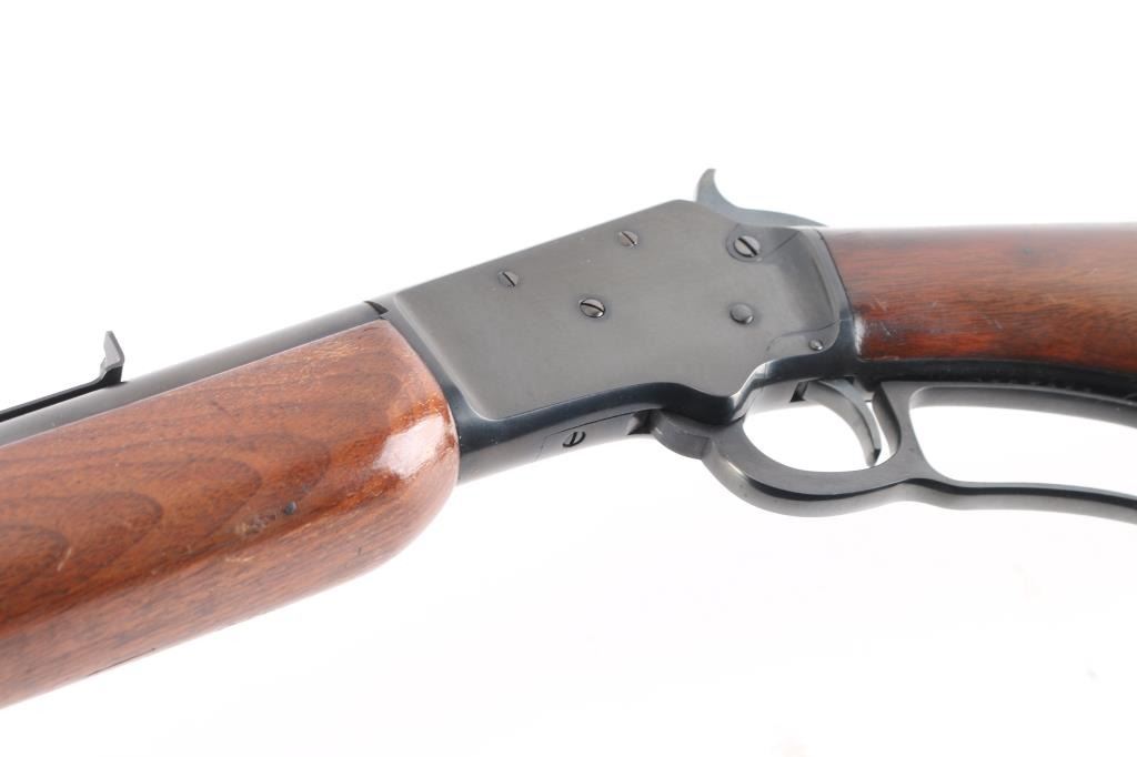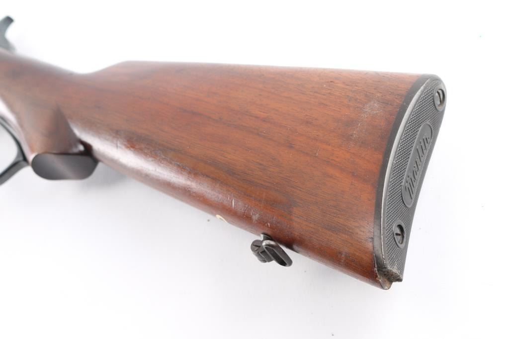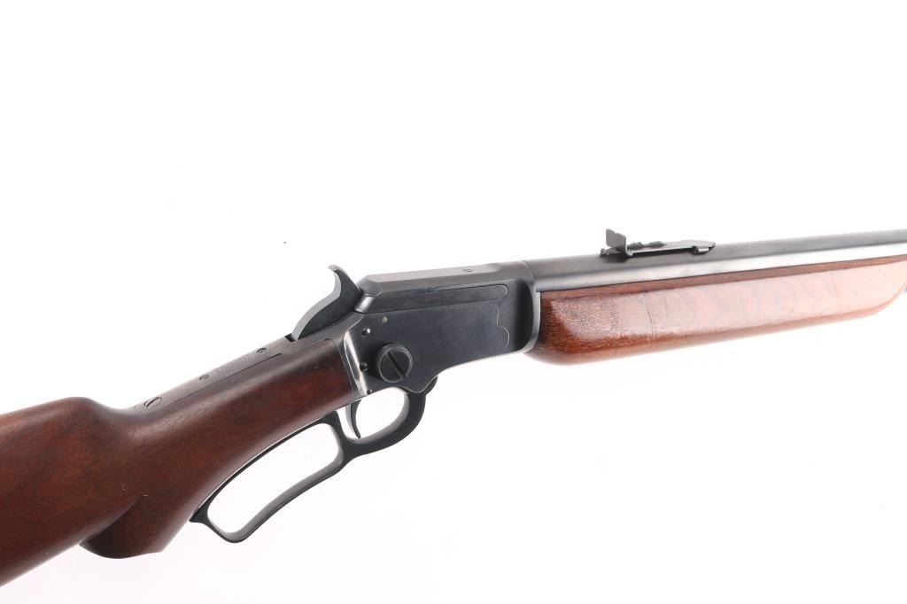 Lever action rimfire rifle manufactured circa 1959. Features reblued finish, smooth walnut forend & curved grip shoulder stock, 24" round barrel, brass bead front sight, sporting rear sight, factory plastic buttplate, steel forend cap. Large take-down screw on right side allows disassembly into two halves for storage or travel. Bore is in good, good rifling, lightly frosted in the grooves. Retains 98% refinish, with edge losses,Wood is very good with few minor blemishes. Barrel markings are feint due to the refinish. Rear sling swivel.Condition is NRA Very Good. C&R firearm.