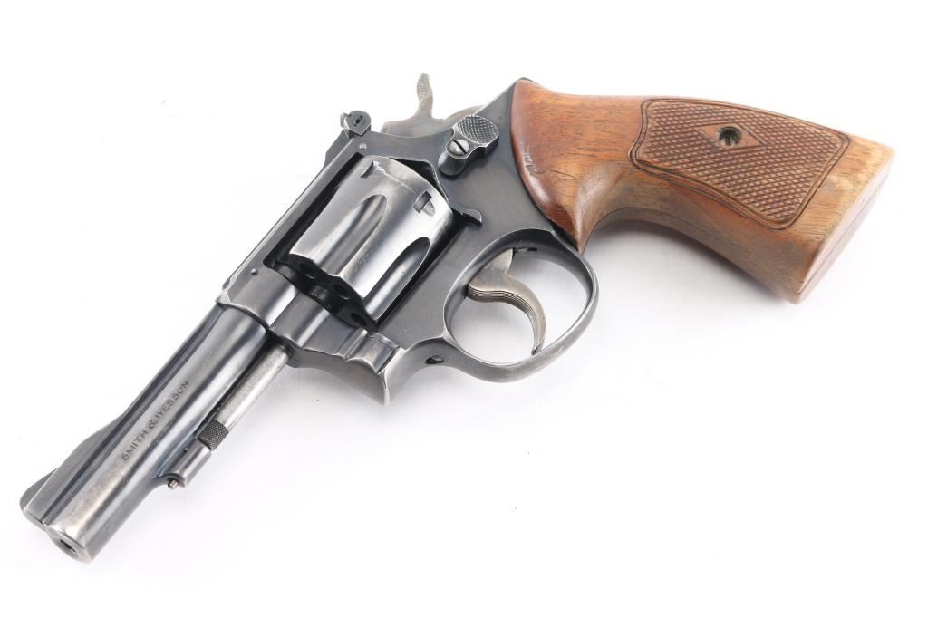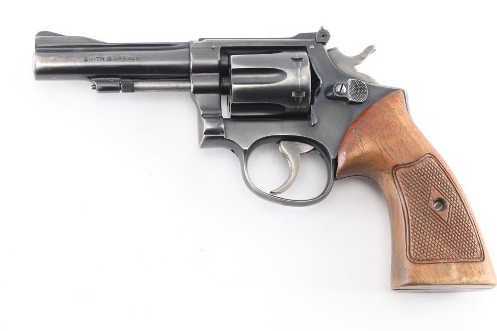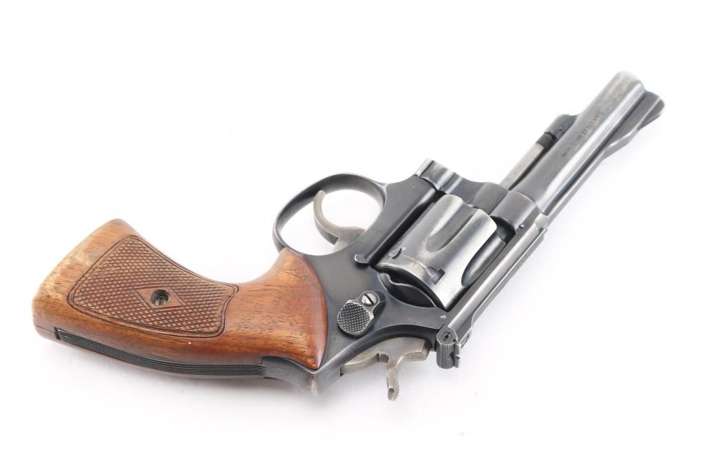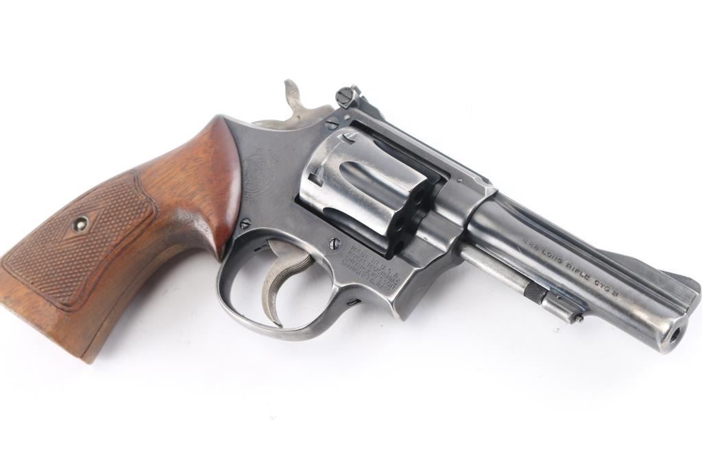 Smith & Wesson K-22 Combat Masterpiece (Pre-Model 18) Double Action Revolver. Built on a square butt K 3 screw target frame. Blued finish, fluted 6 shot counterbored cylinder, checkered wood target style grips, 4" ribbed. pinned barrel, raised ramp front sight, adjustable rear, case colored grooved wide trigger, case colored checkered medium wide spur hammer. Bore is excellent/bright. Retains about 70% finish with holster wear, grips are good/sound with a little wear to the points, some finish loss on the left panel. Action is smooth/tight. Serial number matched on heel, cylinder and barrel. Manufactured 1957. NRA Condition Good.*** C&R Firearm ***