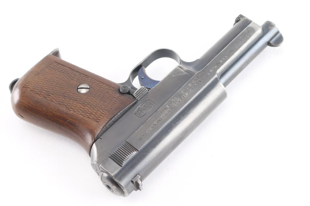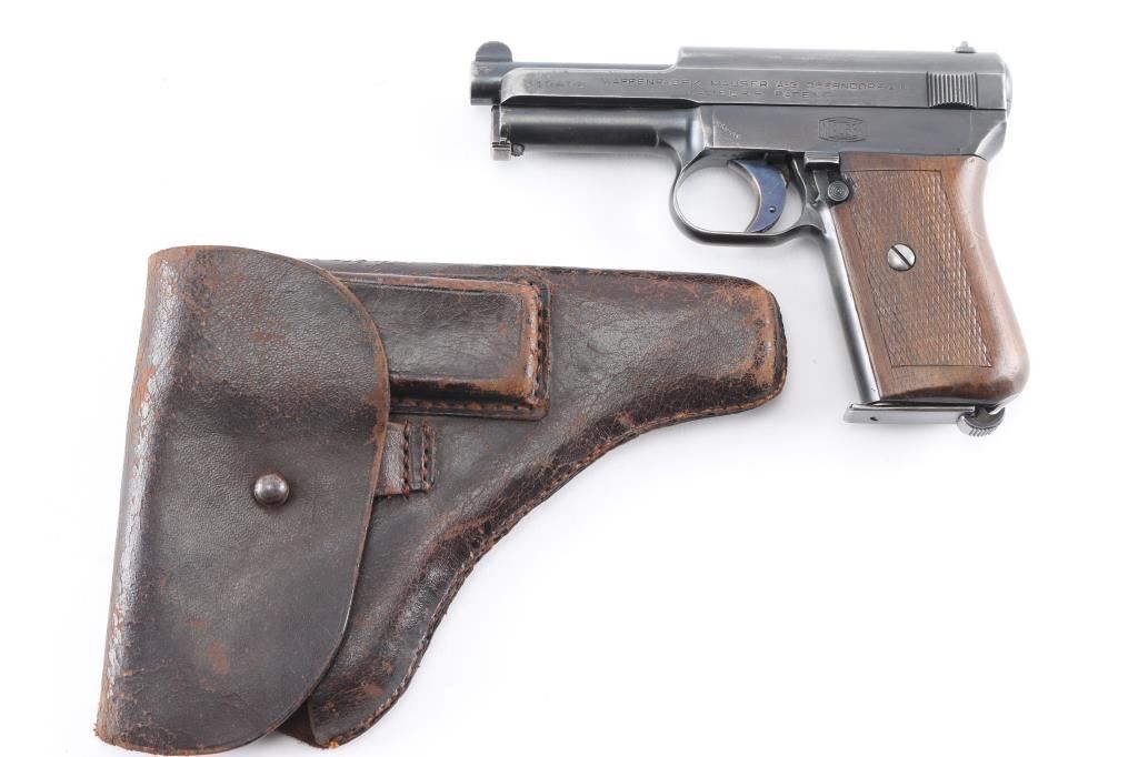 German semiautomatic pistol manufactured during WWI, circa 1914-1918. Features approx 3.25" barrel, fixed sights, single action trigger, manual safety, heel type magazine release, one piece checkered walnut grip. Bore is very good condition, bright with light frosting, strong rifling. Retains about 80% of original blue finish with holster/edge wear, mostly on the slide. Markings are typically crisp and even, matching serial number on frame and slide, grips are near excellent with a couple of very minor dings. No import marks observed. Left frame stamped "Germany". Includes a brown leather military/police style holster, with mag slot and one original magazine. Condition is NRA Very Good. C&R firearm.