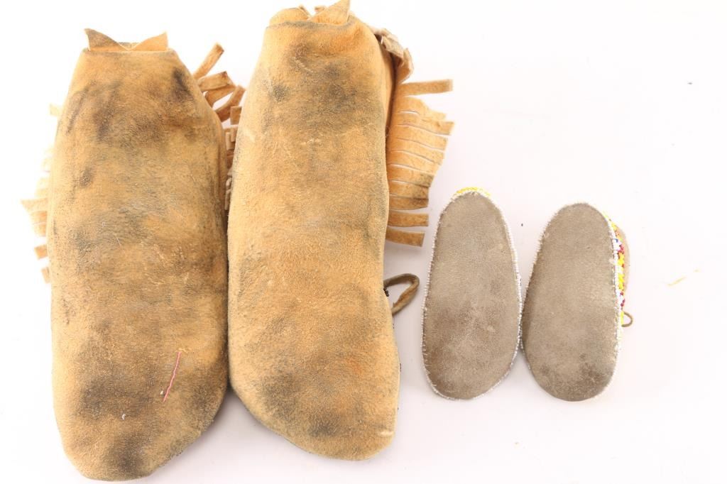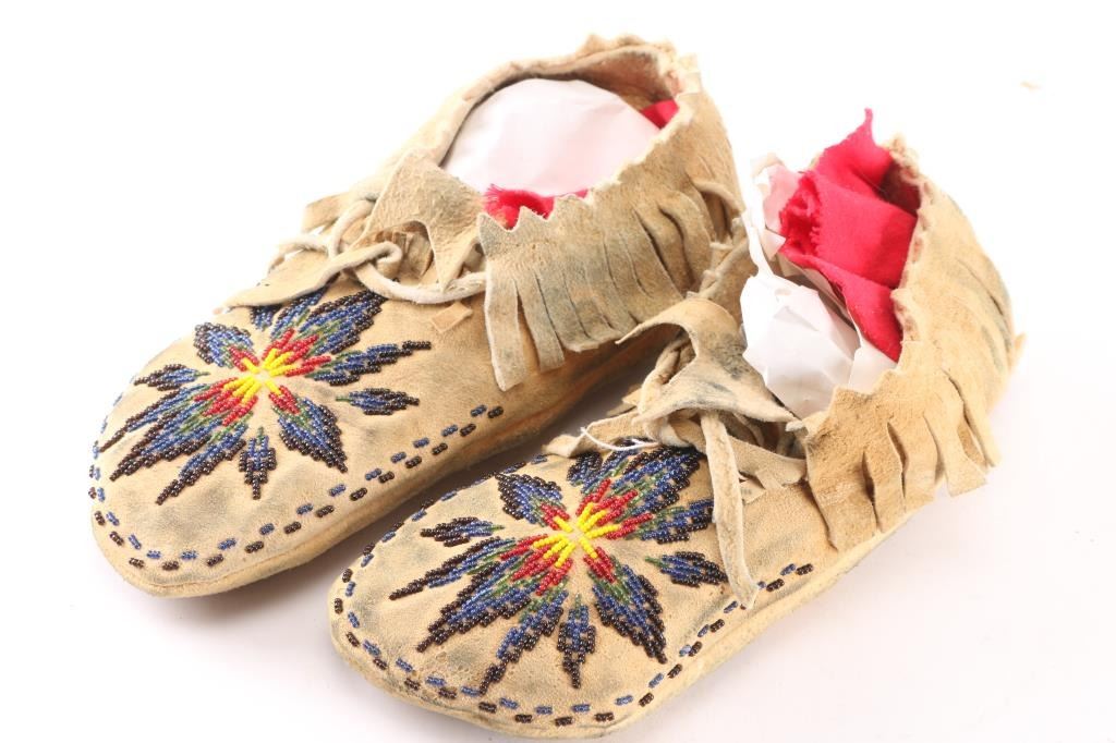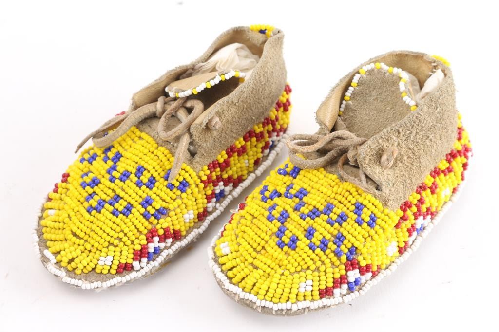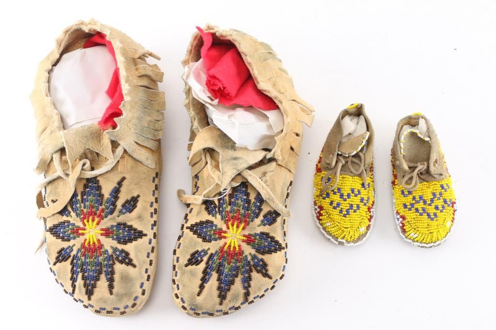 (1) Pair of womens moccasins with star burst design on toes; and (1) pair of childs moccasins with yellow background, fully beaded.