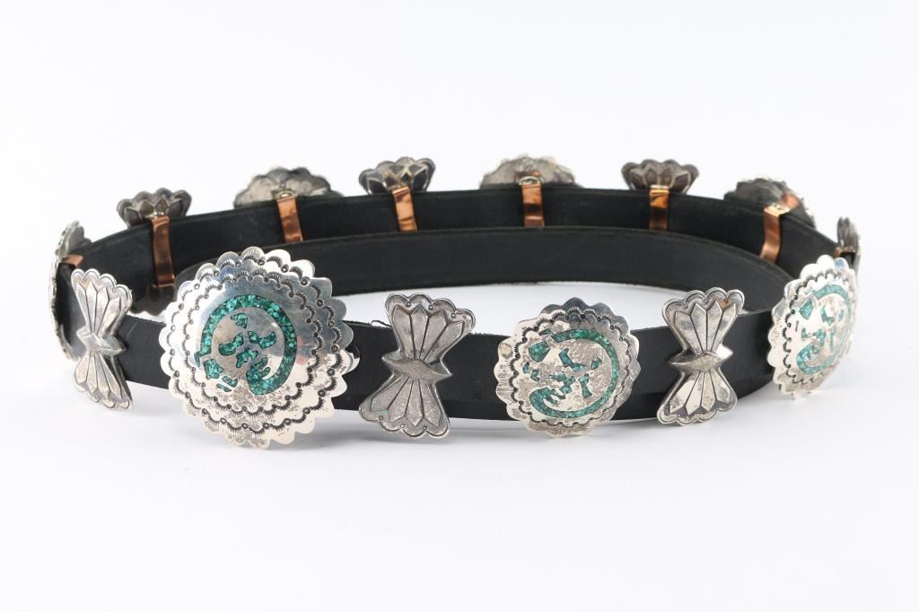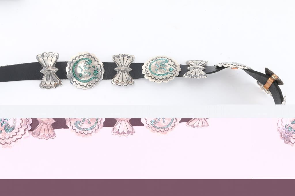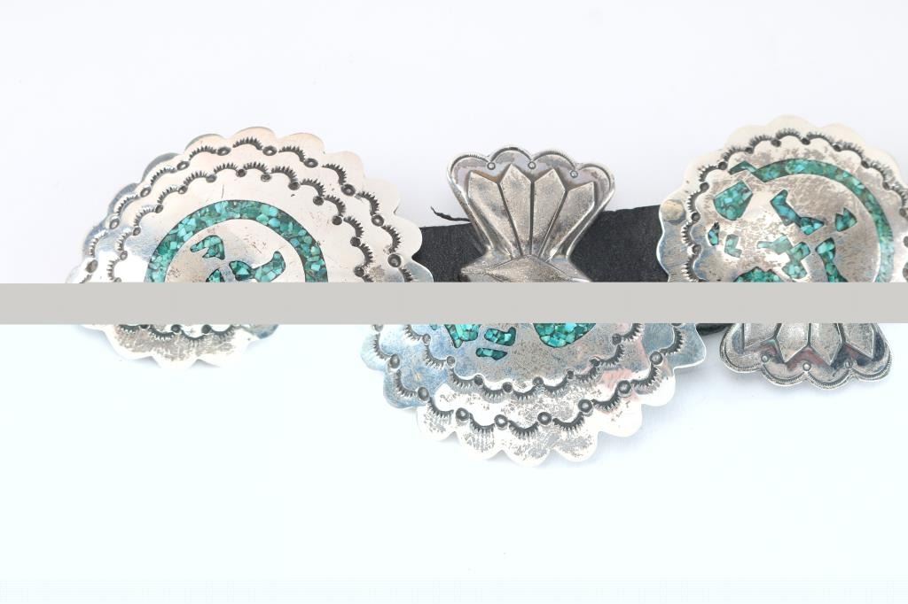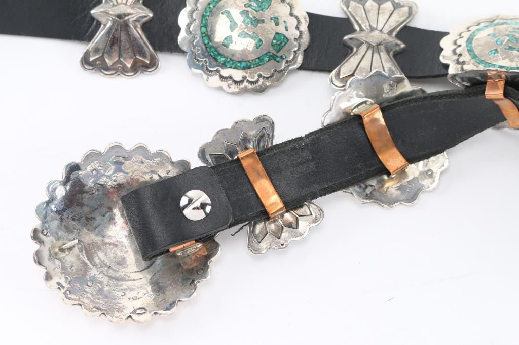 Silver plated over copper with 7 bow design and 6 turquoise inlaid conchos and belt buckle on black leather. 14 conchos. Can be sized to fit; length is 58".