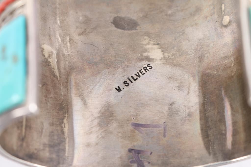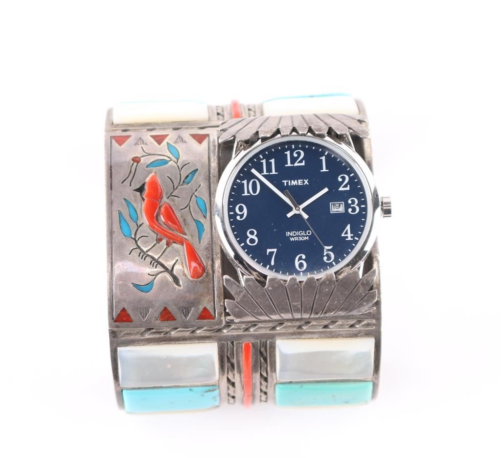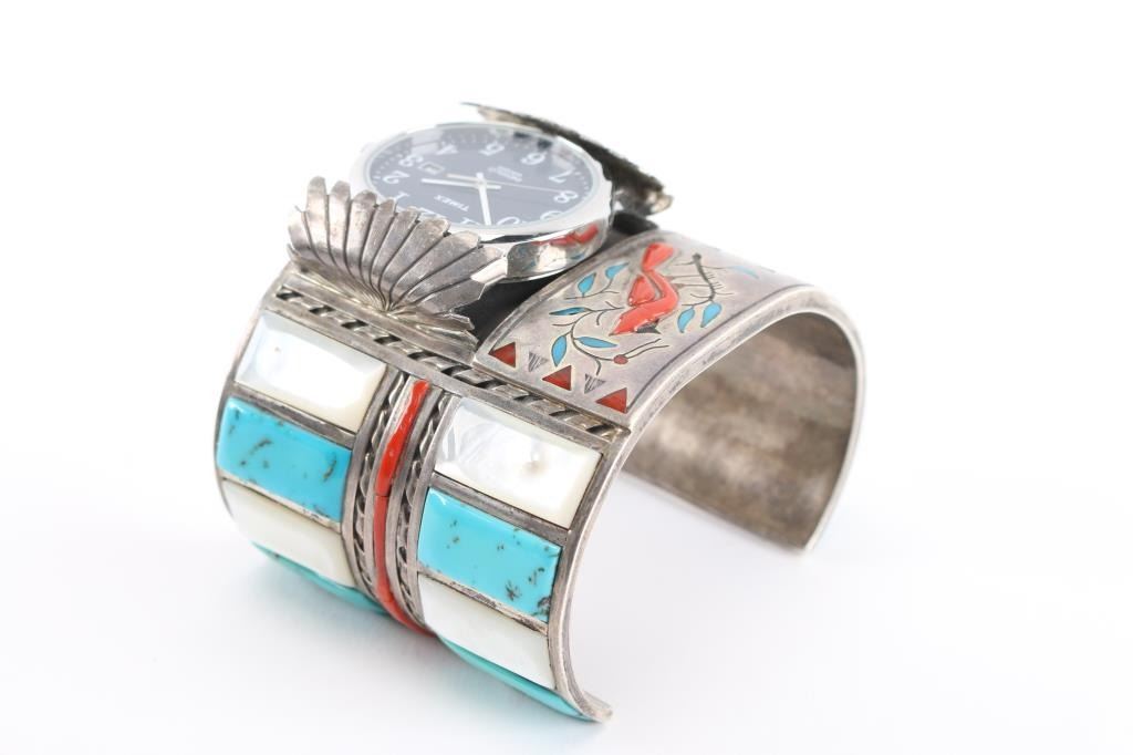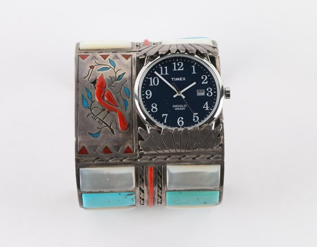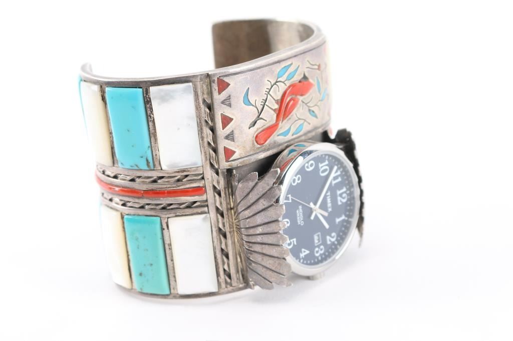 Large turquoise and mother of pearl inlay art piece cuff measuring 9" including gap, with Timex working watch piece and bird design in center, signed W. Silvers.