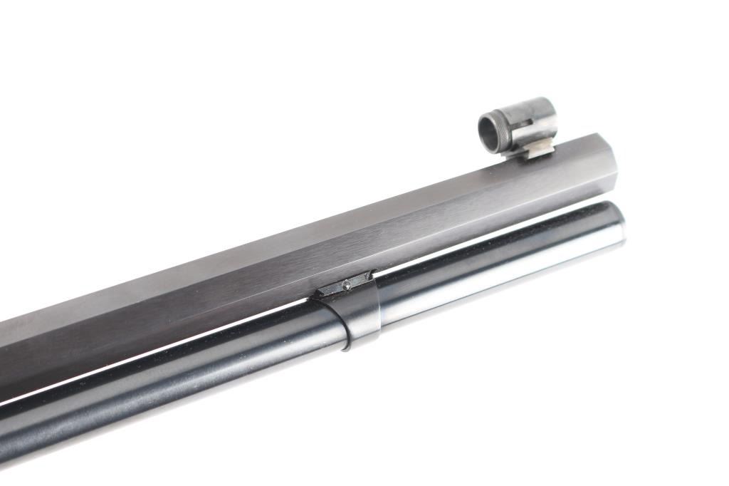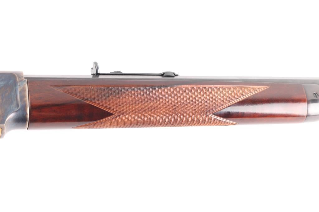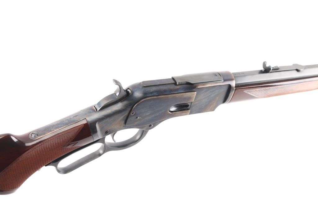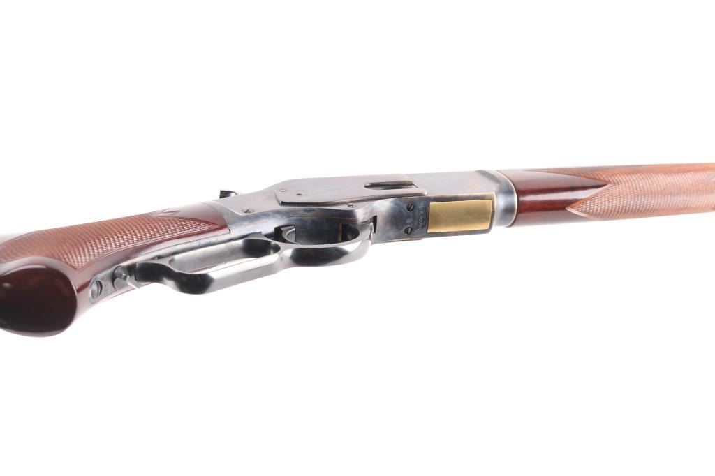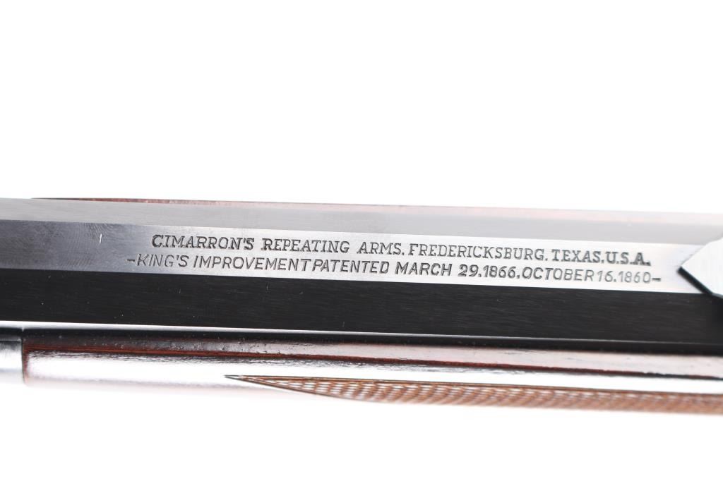 Sn: 58630. Made in Italy by Uberti for Cimarron Firearms. 24" octagonal barrel with globe/post front and adjustable rear sporting sights, full lenght tube magazine, 12 rd capacity. High polish blue finish with case colored receiver. High gloss wood stocks with fine checkering at the wrist and forearm, blued steel buttplate. Brass lifter, grip safety, lever lock. Blued hammer has polished sides. Bore is pristine, wood and metal finishes are excellent. Rifle is in like new condition.NRA Condition-Near Perfect. Modern Firearm.