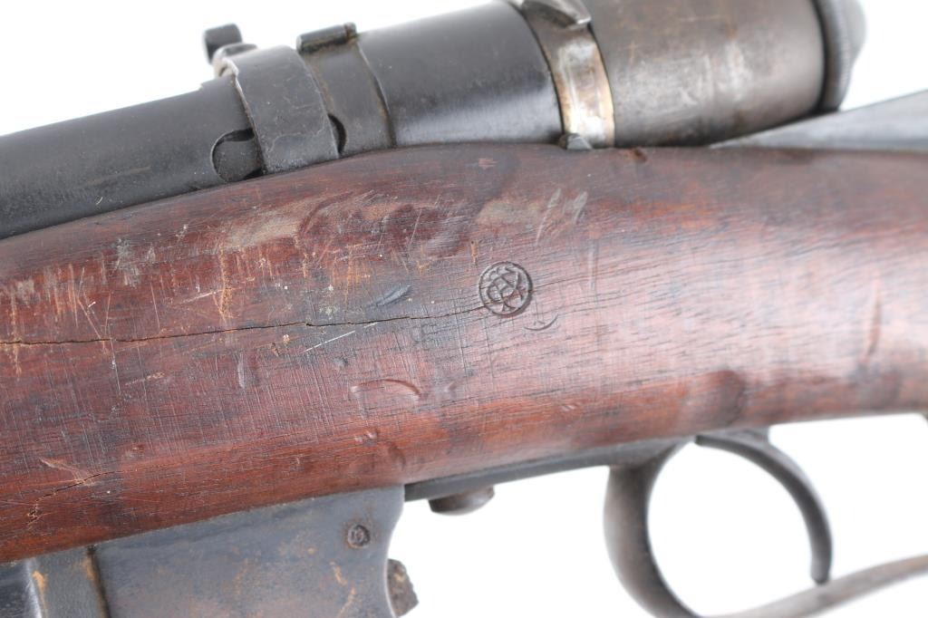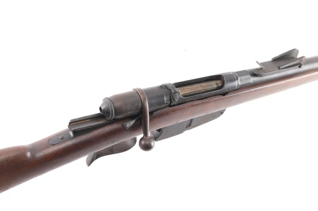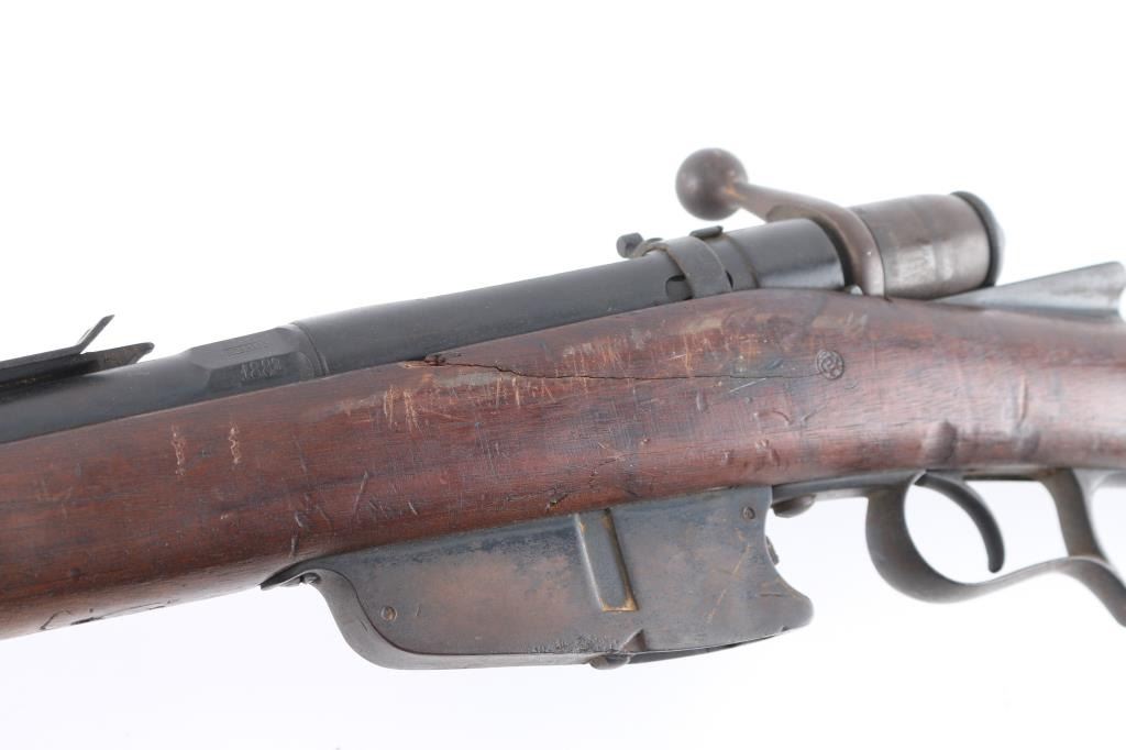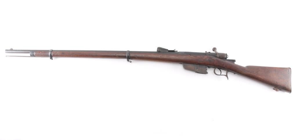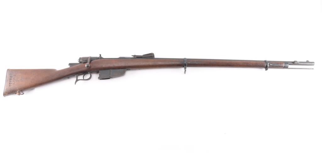 **NOTE** This rifle is missing the firing pin/spring. Italian WW1 Vetterli Infantry rifle. Originally made for an 10.4mm black powder cartridge, converted during WWI to 6.5mm Carcano, with a Carcano feed system installed. Dated 1882. Features blued finish, 33.5" barrel ,blade front & adjustable rear sights, sling swivels, cleaning rod, bayonet lug. Serial number matched on stock and chamber, Italian proofs, cartouches on stock. Dull blue finish with scattered patina, bore is fair to good, dark with strong rifling, wood is overall good/sound with a couple of hairline cracks. NRA Condition-Fair/Firing Pin. Antique Firearm.