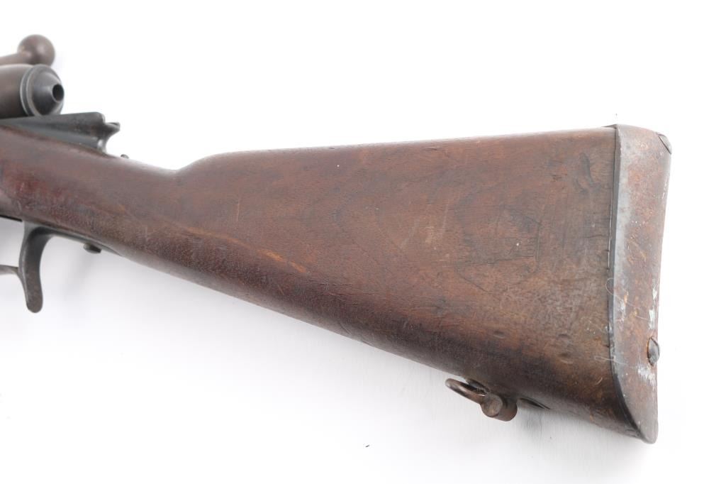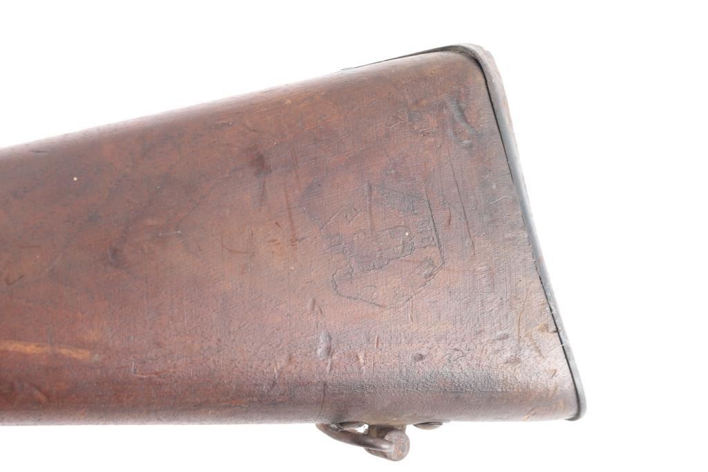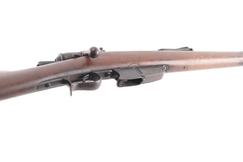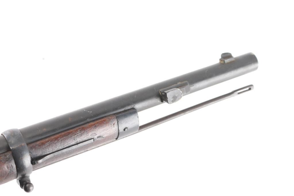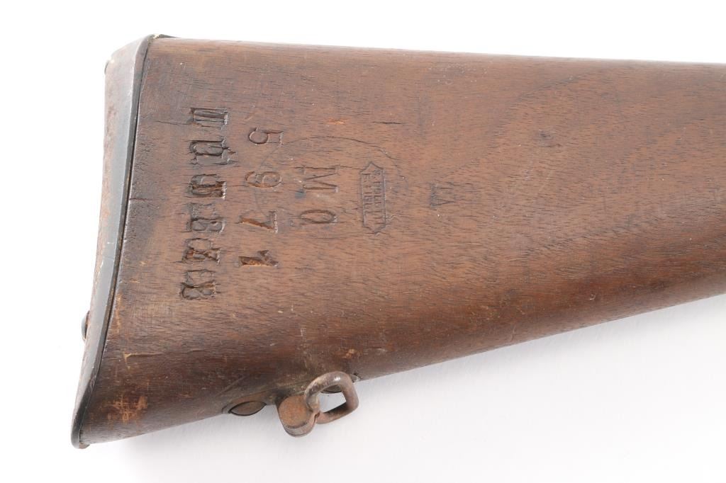 **NOTE** This rifle is missing the firing pin/spring. Italian WW1 Vetterli Infantry rifle. Originally made for an 10.4mm black powder cartridge, converted during WWI to 6.5mm Carcano, with a Carcano feed system installed. Dated 1882. Features blued finish, 33.5" barrel ,blade front & adjustable rear sights, sling swivels, cleaning rod, bayonet lug. Serial number matched on stock and chamber, Italian proofs, cartouches on stock. Dull blue finish with scattered patina, bore is fair to good, dark with strong rifling, wood is overall good/sound with a couple of hairline cracks. NRA Condition-Fair/Firing Pin. Antique Firearm.