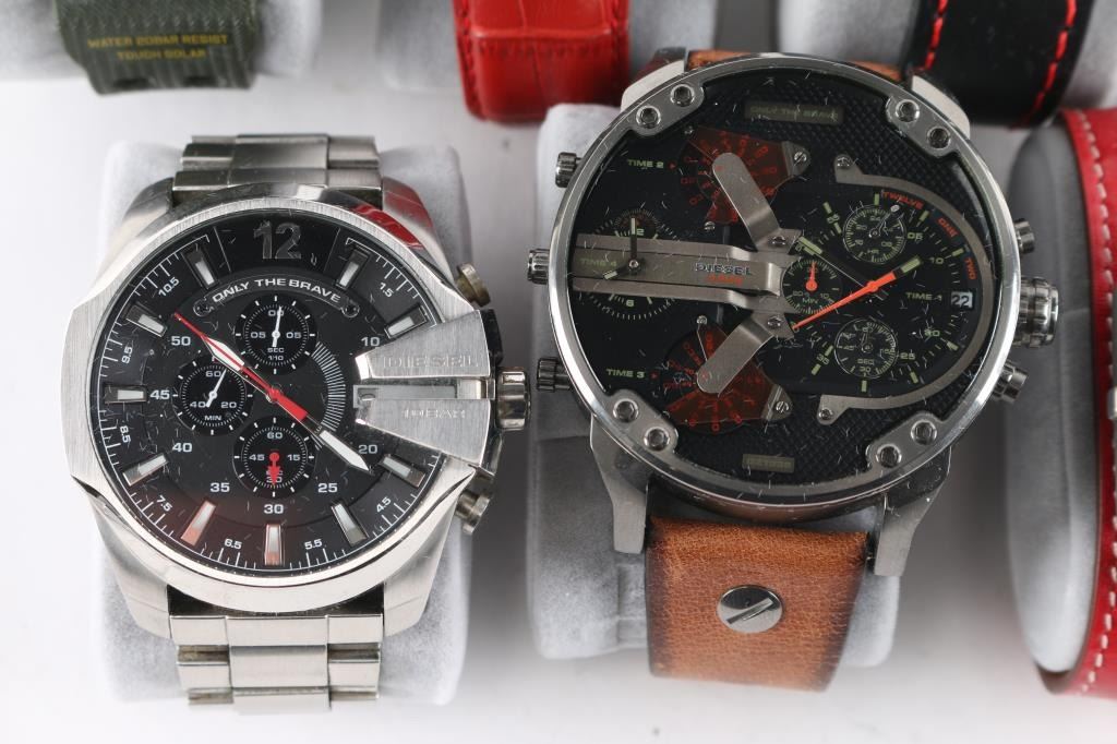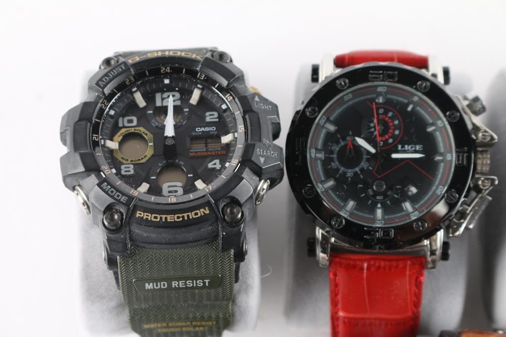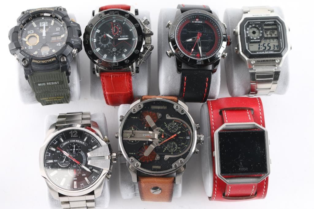 Includes: Casio Illuminator; Diesel Stainless Chronograph DZ4308; Naviforce; G-Shock Mudmaster; Diesel Stainless Chronograph DZ7332; Lige Chronograph; Fitbit.