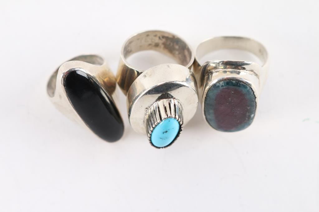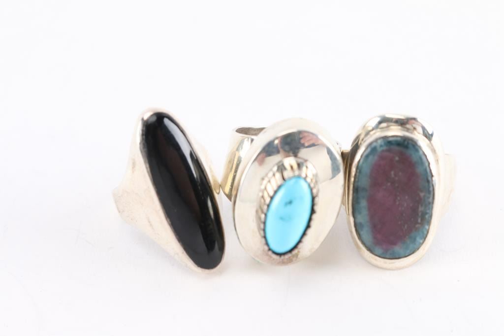 (1) Oval stone of onyx set in sterling, size 6. (1) Oval turquoise stone set in sterling, maker marked, size 6 1/2. (1) Watermelon tourmaline in sterling silver, size 7.