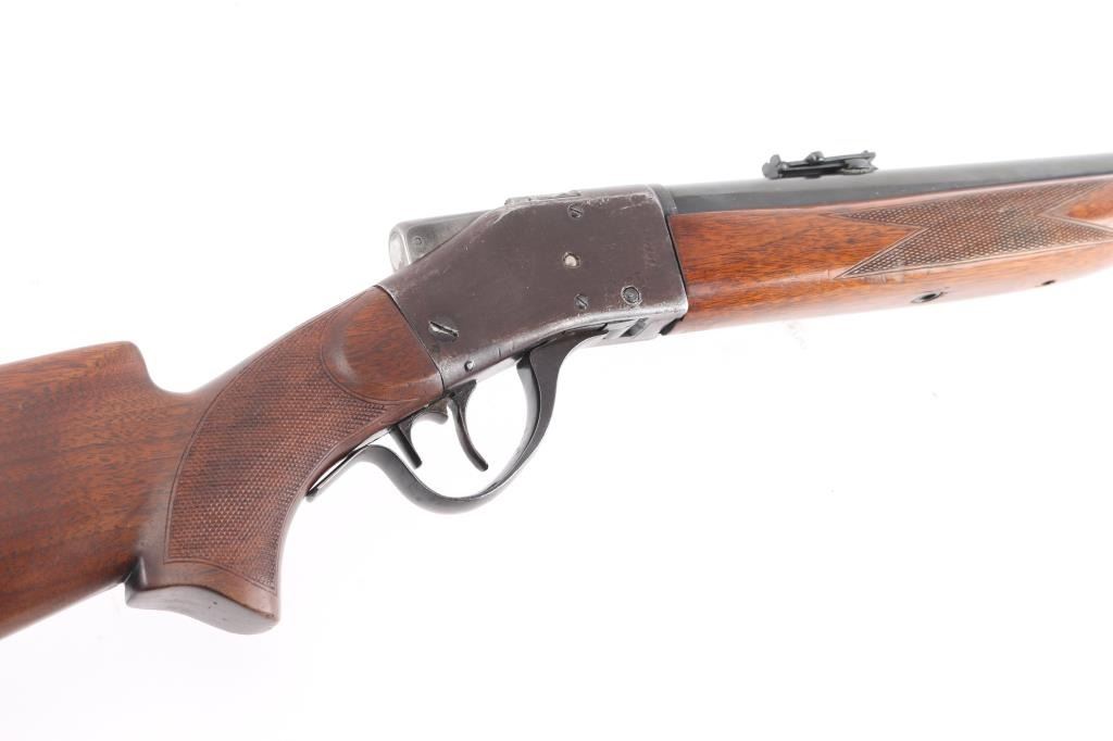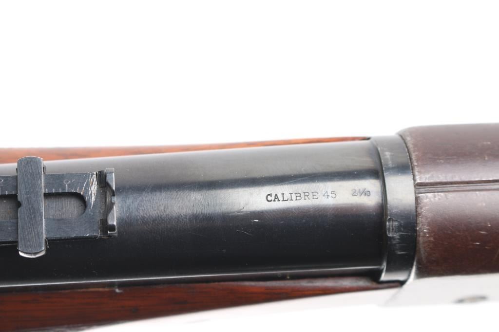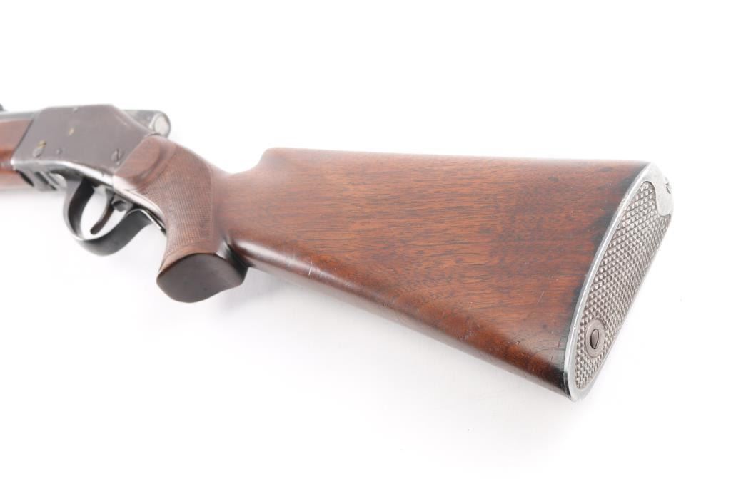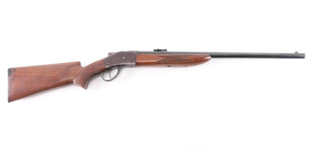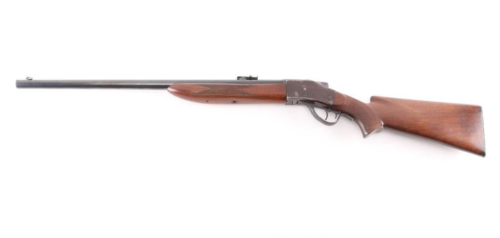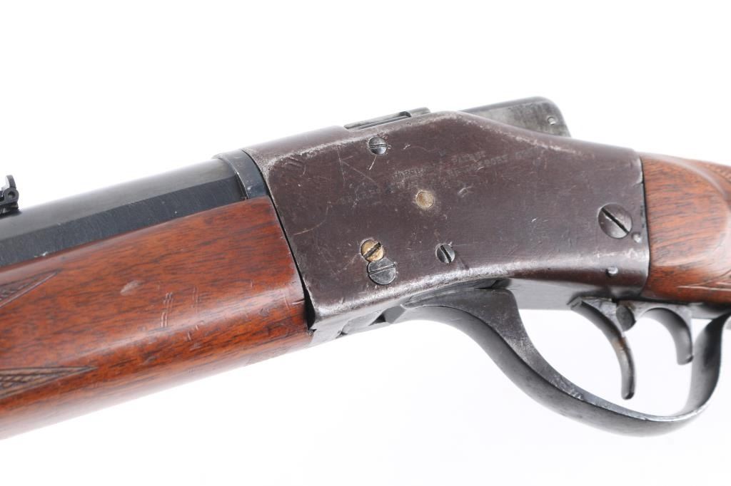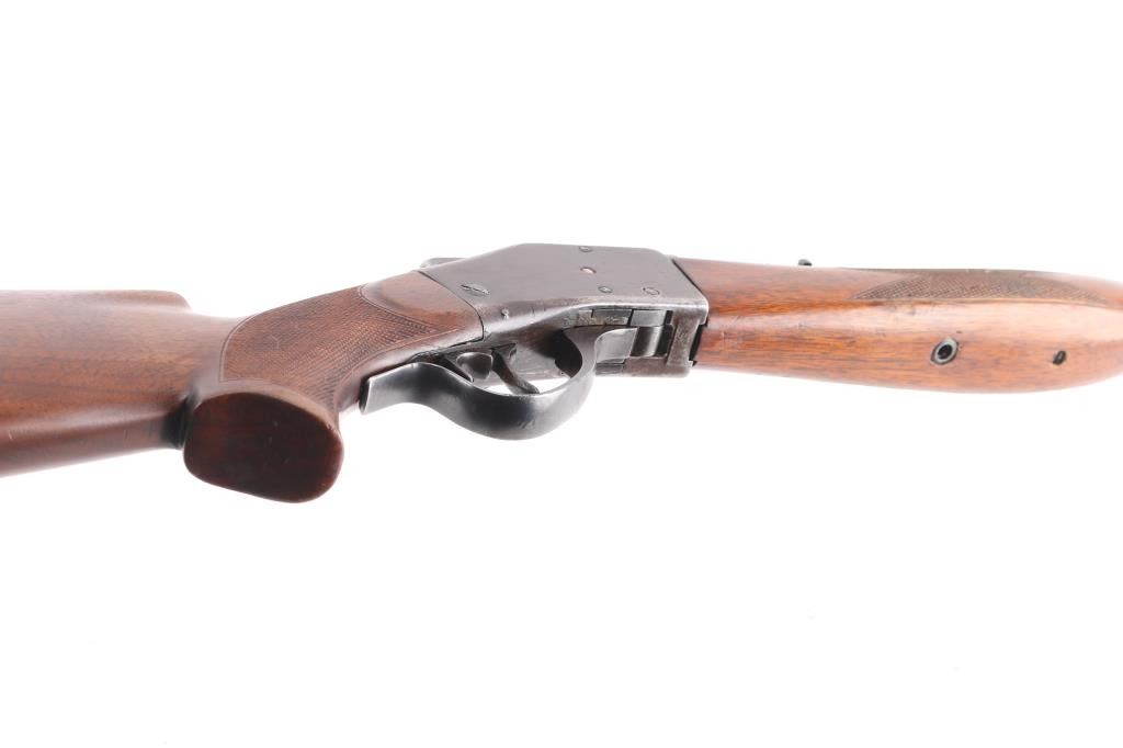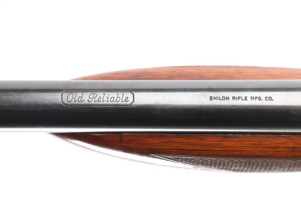 The 1878 is a single-shot hammerless falling-block action rifle designed by Hugo Borchardt and made by the Sharps Rifle Manufacturing Company. (1878-1881) It closely resembles older Sharps Rifles but has a firing mechanism that uses a hammerless striker rather than a hammer and firing pin like the old Sharps Rifle. This rifle is upgraded with new stocks & rebarreled with a 24" Shiloh Rifle Co. Old Reliable; barrel in 45 2 1/10 (45-70) Flip circle post/bead front & ladder rear sights. smooth trigger, manual safety dehind the trigger, checkered beaver tail forearm, high comb, pistol grip, shoulder stock with checkered panels at wrist, checkered steel buttplate. Double set triggers. Bore is very good/bright, blue barrel looks great with minor muzzle wear, original receiver has turned a brown patina with handling/edge wear, stocks are very good.NRA Condition-Fair/Replaced Barrel. Antique Firearm.