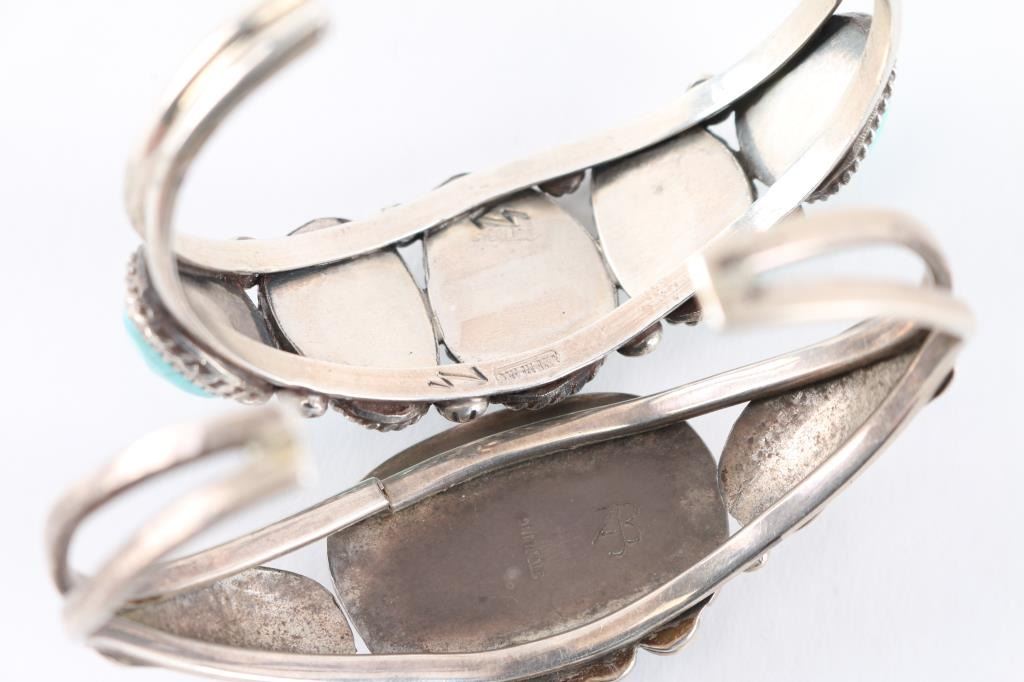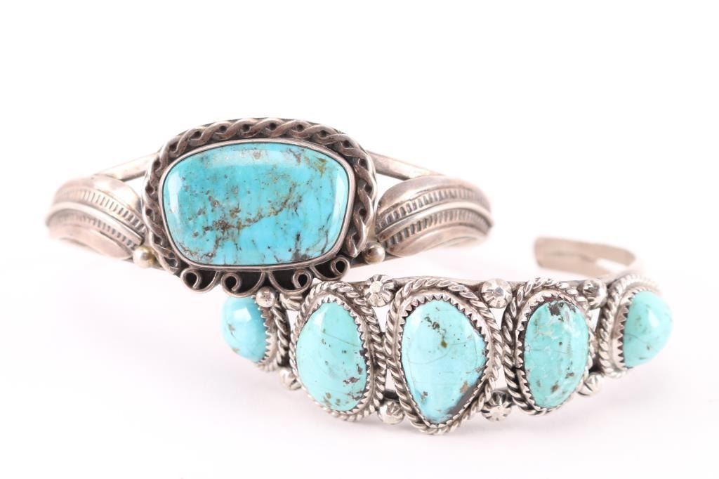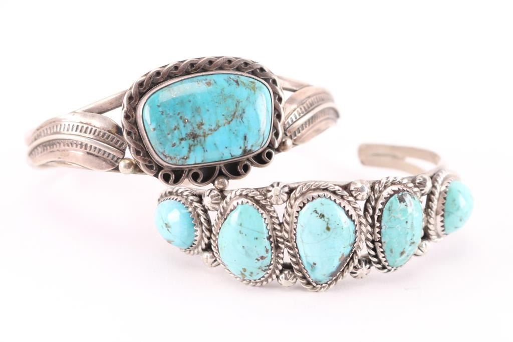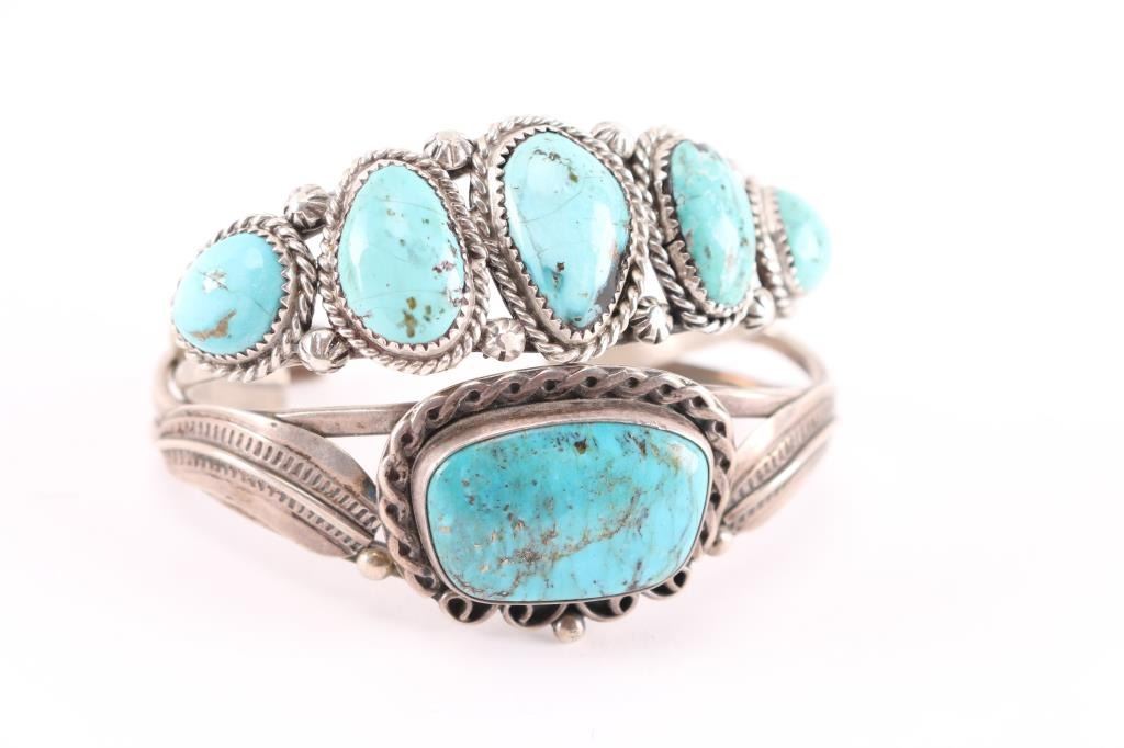 (1) Large rectangle turquoise stone in center measuring 1 1/4" by 3/4", maker marked, cuff measures 8" including gap. (1) Nice sky blue turquoise, 5 stones, maker marked, measures 7 3/4" including gap.