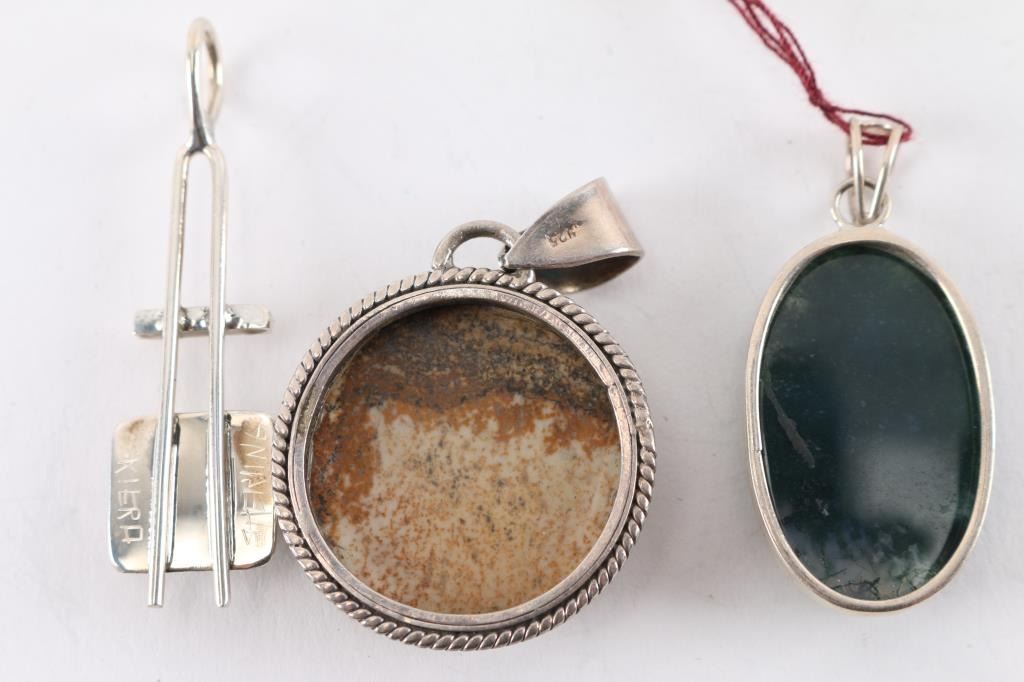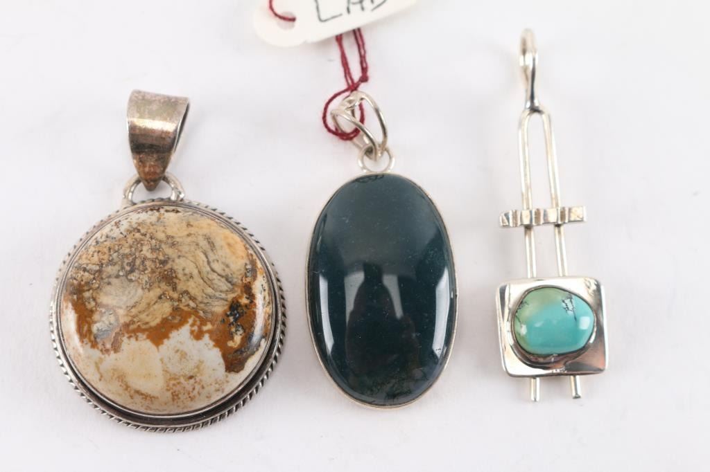 (1) Round jasper stone in sterling silver setting, measures 1 1/2". (1) Oval dark green "lab" in sterling silver setting, measures 1 1/2". Charles Skiera sterling pendant featuring turquoise stone, maker marked, measures 2".
