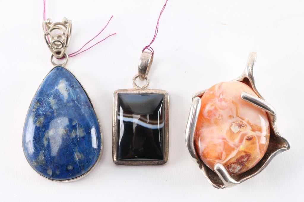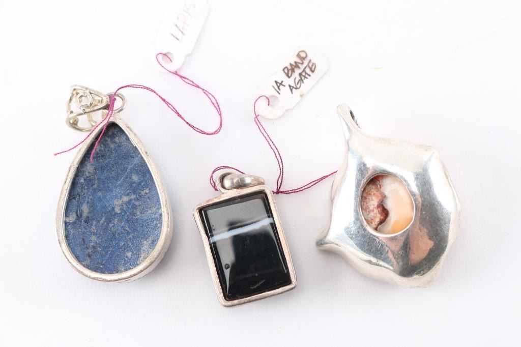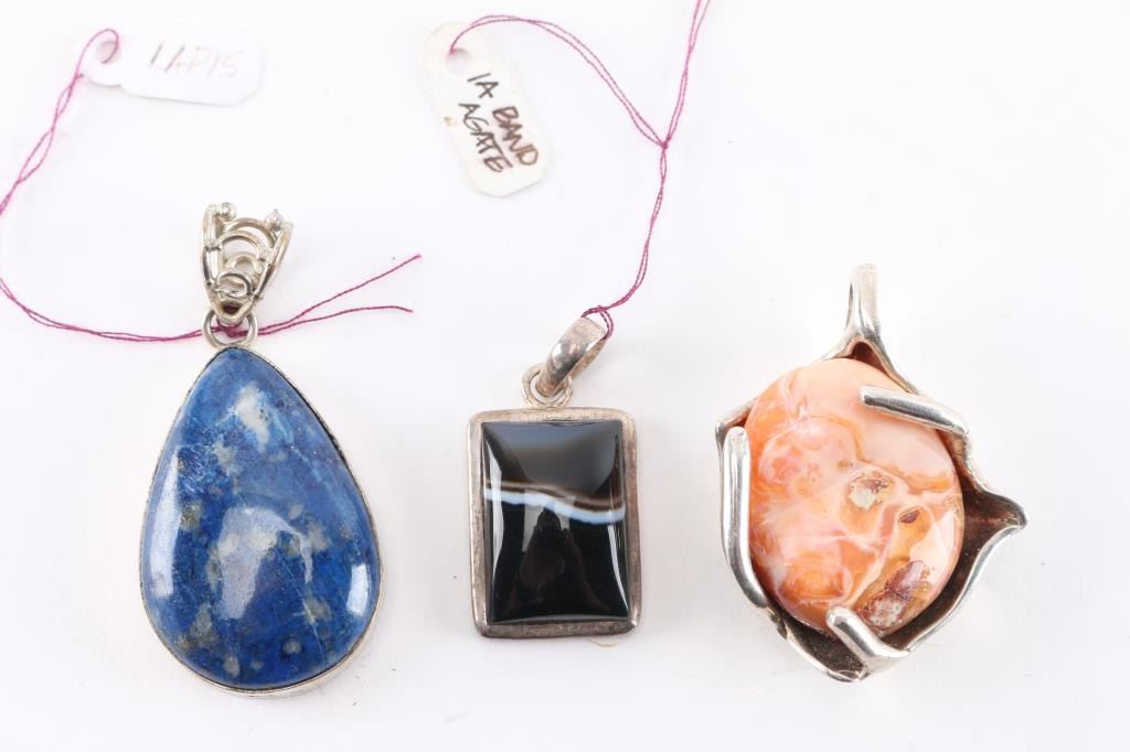(1) Large lapis tear drop in sterling silver, measures 2". (1) Large polished pink jasper stone set in thick silver freeform setting, measures 1 3/4". (1) Rectangle band agate in silver setting measures 1 1/2".