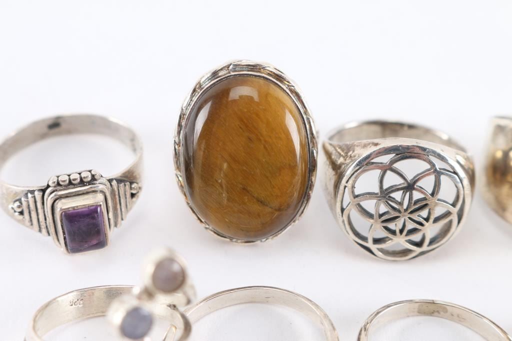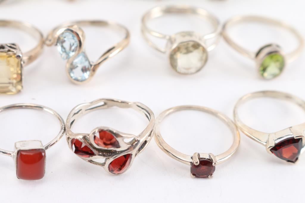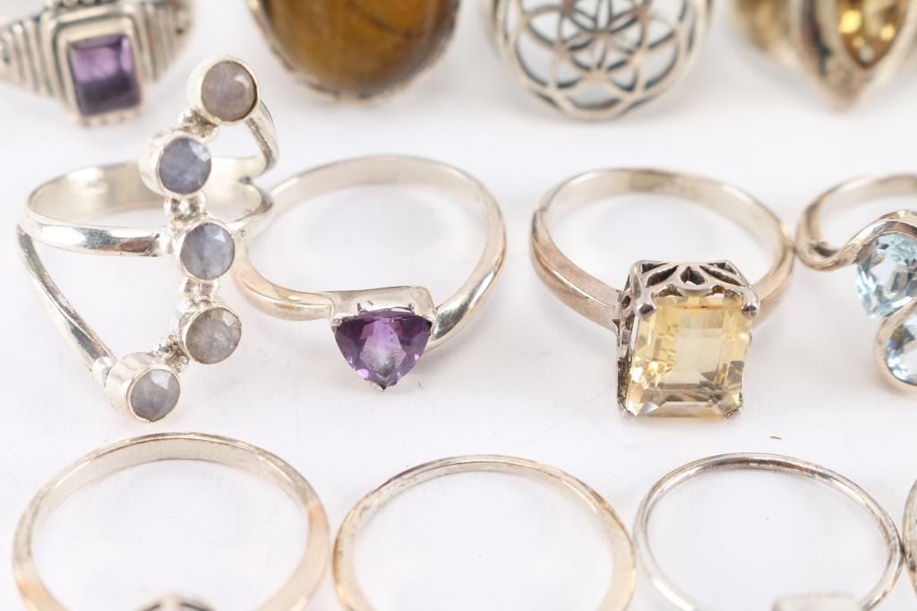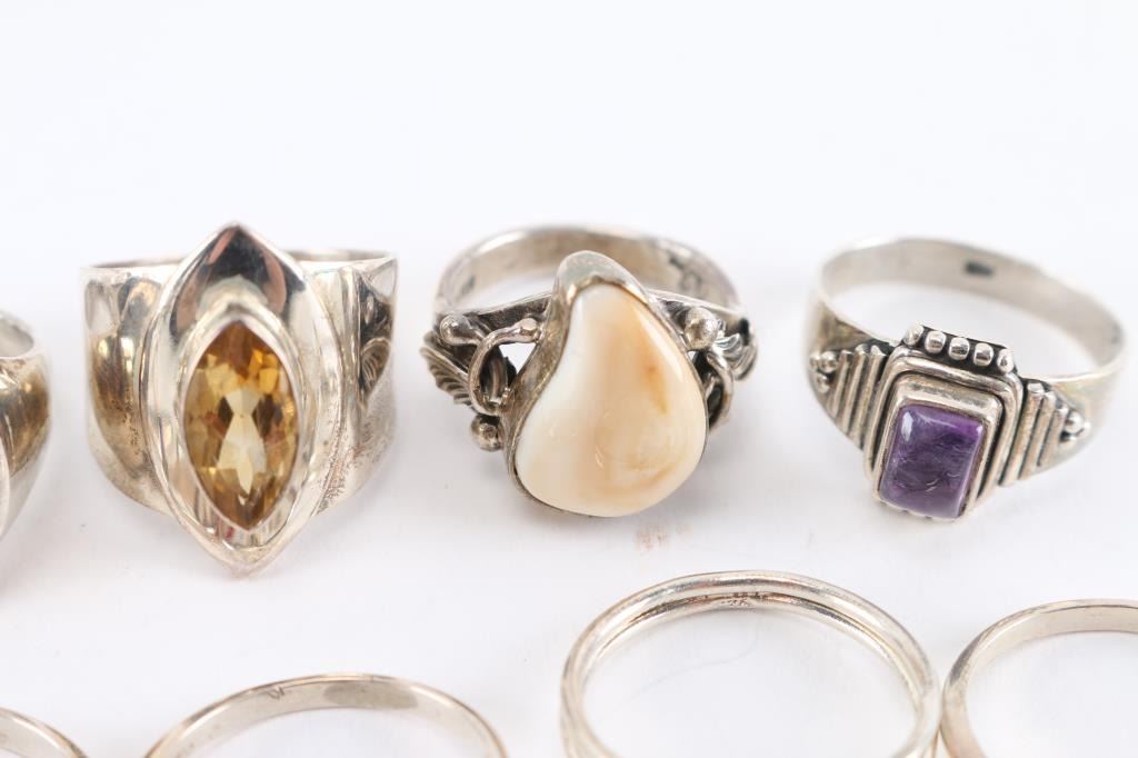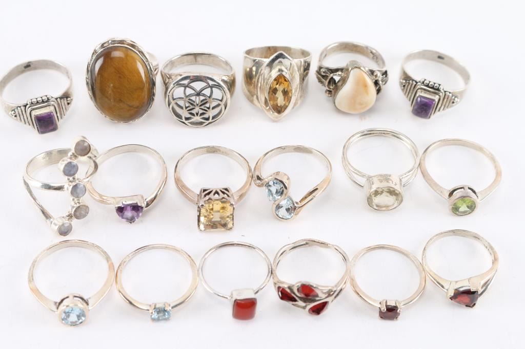 Approximately 18, mostly sterling silver, most have gemstone in setting. Various sizes.