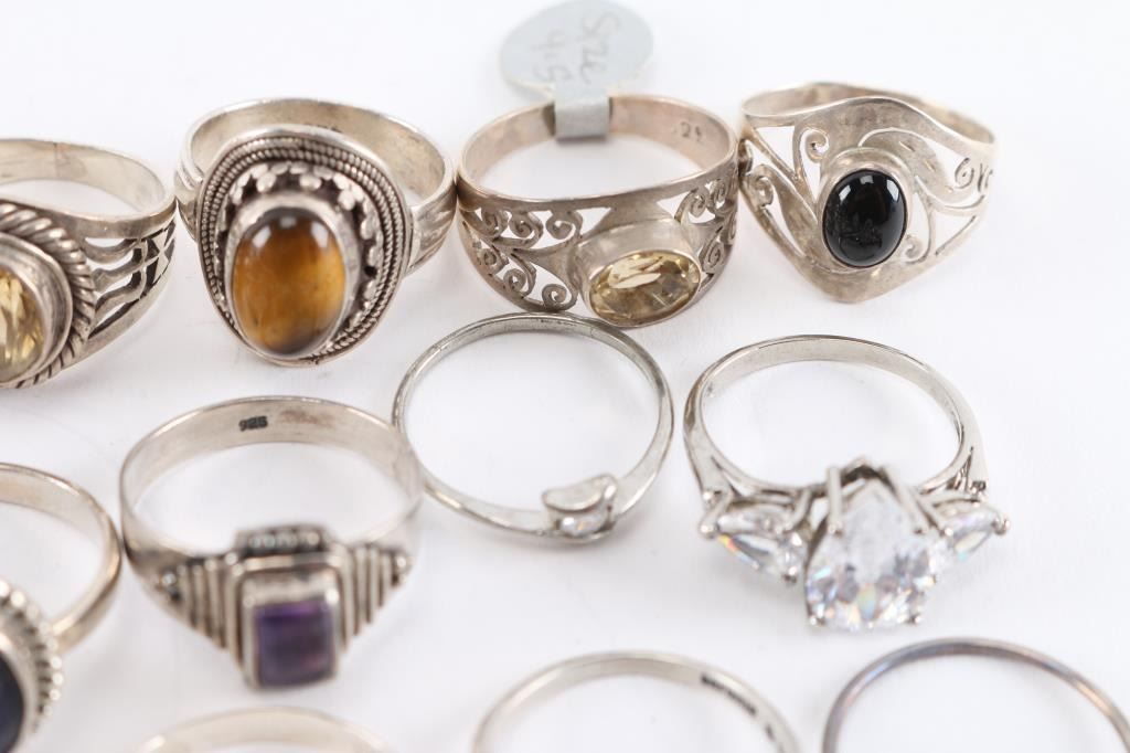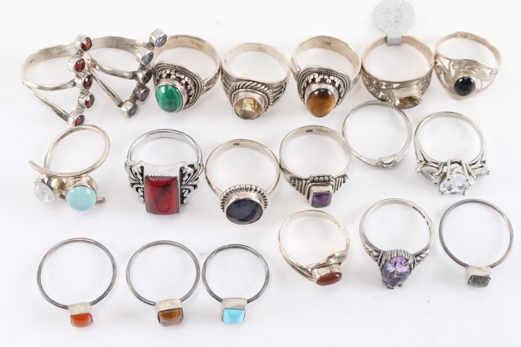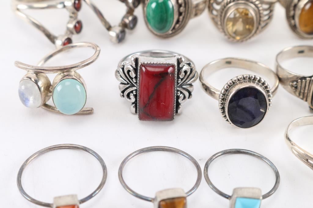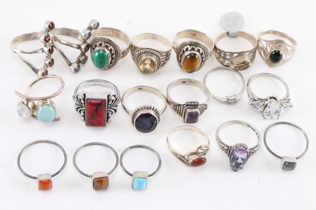 Approximately 18, mostly sterling silver, most have gemstone in setting. Various sizes.