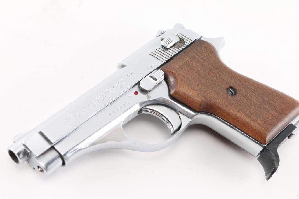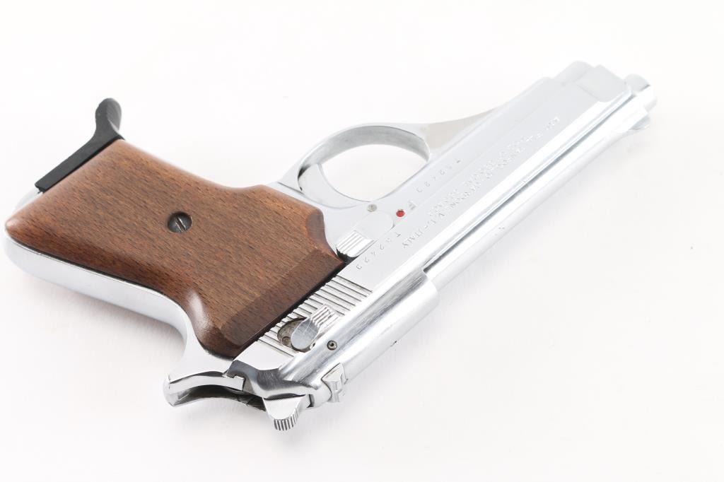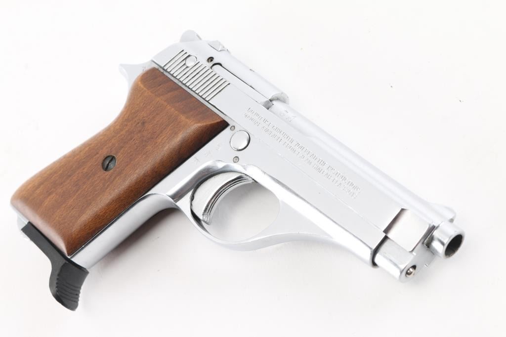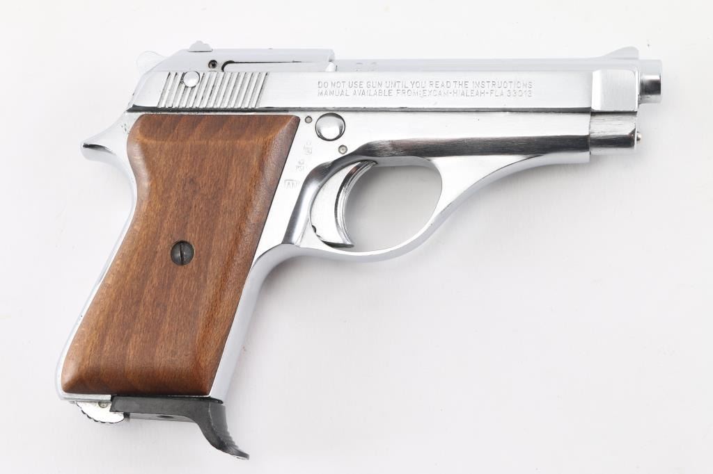 Italian semiautomatic pistol imported by Excam of Hialeah FL. Date code 1998. Features nickel finished metal, smooth wood grips, slide and frame mounted manual safeties, magazine safety, single action trigger, 3.75" barrel, fixed sights. Slide locks open on an empty magazine, returns forward when the empty mag is removed. Bore is very good condition. Finish is near excellent with few blemishes, has a similar look to stainless steel. Grips are very good, left panel a bit loose on frame. Includes one magazine.Condition is near NRA Excellent*** Modern Firearm ***