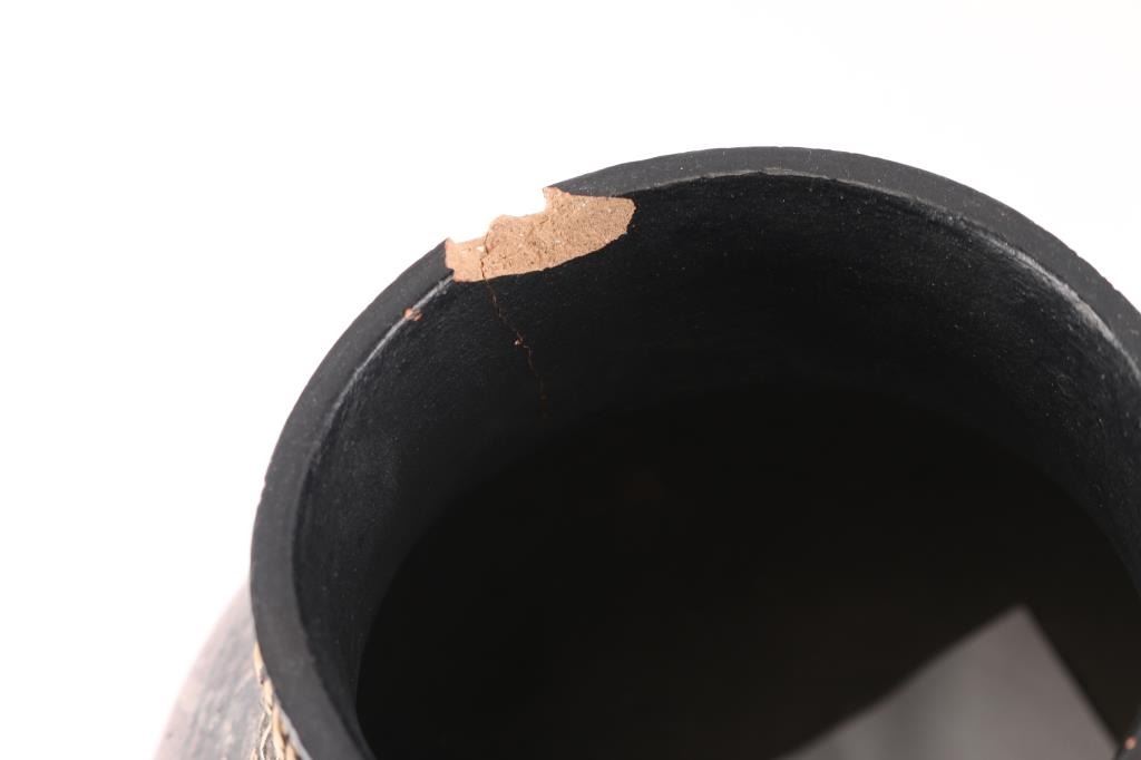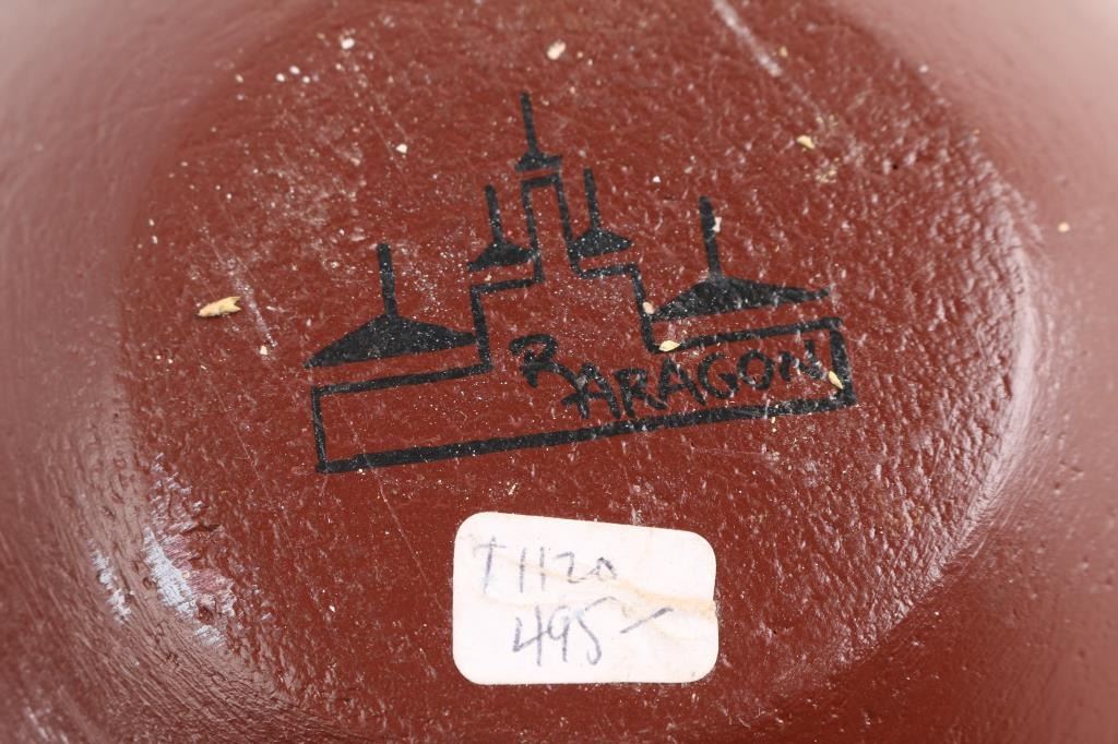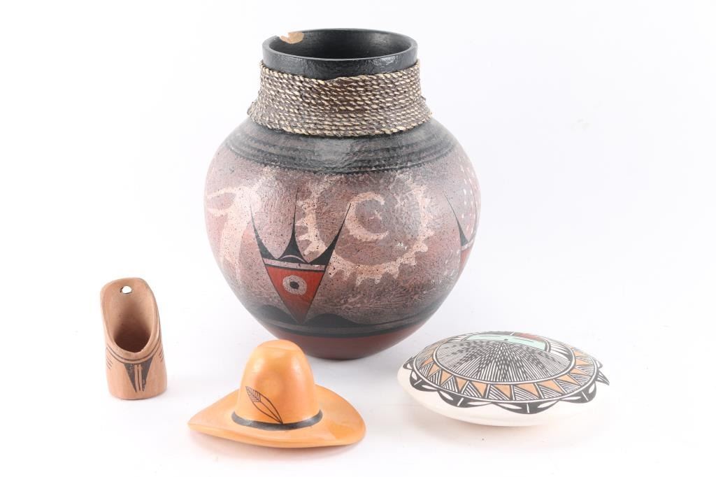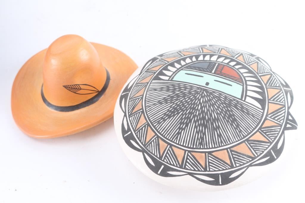 Vase signed Baragon, 8" tall by 3 1/2", neck wrapped in rope, chip at rim. Clay hat with painted feather measuring 2 3/4" tall, 4" long. 3 1/4" tall wall hanger, 1 1/4". 5 1/2" diameter round painted enclosed disc.