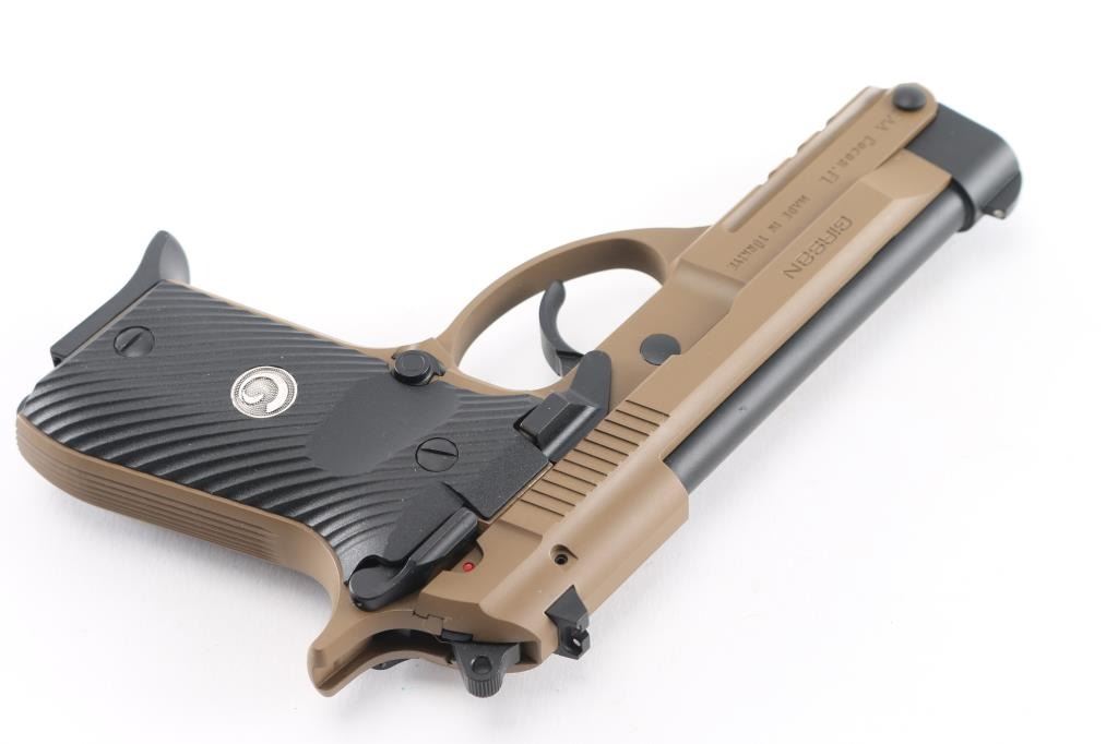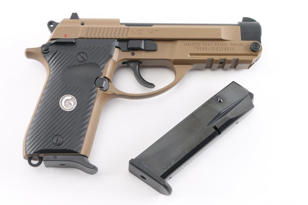 Clone of the Beretta model 86, two major differences. The MC 14T is double stack magazine fed, and it has an attachment rail. Made in Turkey, imported by EAA of Cocoa FL. Features Flat Dark Earth cerakoted (or similar) finish with contrasting black finish on controls and barrel, checkered black polymer grips, 4.5" tip-up barrel, dovetailed sights wit 3 white dots, frame mounted ambidextrous manual safety. Bore is pristine. Overall like new condition, in factory hard plastic case with manual, one magazine, cleaning brush. Retains. (2) magazines total, one flush and one with finger extension.NRA Condition-Perfect in Box. Modern Firearm.