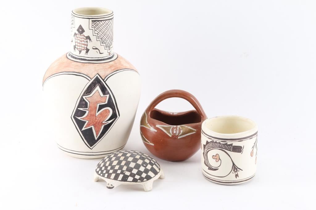 White pottery vase, painted, measuring 9" tall by 6" at widest; and matching cup measuring 3 1/4" x 2 3/4". Basket redware pot with gold and white paint, measuring 4 1/2" tall by 3 3/4" around. White pottery tortoise with black painted checkered shell, measuring 4" x 5".