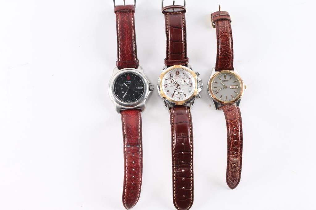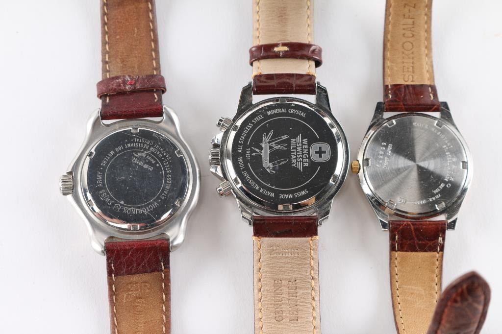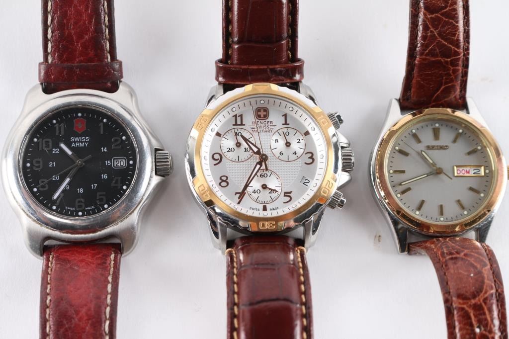 Includes Wenger Swiss Military Chronograph, Swiss Army, and Seiko (English & Spanish days of the weeks.