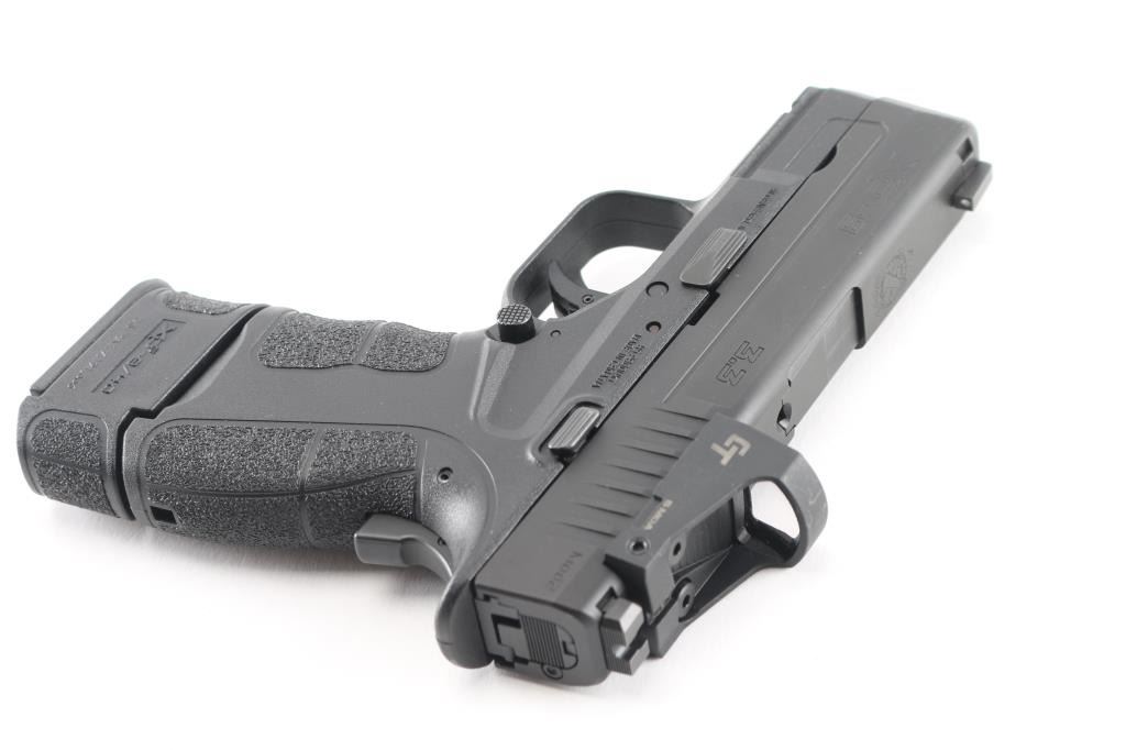 Croatian "Model 2" semiautomatic pistol chambered for 9x19mm Luger, imported by Springfield Armory, Geneseo IL. Features: single stack 9 rd magazine with finger extension, dovetail mounted white dot front sight, square notch rear sight. mounted with a CT 5 MOa red dot laser sight in good working order, grip safety, trigger safety, ambidextrous magazine release, loaded chamber indicator, port to view chamber, black polymer frame with accessory rail, black steel slide, 3.3" barrel, double action only style trigger. Bore is excellent condition. Overall condition is like new with no signs of use. Bore is excellent/bright.Condition is NRA Excellent/Like New. Modern Firearm.