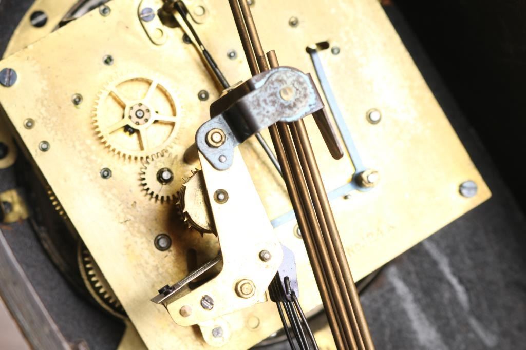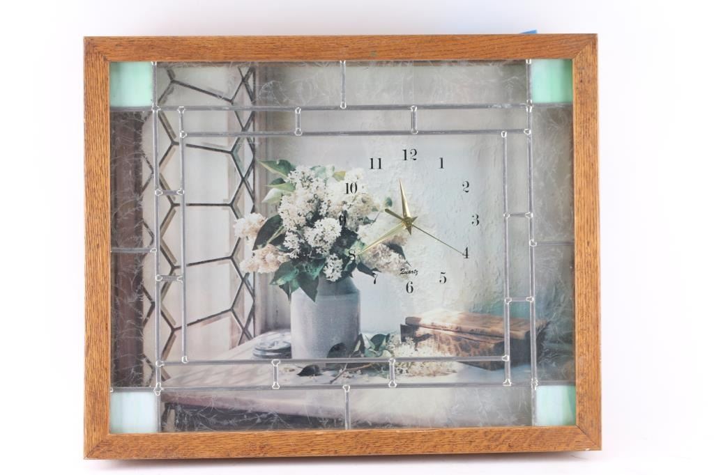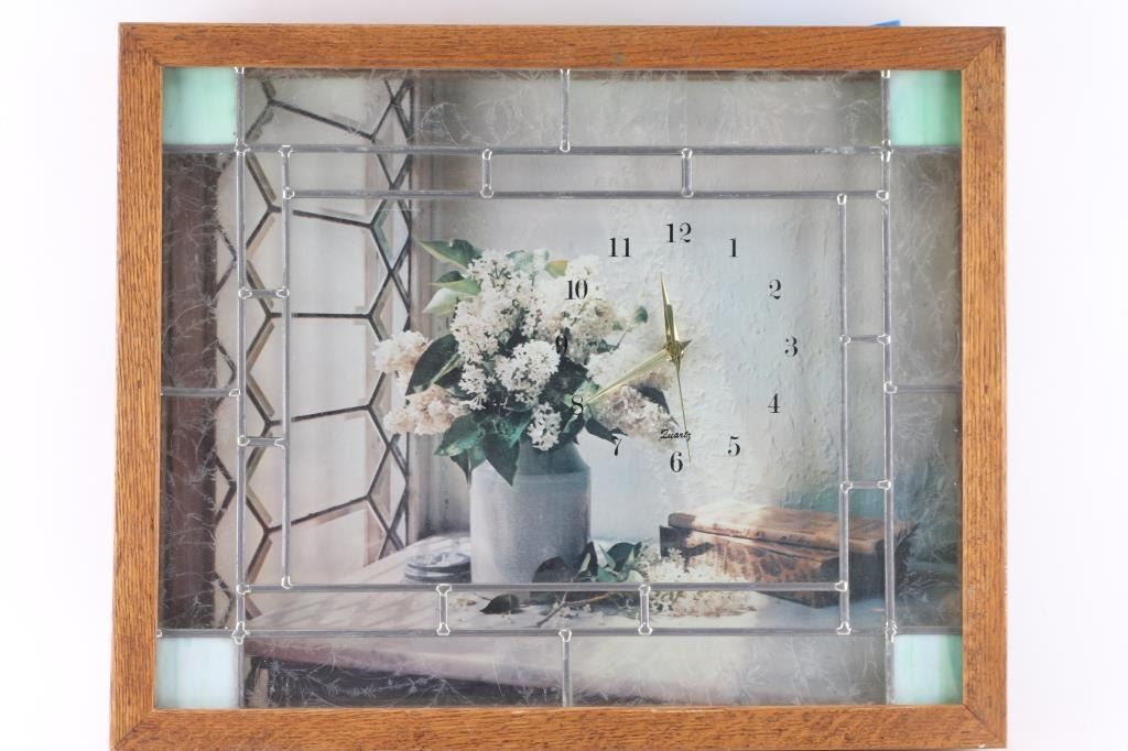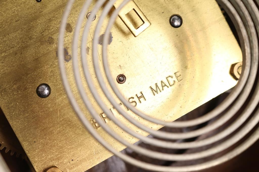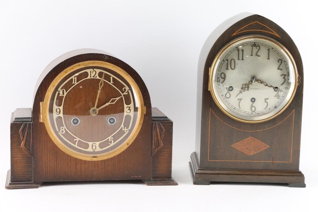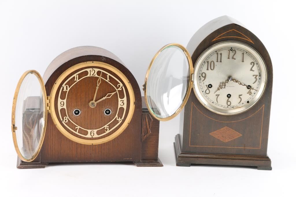 1- Mantel clock w/ "British made" movement w/ pendulum and key. 5" dial. 8-1/2"H x 11"W. 2- Sth Thomas mantel clock w/ pendulum and key. 4-1/2" dial. 11"H x 7-1/2"W. 3- Wall clock w/ wood frame