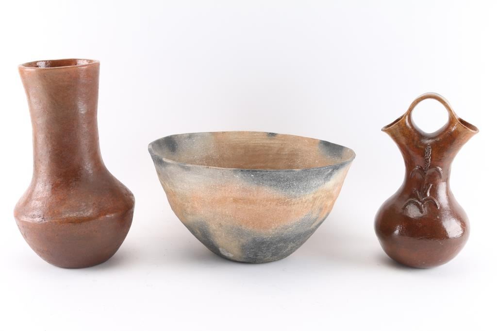 (1) Large glazed bowl, 5 3/4" tall by 11" around. In good condition with minor chip at rim and 1" chip out of body. (1) Glazed wedding vessel with corn design on one side and beaver on the other. 9 1/2" tall. Maker marked B.M. In excellent condition. (1) Tall vase measuring 10 1/2", maker marked C.B. on bottom. In good condition with minor crackling of glaze on interior of neck.