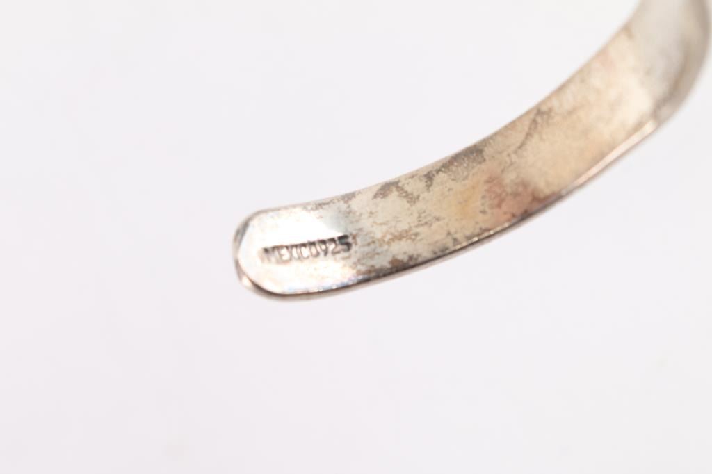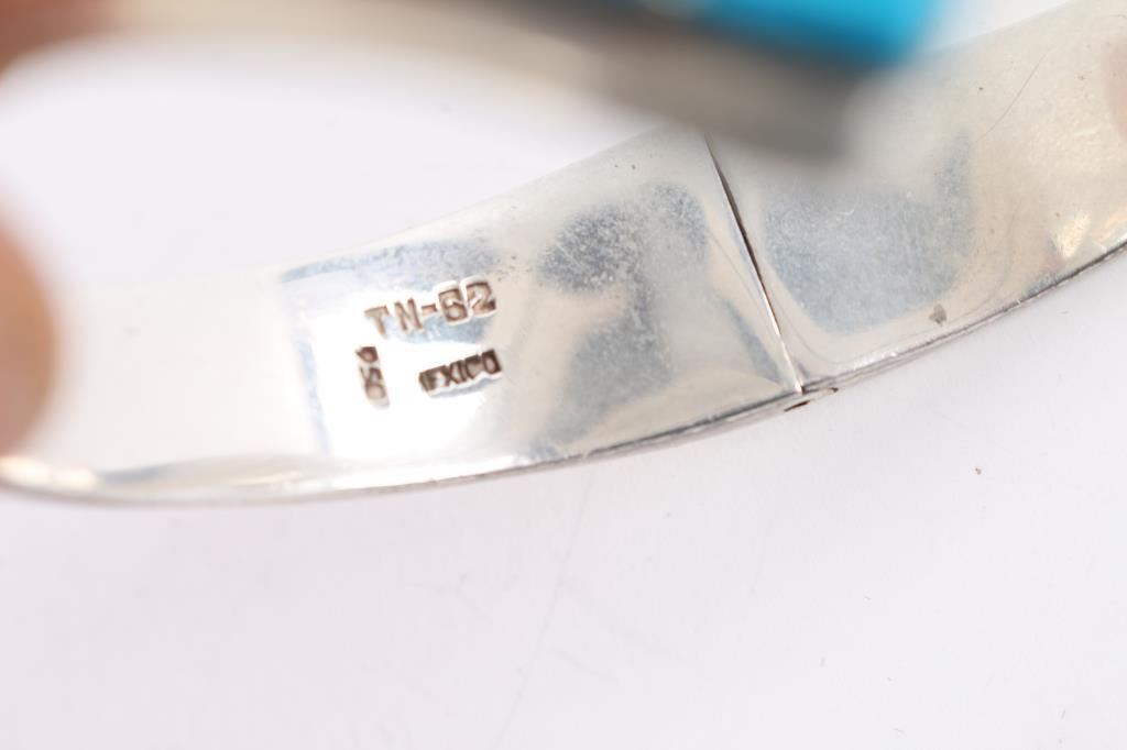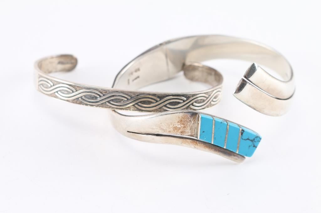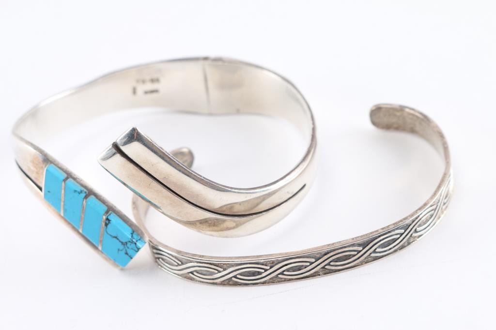 Two modern sterling silver cuffs, one with a hinge for easy on and off and inlaid turquoise, the other with an etched double wave design. Both measure 7 1/2" with gap.