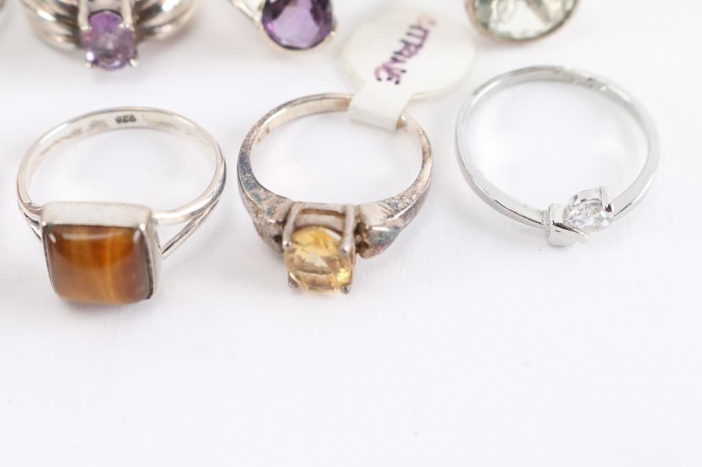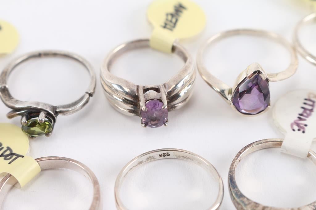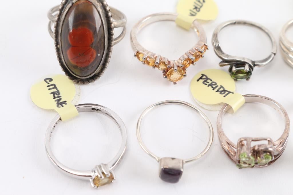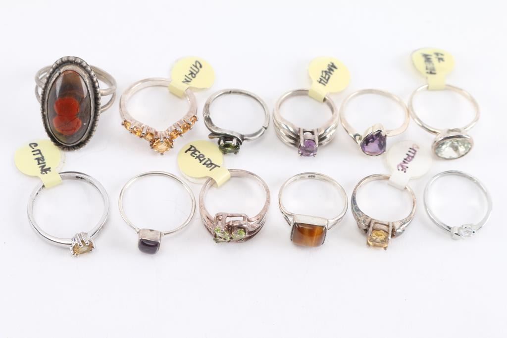 Includes amethyst, citrine, peridot. Most are sterling silver. Various sizes.
