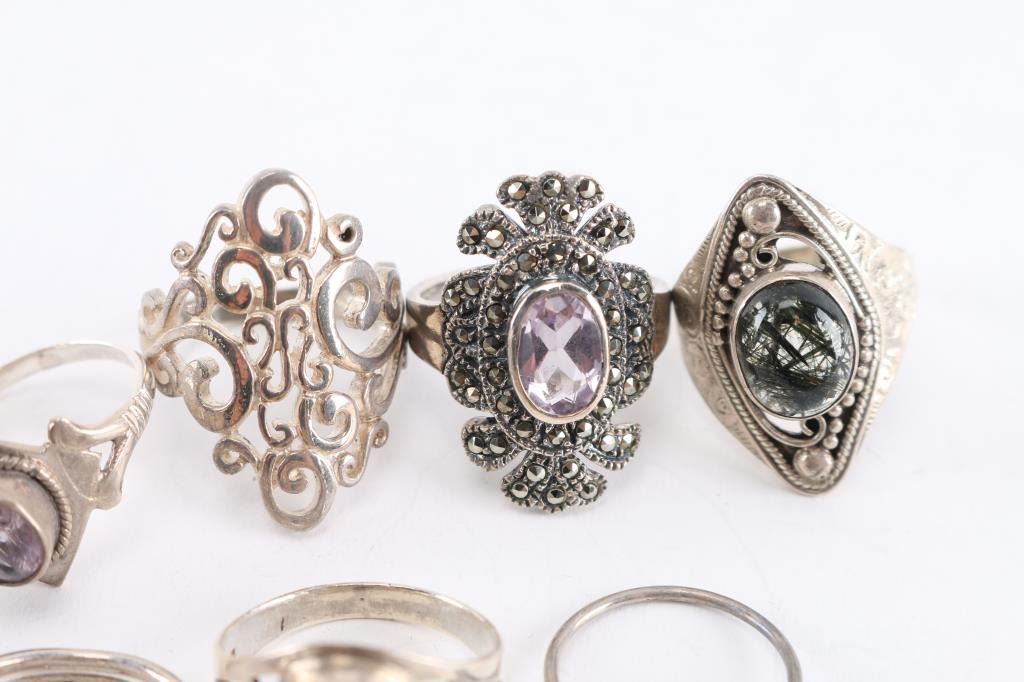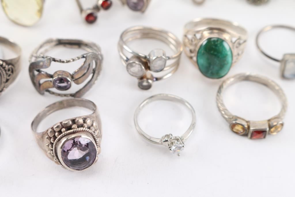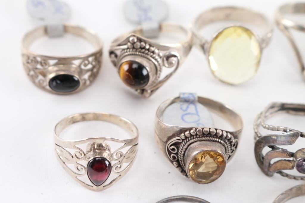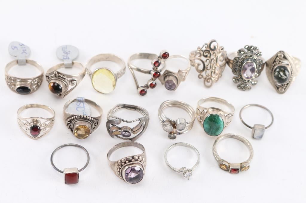 Approximately 18, mostly sterling silver, most have gemstone in setting. Various sizes.
