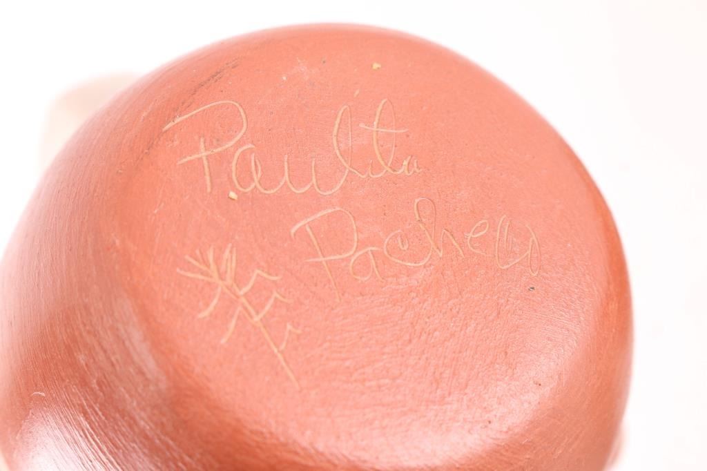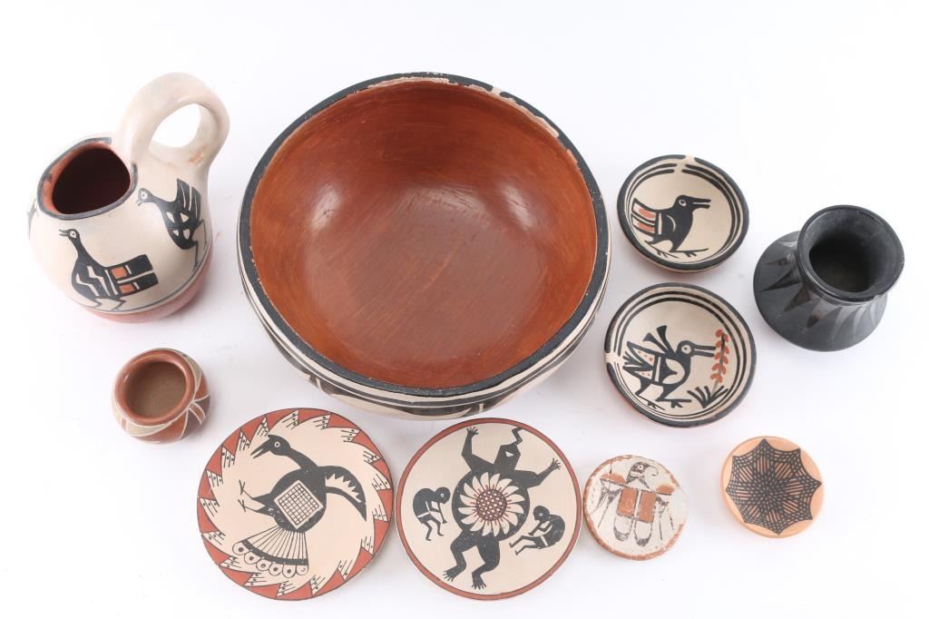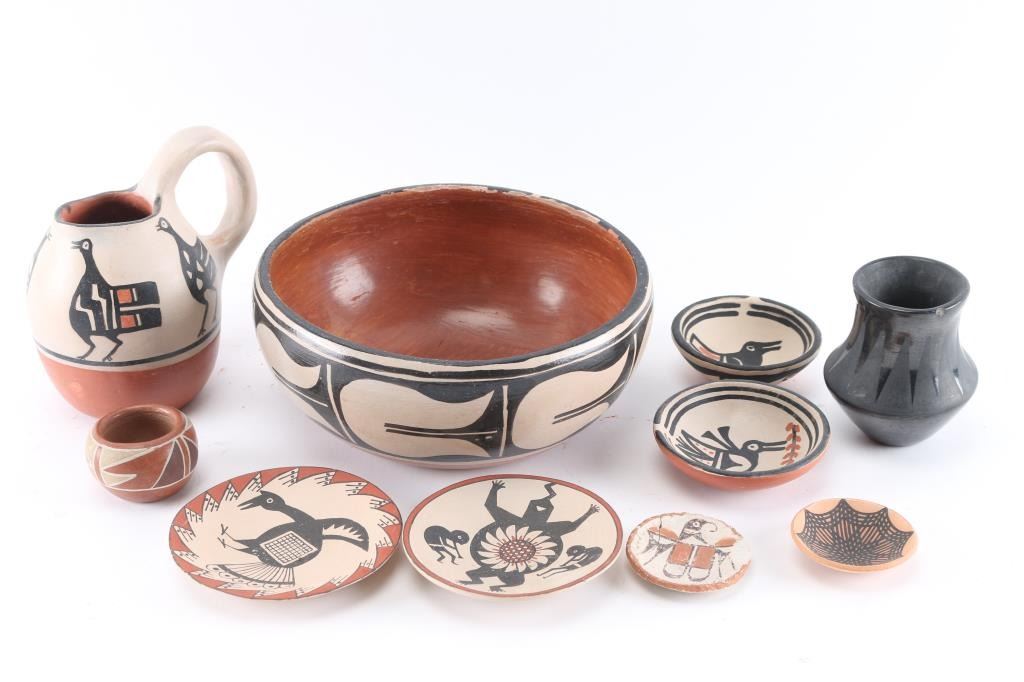 (1) Bowl measuring 3 1/4" tall by 7" around. Signed on bottom but scratched through. Some wear around rim. (1) Paulita Pacheao pitcher decorated with birds, signed on bottom, measures 5 1/4" at tallest. (1) black on black small pot, 3 1/2" tall. (1) very small bowl, 1 1/2" around. (6) small plates and bowls, all signed on bottom, one repaired.