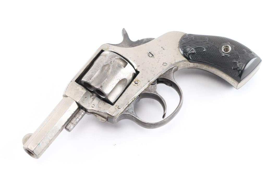 Note* Parts/repair gun, main spring is broken. Double/single action 6 shot revolver chambered in .32 S&W caliber circa 1905-1942. Half moon blade front sight, checkered cylinder rod and hammer spur, smooth trigger, nickel finish, blue triggerguard with checkered black hard rubber grips and 2 1/2" octagonal barrel. Retains about 85% of its finish with handling wear, scattered light patina. Hammer does not cock, cylinder locks up when hammer is held back. Circa 1910s.Condition is NRA Fair. C&R Firearm.