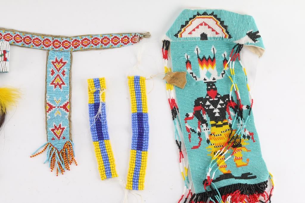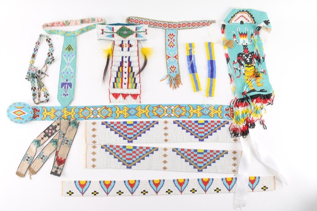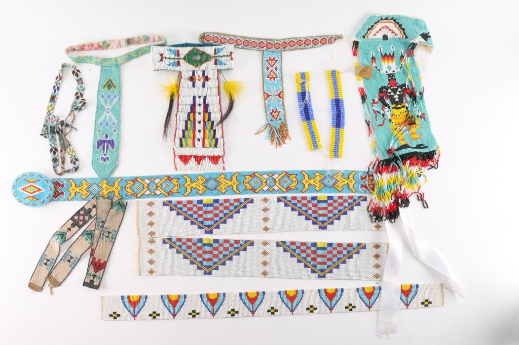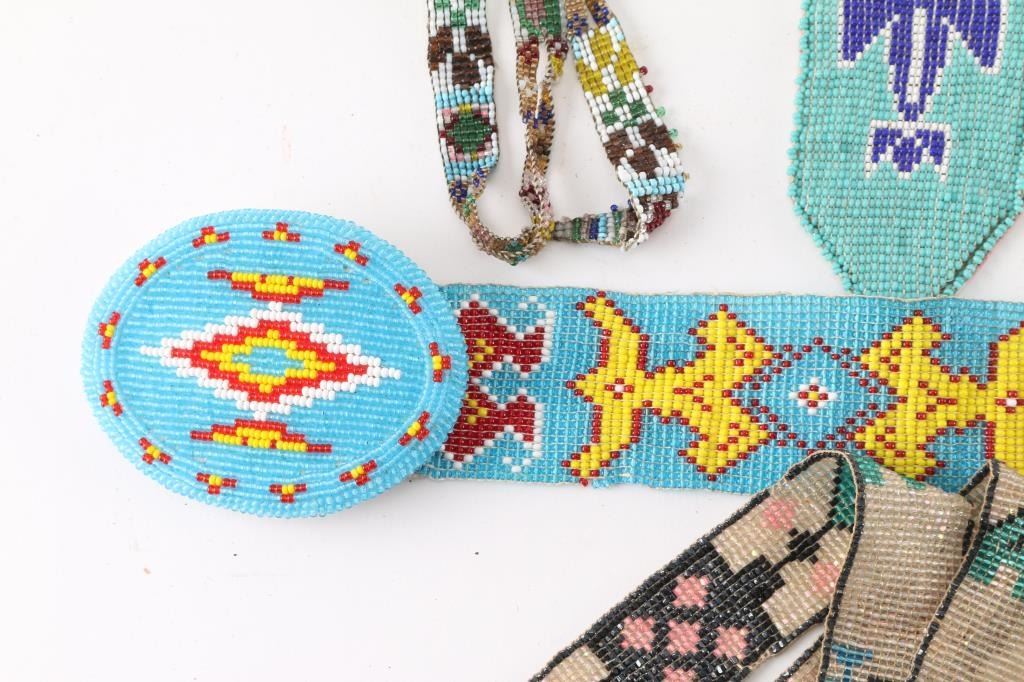 (4) T-necklaces, various sizes, designs; (1) beaded belt with beaded belt buckle; (5) beaded strips, various designs and ages.