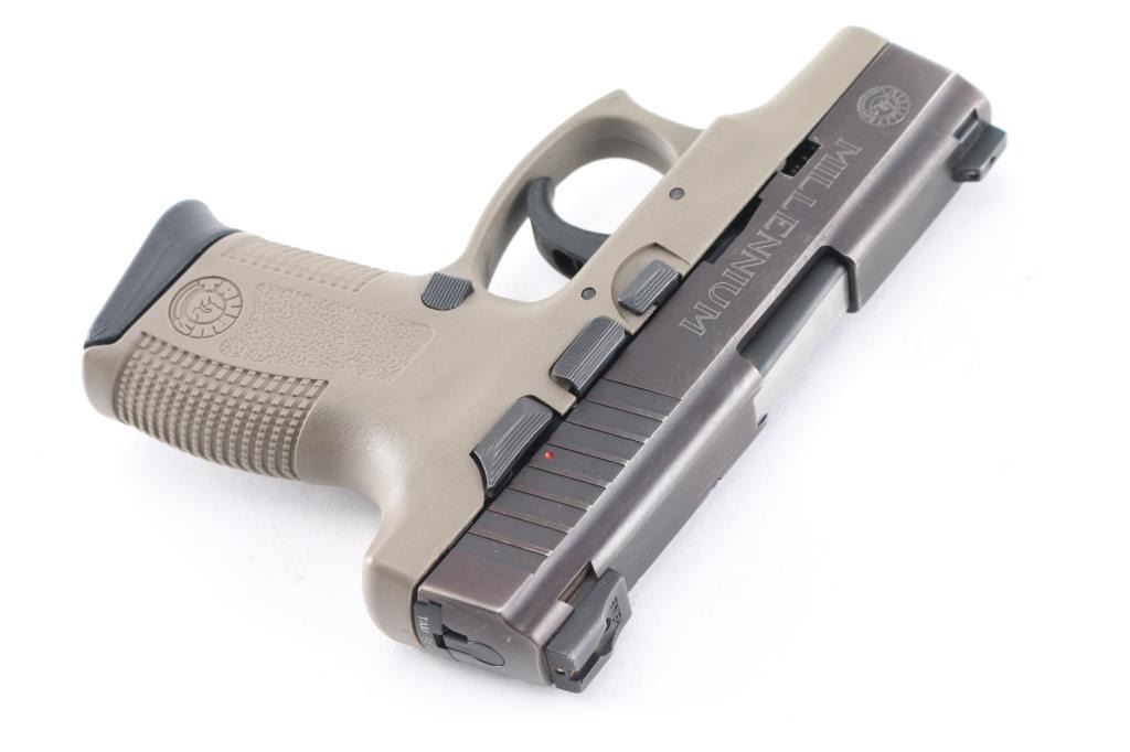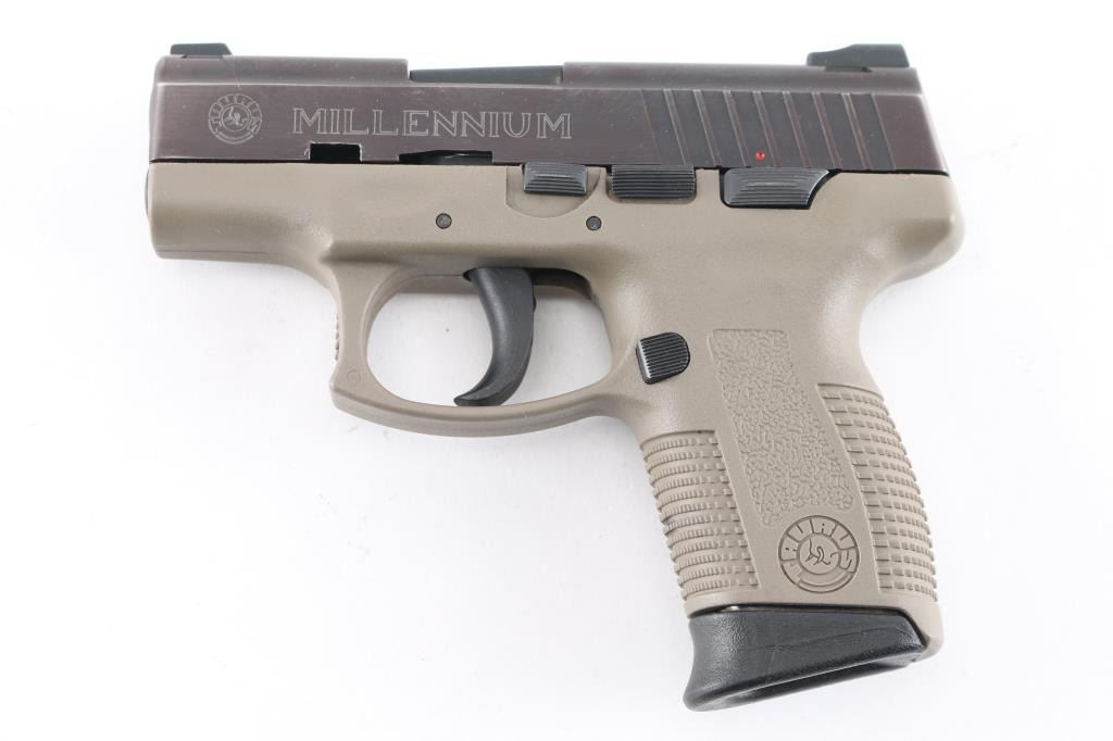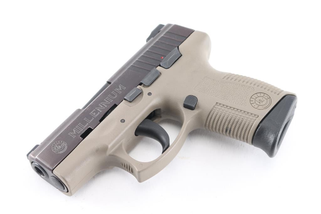 Brazilian semiautomatic pistol imported by Taurus INT, Miami FL. Features approx 3.25" barrel, fixed dovetail two dot mounted sights, striker fired with double action only trigger, frame mounted manual safety. Bore is excellent/bright with strong rifling, Retains 90% plum finished slide with edge wear, minor scratches. Tan polymer frame is very good condition. Includes one magazine with finger extension..Condition is NRA Very Good+. Modern Firearm.
