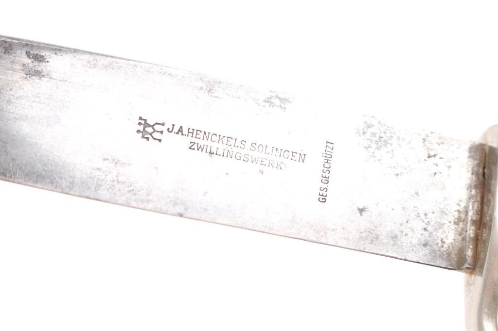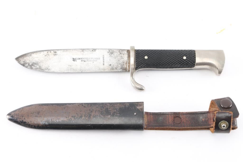 Early example with the motto maker marked blade . 5.5" blade. Nickeled steel, HJ diamond in right grip. Blade etched " Blut und Ehre" (Blood and Honor), reverse stamped "J.A, Henckels. Solingen, Zwillingswerk" below two intertwined stick figures motto, below id stamped "Ges. Geschutzt". Black painted scabbard is about 60% with paint scuffed of, mostly to the front, leather is good/intact.. Overall good condition. The early ones with the motto are getting scarce. the motto is a little worn but readable. the pommel/crossguard are very good, blade has some dark patches of very light pin-prick pitting.