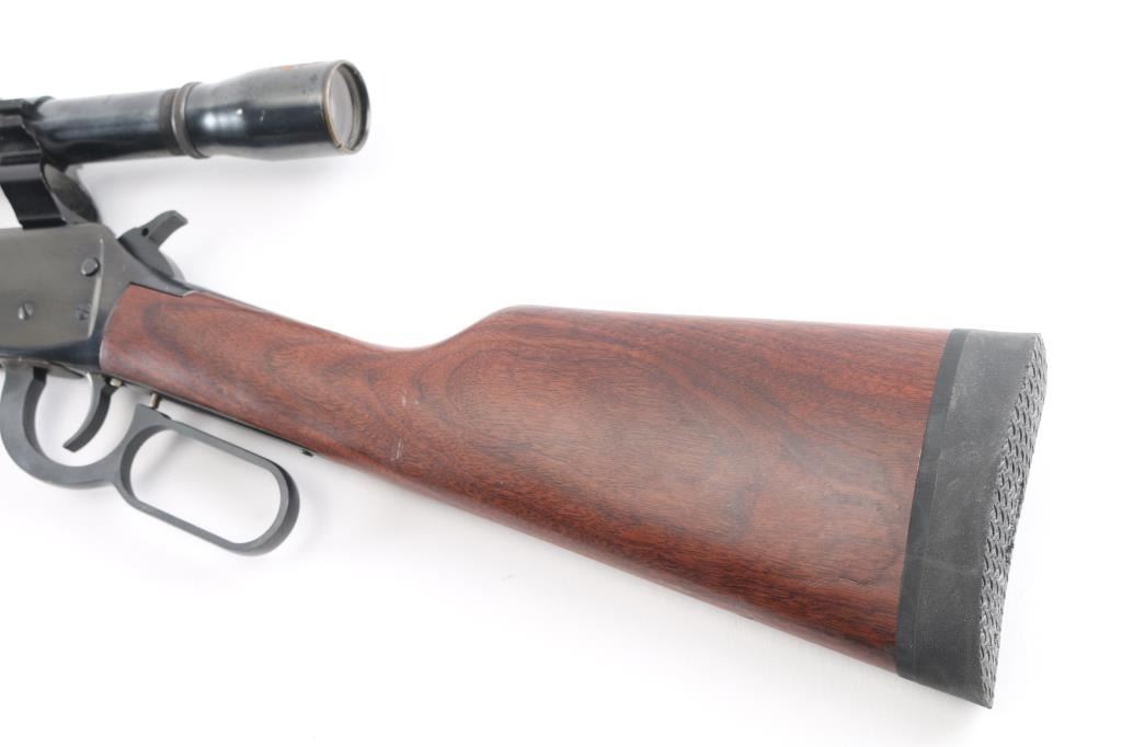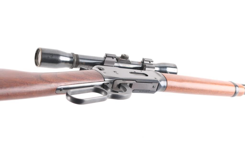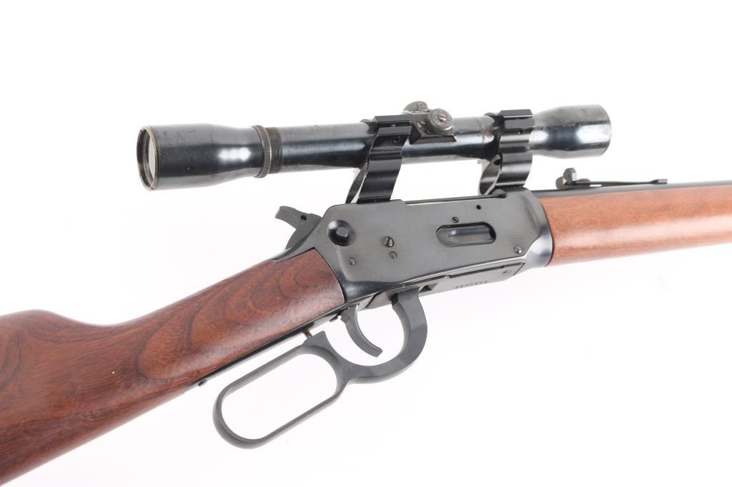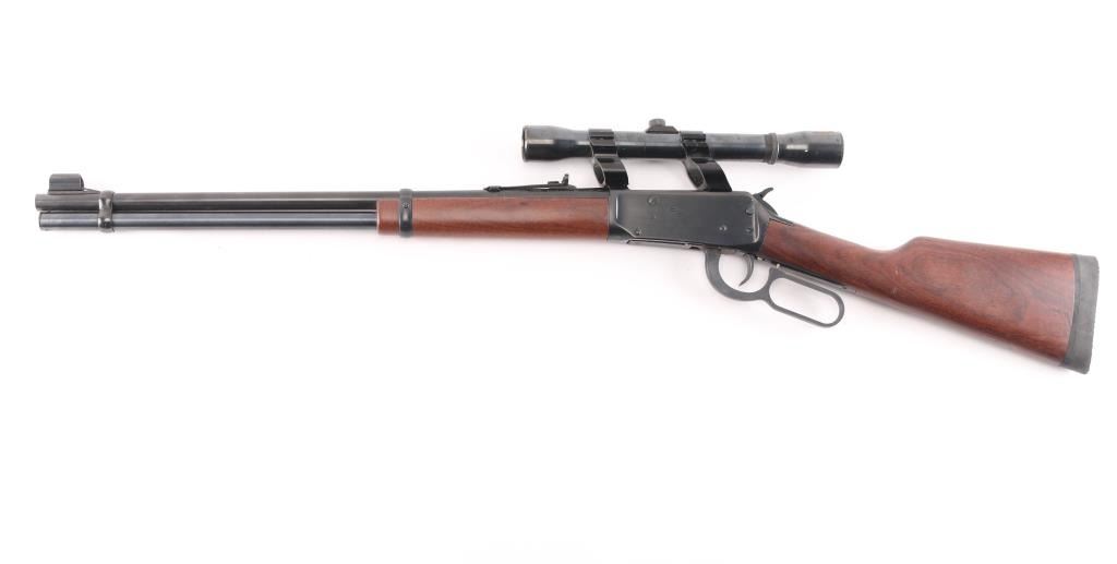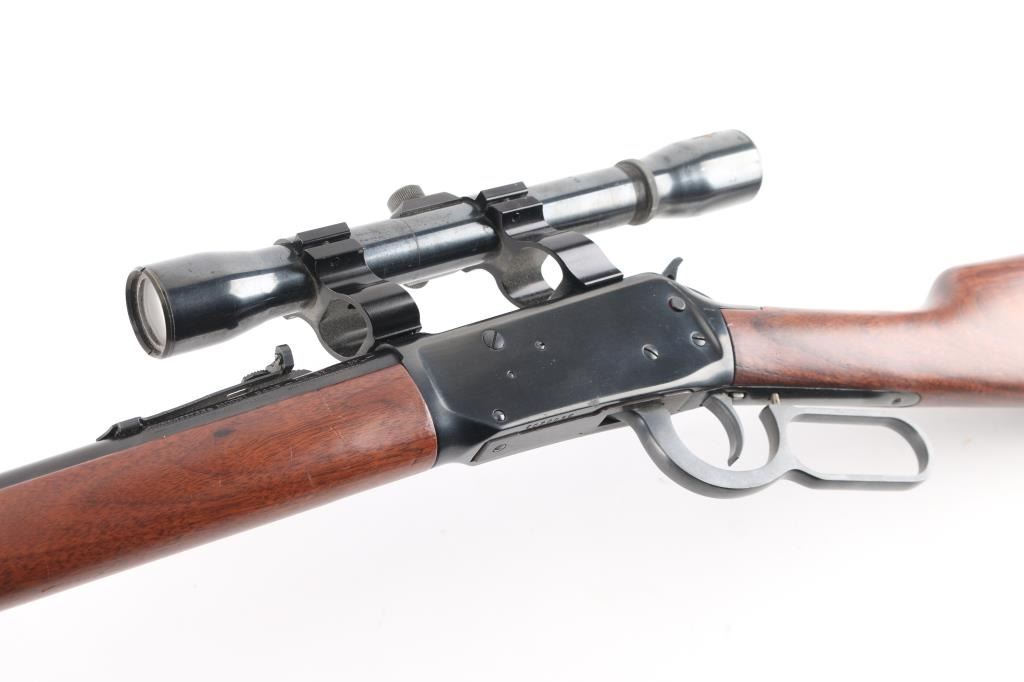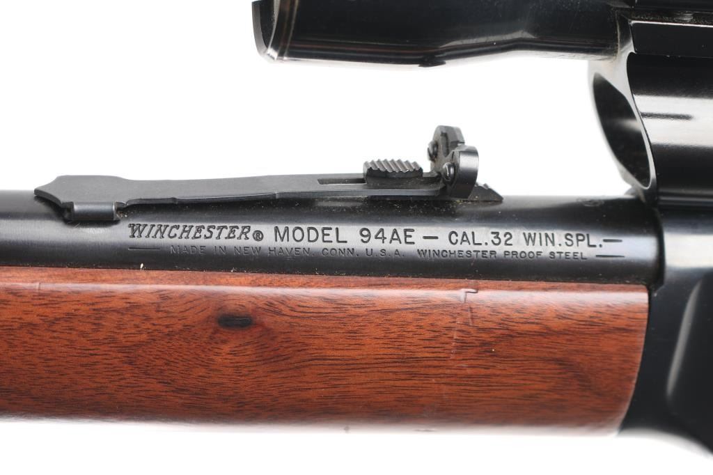 Eastern carbine. Angle Eject Lever-action repeating rifle chambered in .32 Winchester Special. The 94AE model is designed to be compatible with a center mounted scope and features a factory drilled & tapped receiver and angled cartridge ejection Mounted with a vintage weaver K-4 scope with post/crosshair reticle, clear optics. See through rings. Blued finish, 20" barrel,hooded. ramped dovetailed blade/bead front sight, semi-buckhorn rear sight, full-length magazine tube, smooth trigger with beveled edges, serrated hammer spur with provision for an extension, push button safety, grip safety, two barrel bands, smooth walnut forend and straight grip shoulder stock with solid black rubber recoil pad. Rifle exhibits approximately 92% of its original blued finish with minor scratches on the receiver. some minor scuffs on the barrel. Action is smooth, the bore is pristine and wood stocks are fine. Scope has some scuffs and a patch of surface rust on the lower left side.Condition is NRA Very Good. Modern Firearm,