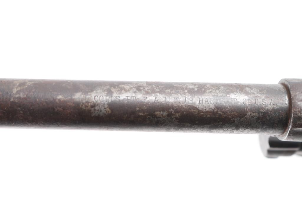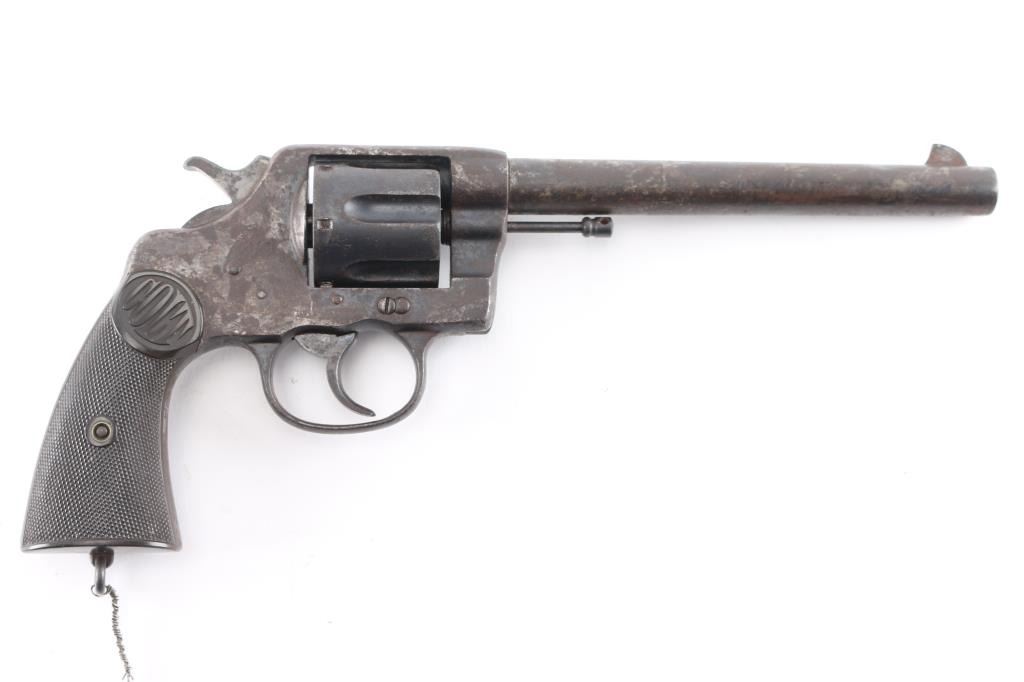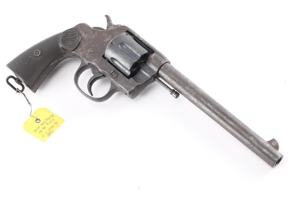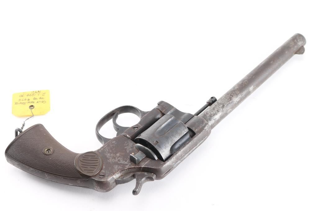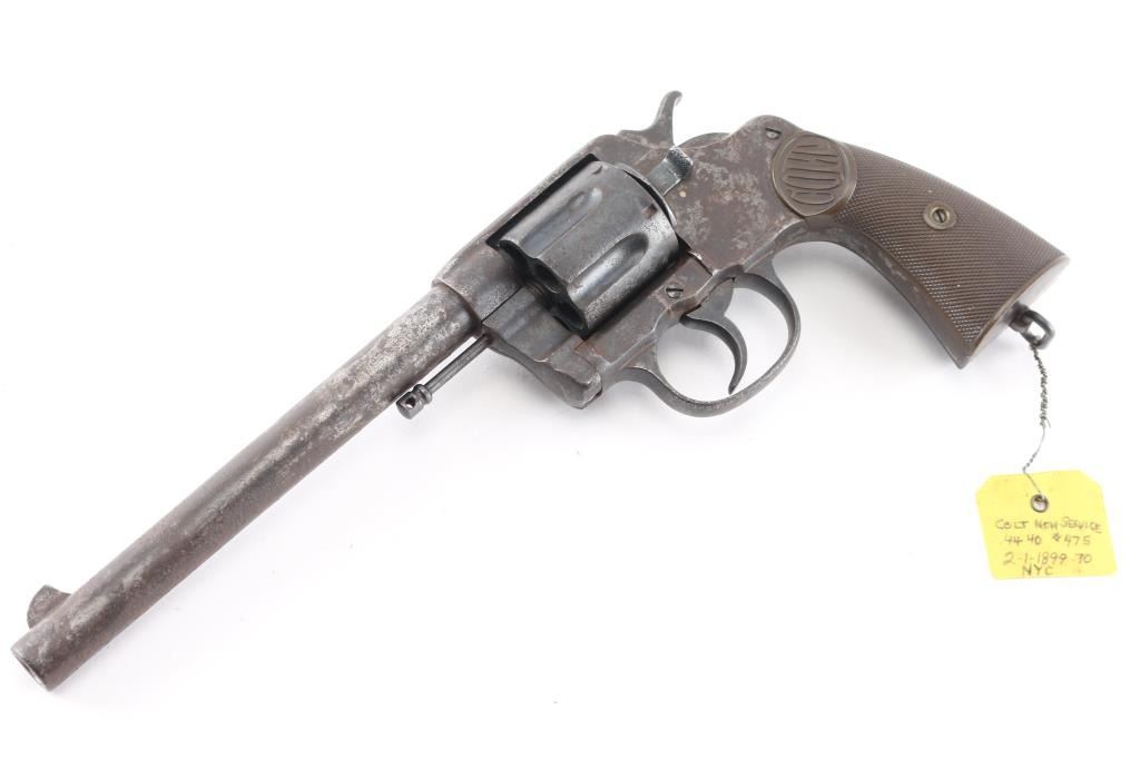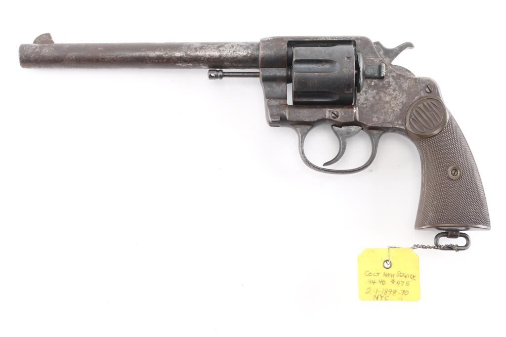 Low serial number large frame double action service revolver chambered for .44 WCF, manufactured in Hartford, CT circa 1899. Features nickel finish, 7.5" barrel with one-line address, blade front sight, u notched rear sight, smooth trigger, knurled hammer spur, fluted swing out six-shot cylinder, non-shrouded ejector rod, large square butt frame with lanyard loop, and two-piece checkered black (Left panel turned brown from oxidation/handling) hard rubber "COLT" grips. "New Service Cal. .44 on left barrel. Serial number matched inside frame and crane, no other markings observed, markings are feint but readable. Bore is bright with rifling, scattered areas of light pitting. Nickel finish has turned a brown patina with traces of nickel with almost all covered id scattered pin-prick pitting. Grips are sound with slight wear to the checkering. Hammer action is smooth but cylinder spins freely, locks up when hammer is engaged. Old tag that came with revolver states it was shipped to N.Y.C. on 2-1-1899.