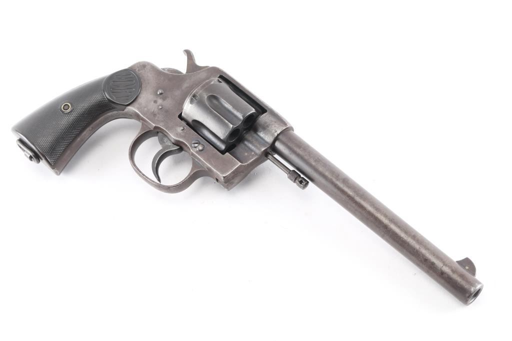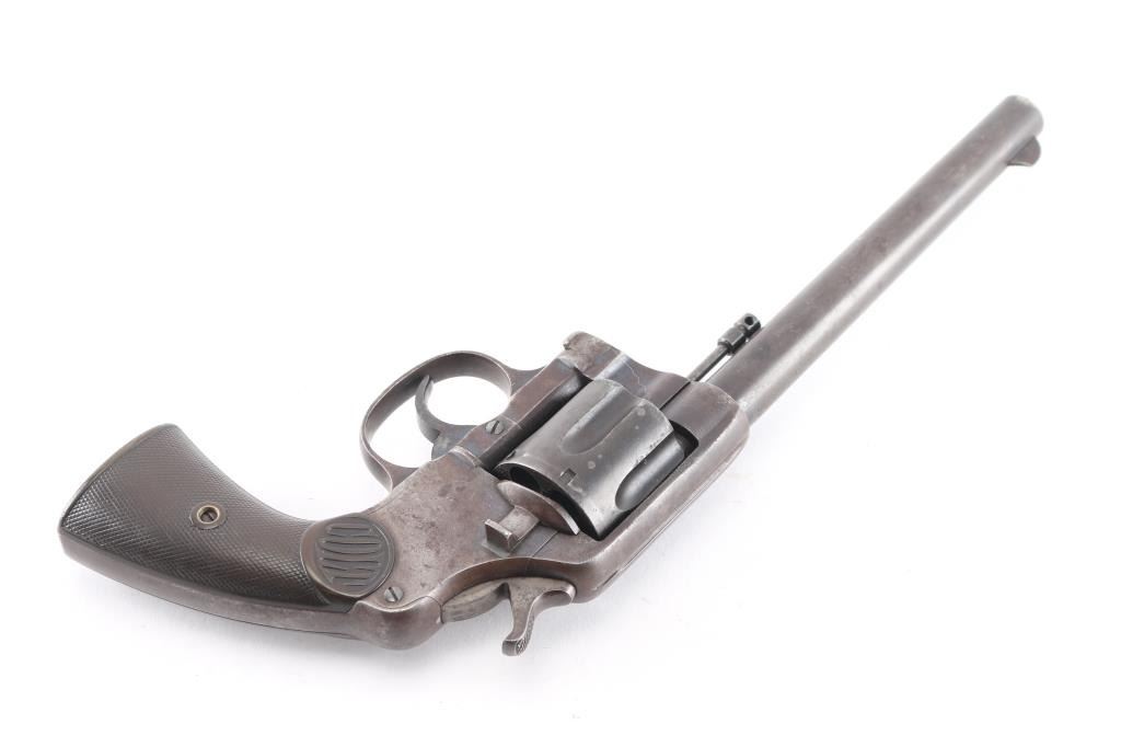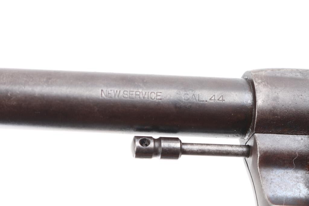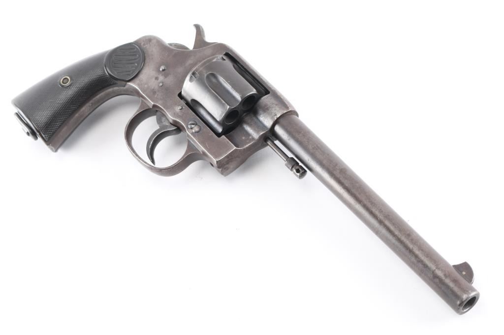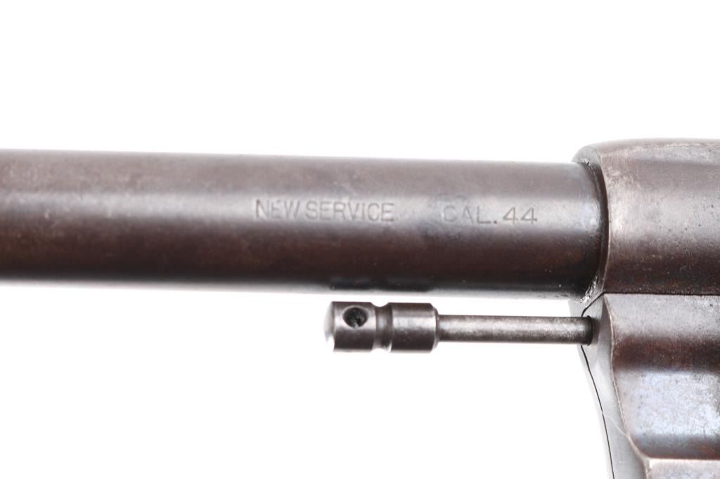 Vintage large frame double action service revolver chambered for .44 WCF, manufactured in Hartford, CT circa 1900. Features blued finish, 7.5" barrel with two-line address/patent dates, blade front sight, u notched rear sight, smooth trigger, knurled hammer spur, fluted swing out six-shot cylinder, non-shrouded ejector rod, large square butt frame with lanyard loop, and two-piece checkered black (Left panel turned brown from oxidation/handling) hard rubber "COLT" grips. Rampant Colt on left side of frame surrounded by "COLT / NEW SERVICE" forming a circle around the horse, feint with just traces of horse visible. Bore is bright with rifling, scattered areas of light pitting. Blue has turned a brown patina with traces of blue in protected areas, hammer has feint traces of case color Grips are sound with wear to the checkering. Both panels have serial number lightly scratched in. Action is smooth with tight lock-up.Condition is NRA Fair. C&R Firearm.