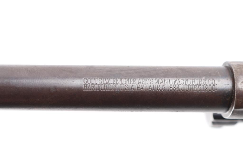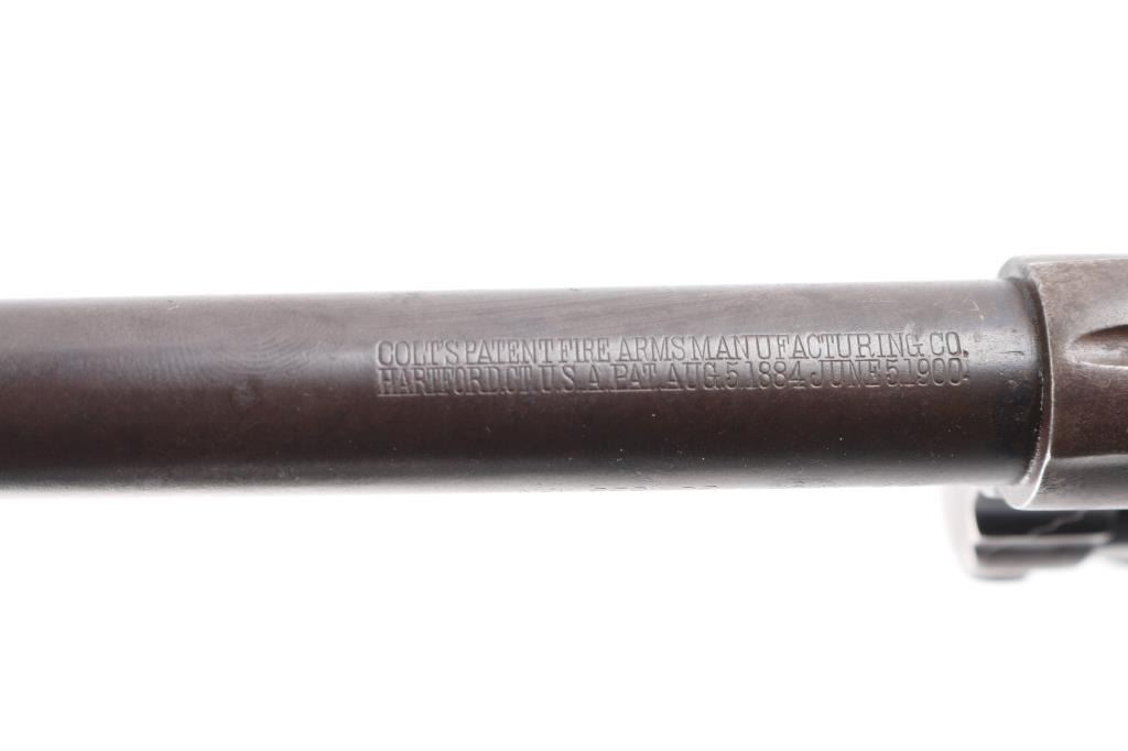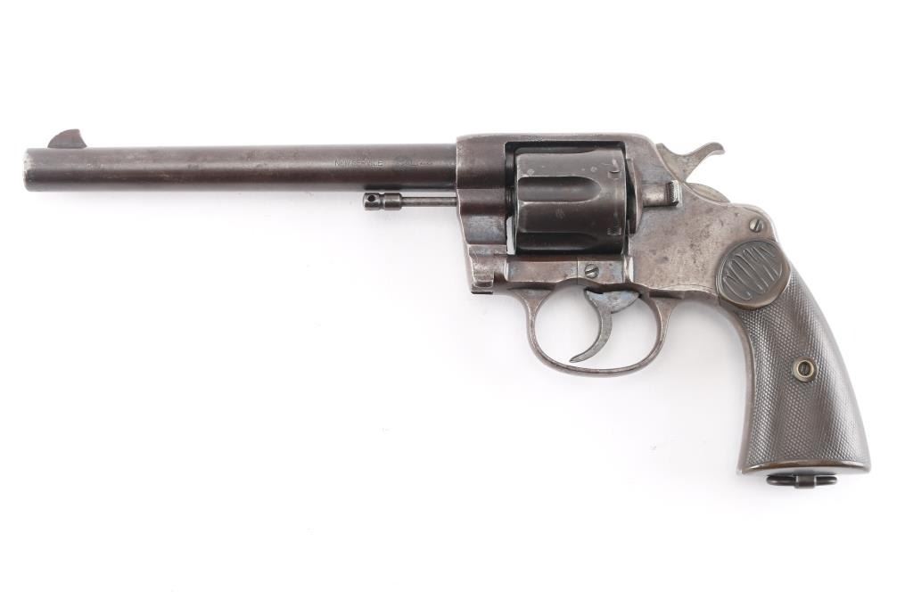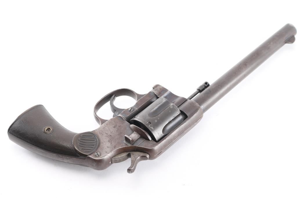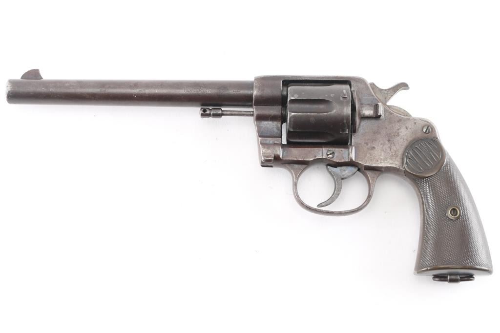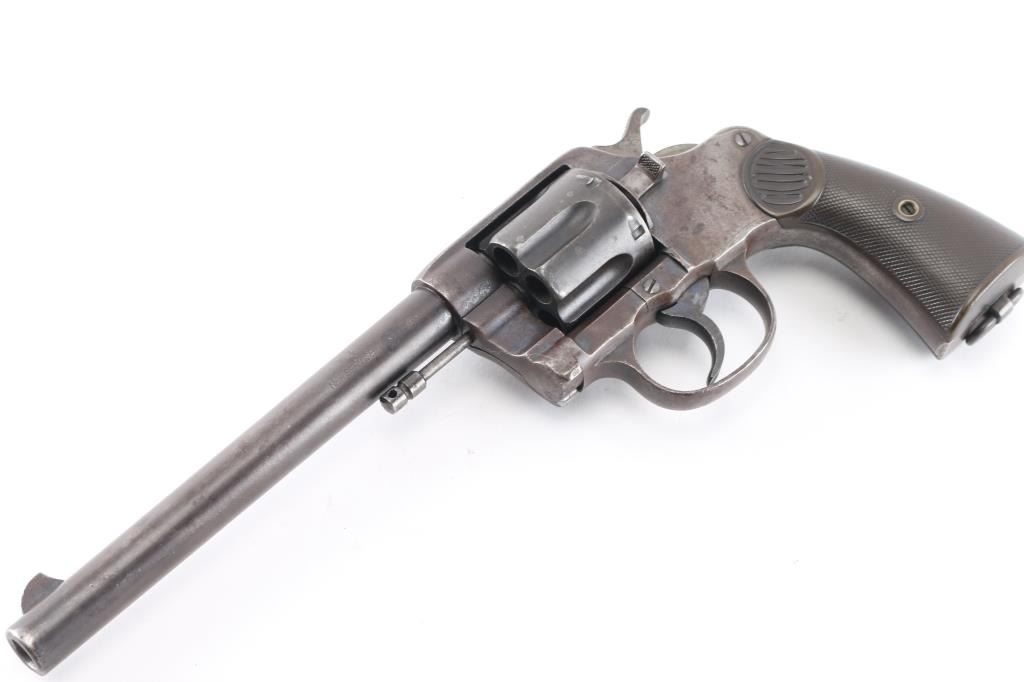 Vintage large frame double action service revolver chambered for .44 WCF, manufactured in Hartford, CT circa 1900. Features blued finish, 7.5" barrel with two-line address/patent dates, blade front sight, u notched rear sight, smooth trigger, knurled hammer spur, fluted swing out six-shot cylinder, non-shrouded ejector rod, large square butt frame with lanyard loop, and two-piece checkered black (Left panel turned brown from oxidation/handling) hard rubber "COLT" grips. Rampant Colt on left side of frame surrounded by "COLT / NEW SERVICE" forming a circle around the horse, feint with just traces of horse visible. Bore is bright with rifling, scattered areas of light pitting. Blue has turned a brown patina with traces of blue in protected areas, hammer has feint traces of case color Grips are sound with wear to the checkering. Both panels have serial number lightly scratched in. Action is smooth with tight lock-up.Condition is NRA Fair. C&R Firearm.