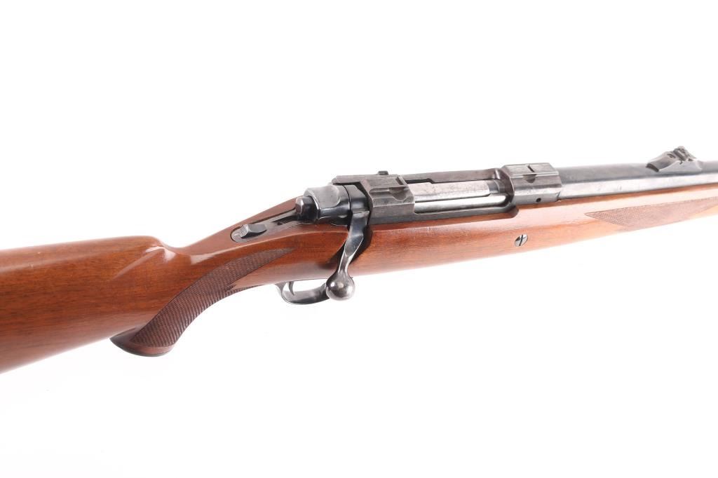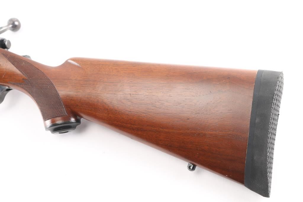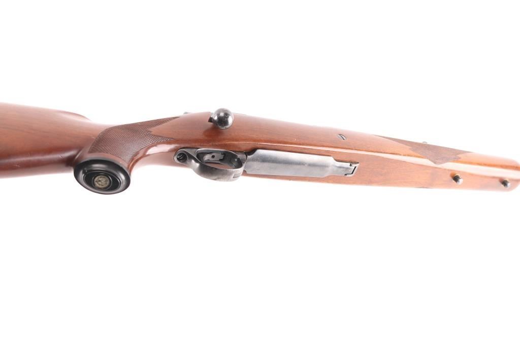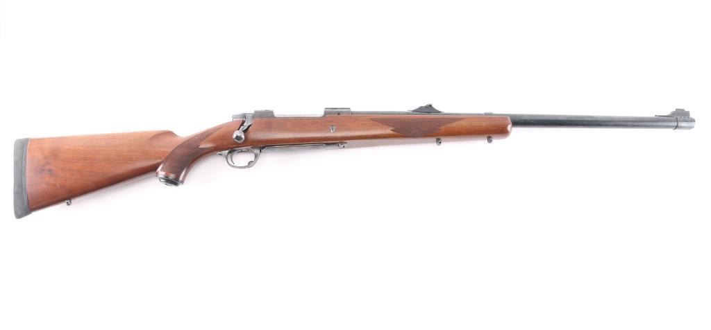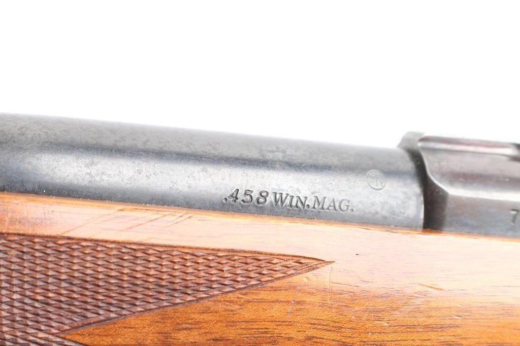 American made big bore bolt-action sporting rifle chambered in .458 Winchester Magnum, manufactured circa 1978. Features a high-luster blued finish, 24" heavy barrel, raised blade front sight with brass bead, flip-up adjustable rear sight on raised base, Barrel is ported at the muzzle, integral scope base cuts in the receiver, smooth adjustable trigger, sliding tang safety, polished bolt with swept back handle, internal box magazine with hinged floorplate and hand checkered walnut pistol grip shoulder stock with swivel studs, two in the forearm, factory grip cap & Decelerator recoil pad. Rifle retains approximately 60% original bluing showing scattered very light pin-prick pitting, handling wear on barrel receiver, bolt handle and bottom metal. Action is smooth, the bore is excellent/bright and the wood stock is very good with minor scratches/dings.Condition is NRA Good+. Modern Firearm.
