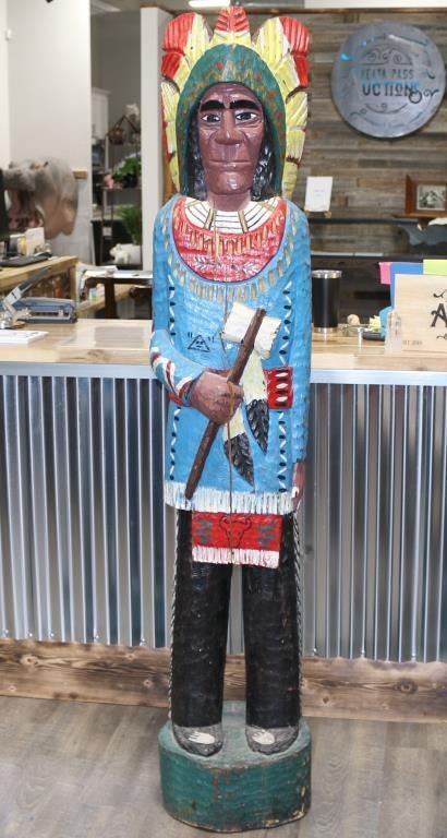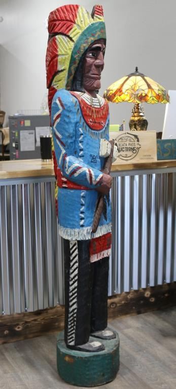 Measures 72 1/2" tall by 44" around. Brightly painted Indian figure holding ax. Buyer must arrange for shipping.