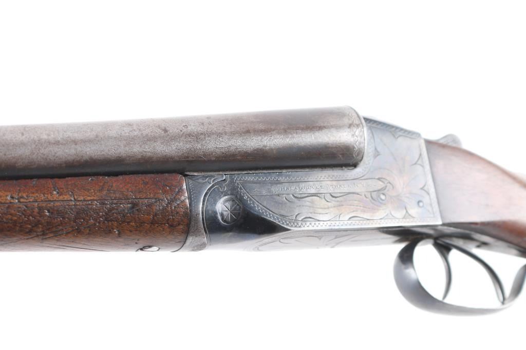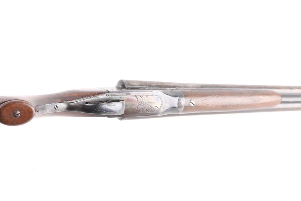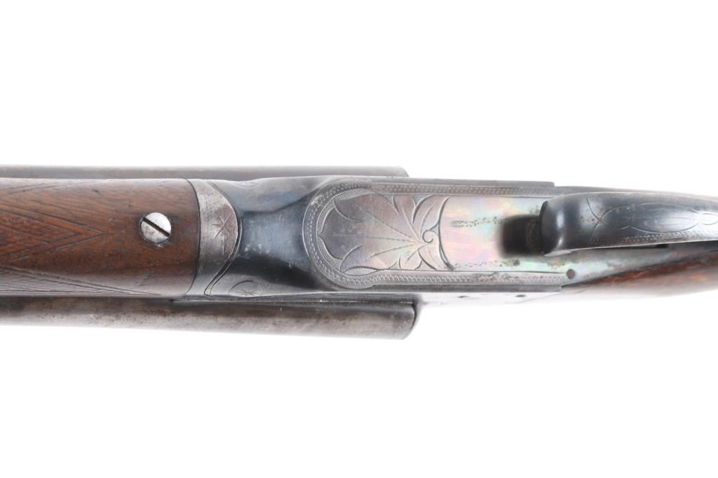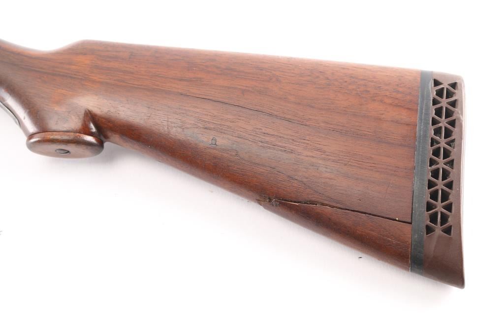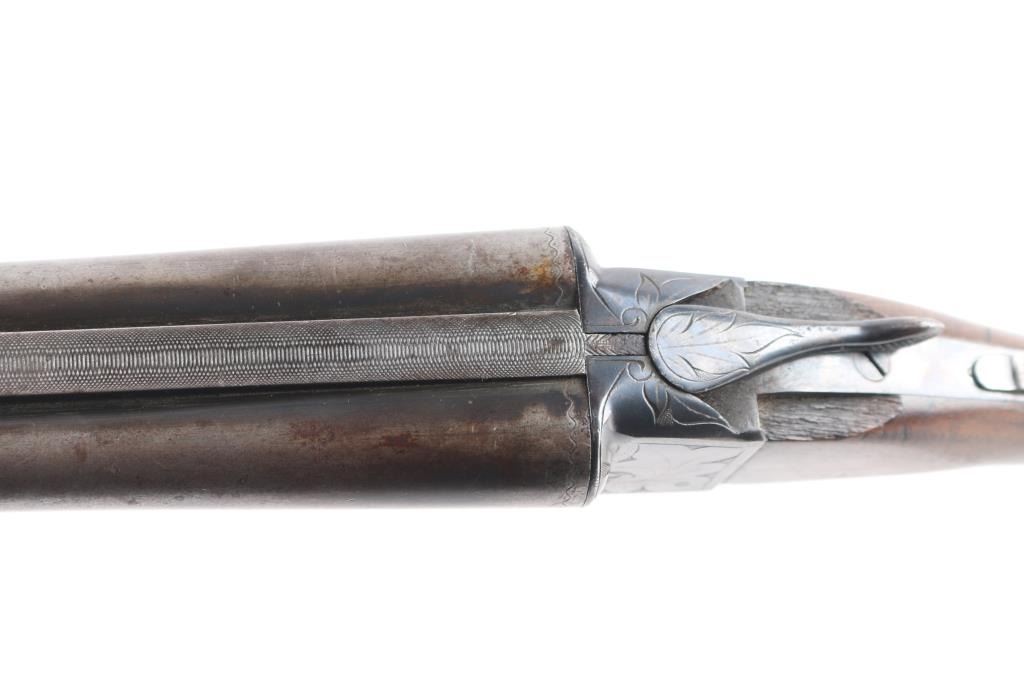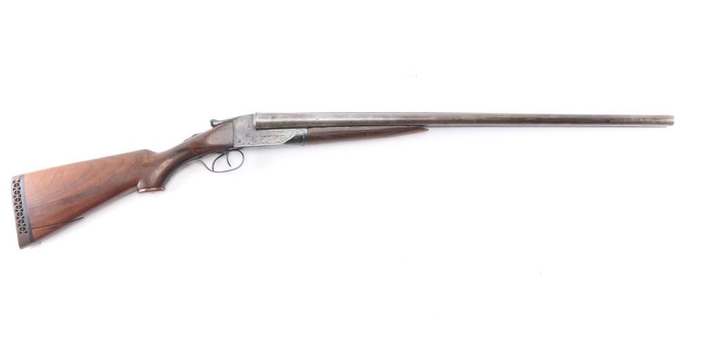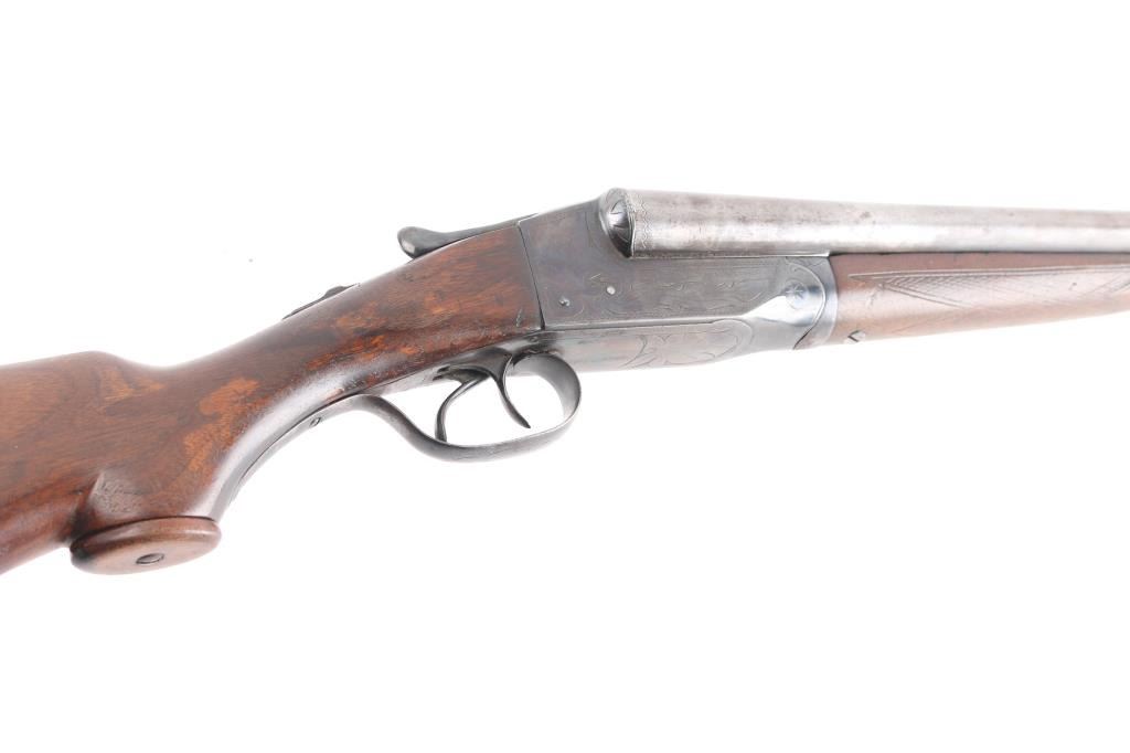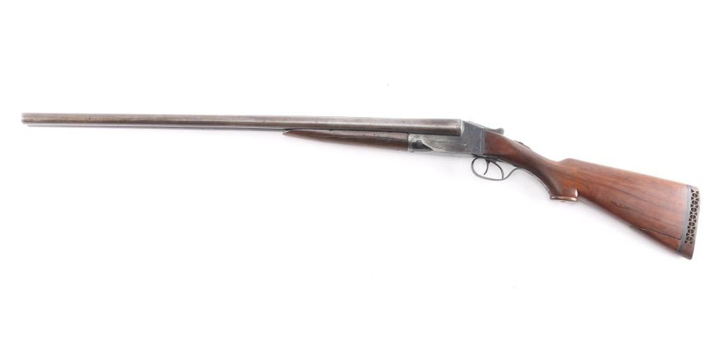 Grade 1 Vintage side-by-side double barrel boxlock shotgun chambered for 16 Gauge shells, manufactured circa 1919. Features blued 26" barrels with a raised matted sighting rib, brass bead front sight, extractor, double triggers, case hardened receiver with floral engraving, knurled top lever, sliding tang safety, checkered walnut splinter forend and pistol grip shoulder stock with hard rubber extension & Pachmyer recoil pad. All serial numbers match. Barrels have turned a brown/gray patina showing wear, The majority of the receivers surfaces displays an aging blue finish with some bright case colors preserved. Action is sound, the bores are bright, markings are good and the wood stocks have two chips out of the top wrist on each side of the tang and a 3 1/2 hairline ctack about mid center of the shoulder stock with a 3" crack with separation on the bottom of stock. , worn checkering, & blemishes. Chokes measure Full-left anf CYL-right. LOP is 13 1/2" to front trigger.Condition is NRA Fair. C&R Firearm.