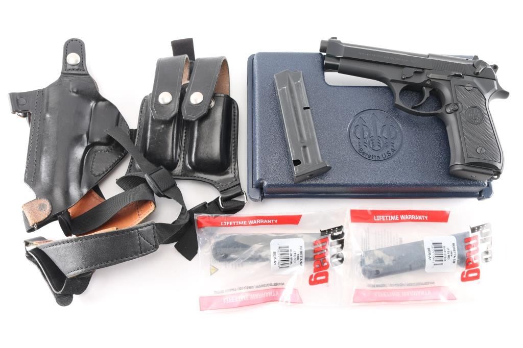 American made semi-automatic pistol, DA, matte black finish, approximately 5" barrel, three white dot iron sights, ambidextrous slide mounted decocker, serrated hammer spur, smooth trigger, serrated frontstrap and backstrap, serrated front trigger guard, black plastic Beretta grips, lanyard ring on frame at the bottom of the backstrap. Retains approximately 98% of its original finish with little to no edge wear, scratches or dings. Bore is pristine. Includes one 10rd Italian made metal magazine and three 15rd metal magazines (ProMag & Mec-Gar), Original dark blue plastic Beretta U.S.A. box and unknown maker black leather RH shoulder rig. NRA Condition- Excellent. ***Modern Firearm***