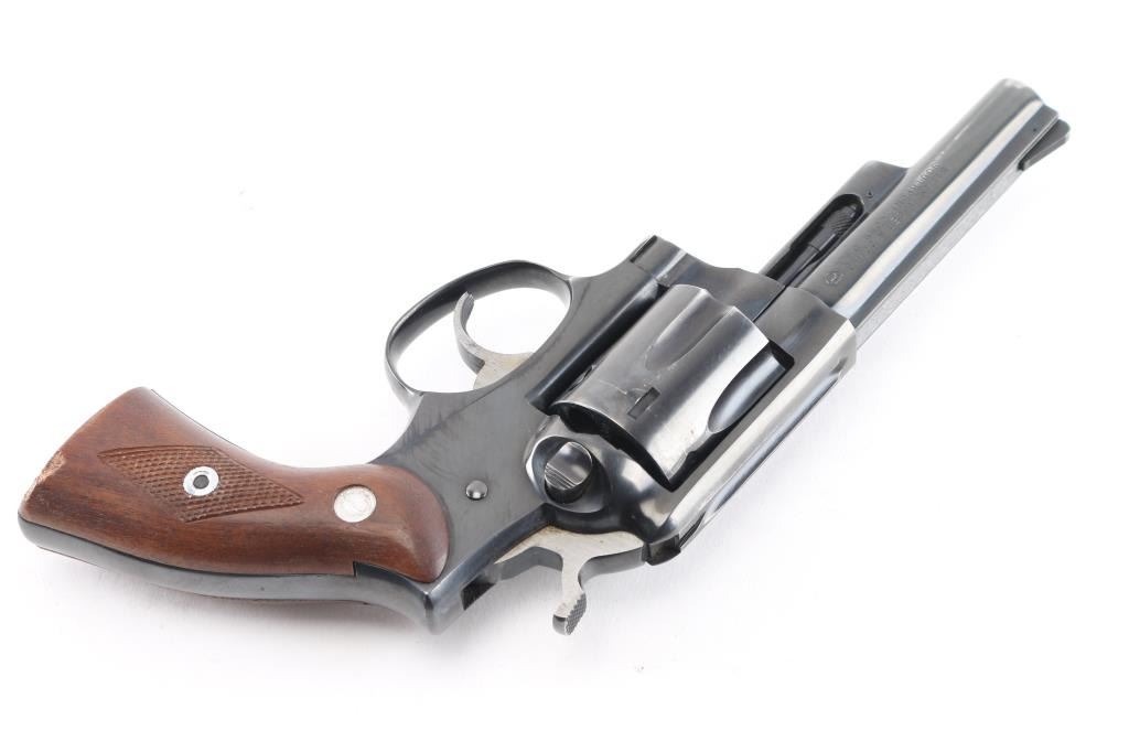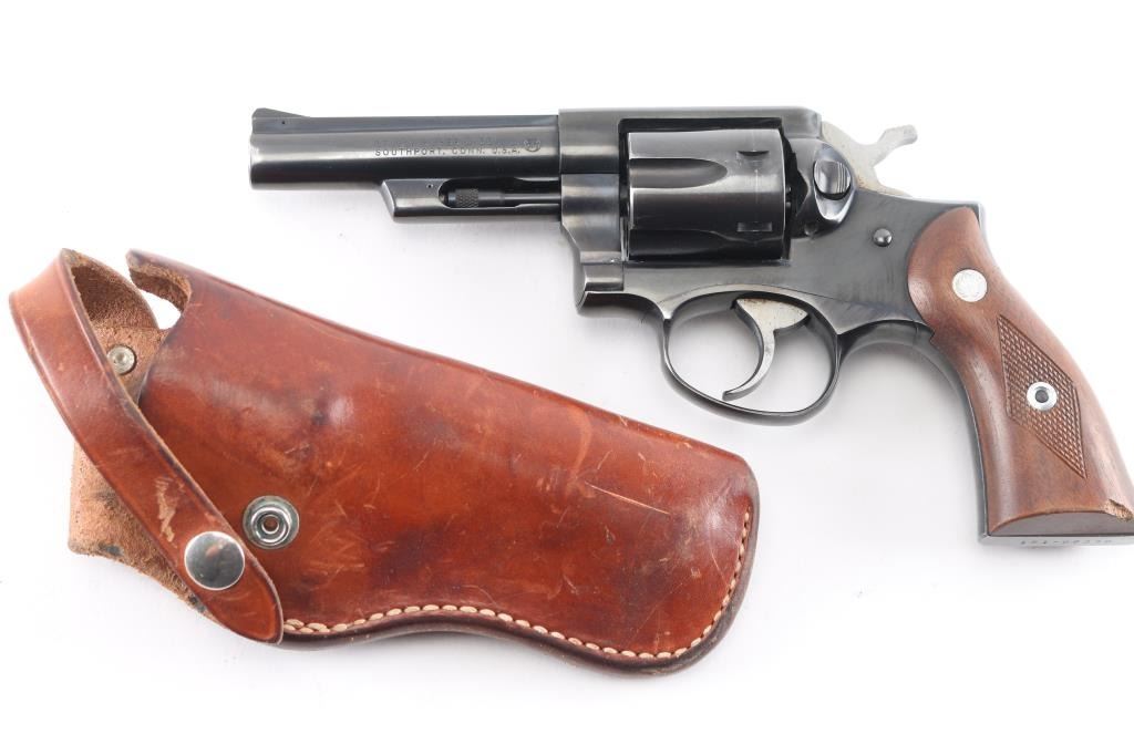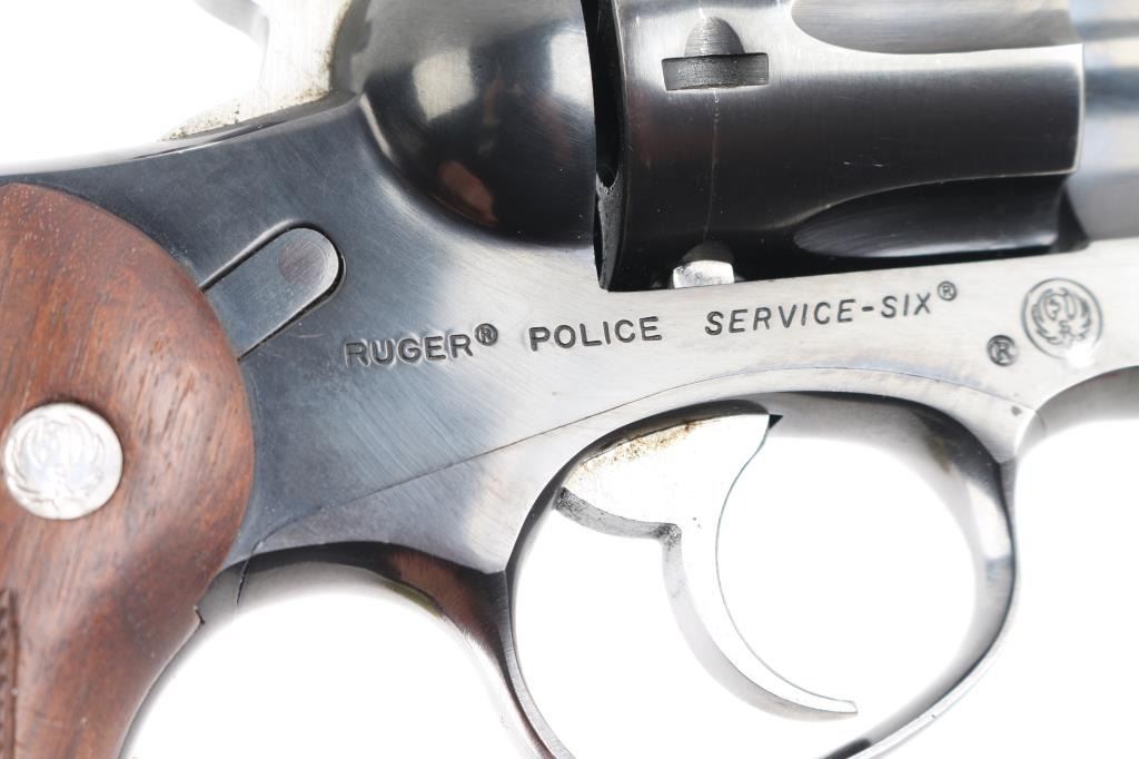 Made in America, the "Police Service-Six" is a 6 shot revolver chambered for .357 Magnum ammunition, circa 1974. It features a blued finish, fluted cylinder, 4"barrel, half underlug, smooth trigger, knurled hammer spur, ramp front sight, notch rear sight, and center checkered wood grips with Ruger medallions. Bore and cylinders look very good. Metal finish looks overall very good with minor edge/muzzle wear. Wood grips are sound, the left grip has a couple of chips out of the bottom. Comes in a Bianchi brown leather snap holster.NRA condition-Good. C&R Firearm.