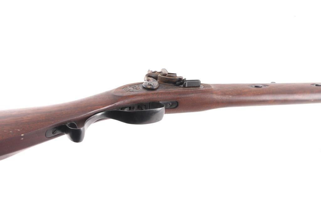 Italian made reproduction flintlock plains rifle chambered for .50 caliber ammunition. Features a heavy 33" octagonal barrel, large blade front sight, dovetailed semi buckhorn sight, case hardened lock, ramrod, double set triggers, and one piece straight grip shoulder stock with cheek rest & crescent metal buttplate. Rifle shows some small scattered patina on the barrel towards the muzzle. Action is sound, bore looks excellent, dusty and wood stock is almost fine with a little handling wear above the lock plate.Condition is Excellent. Antique Firearm.