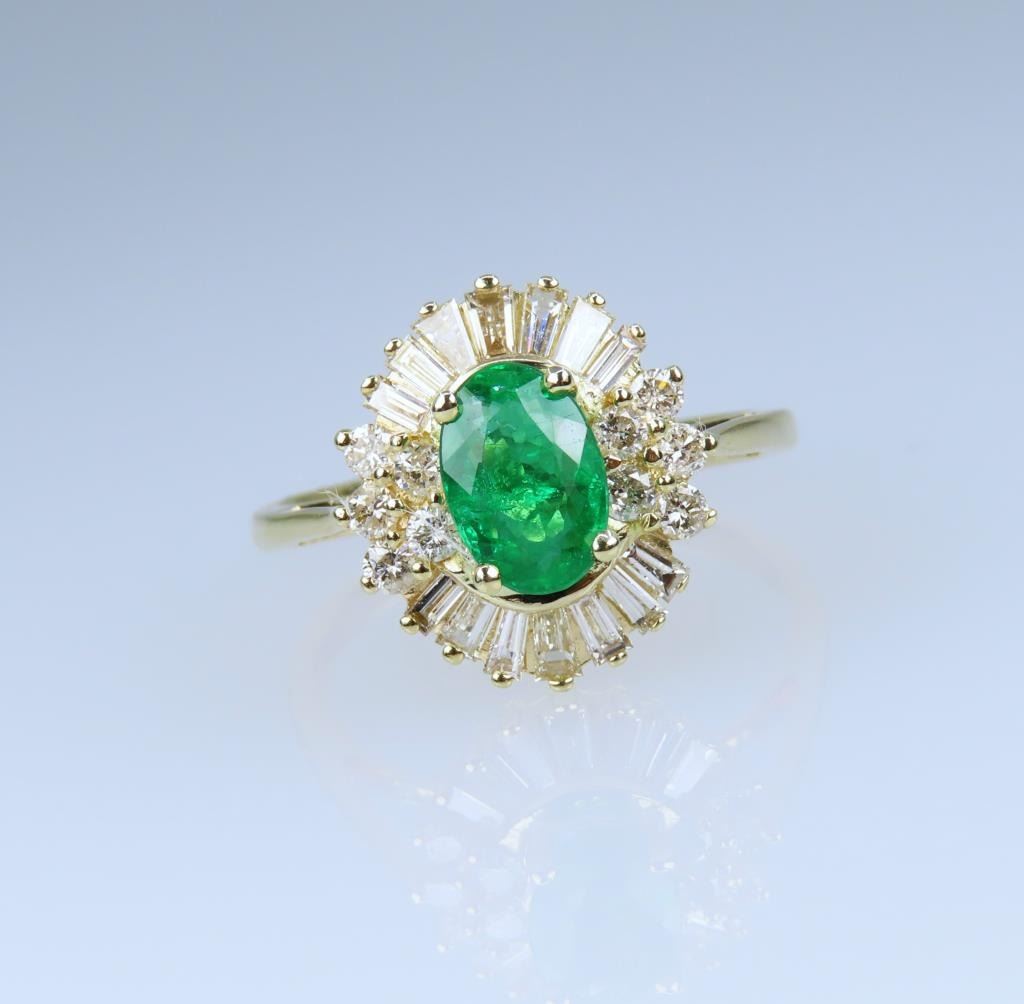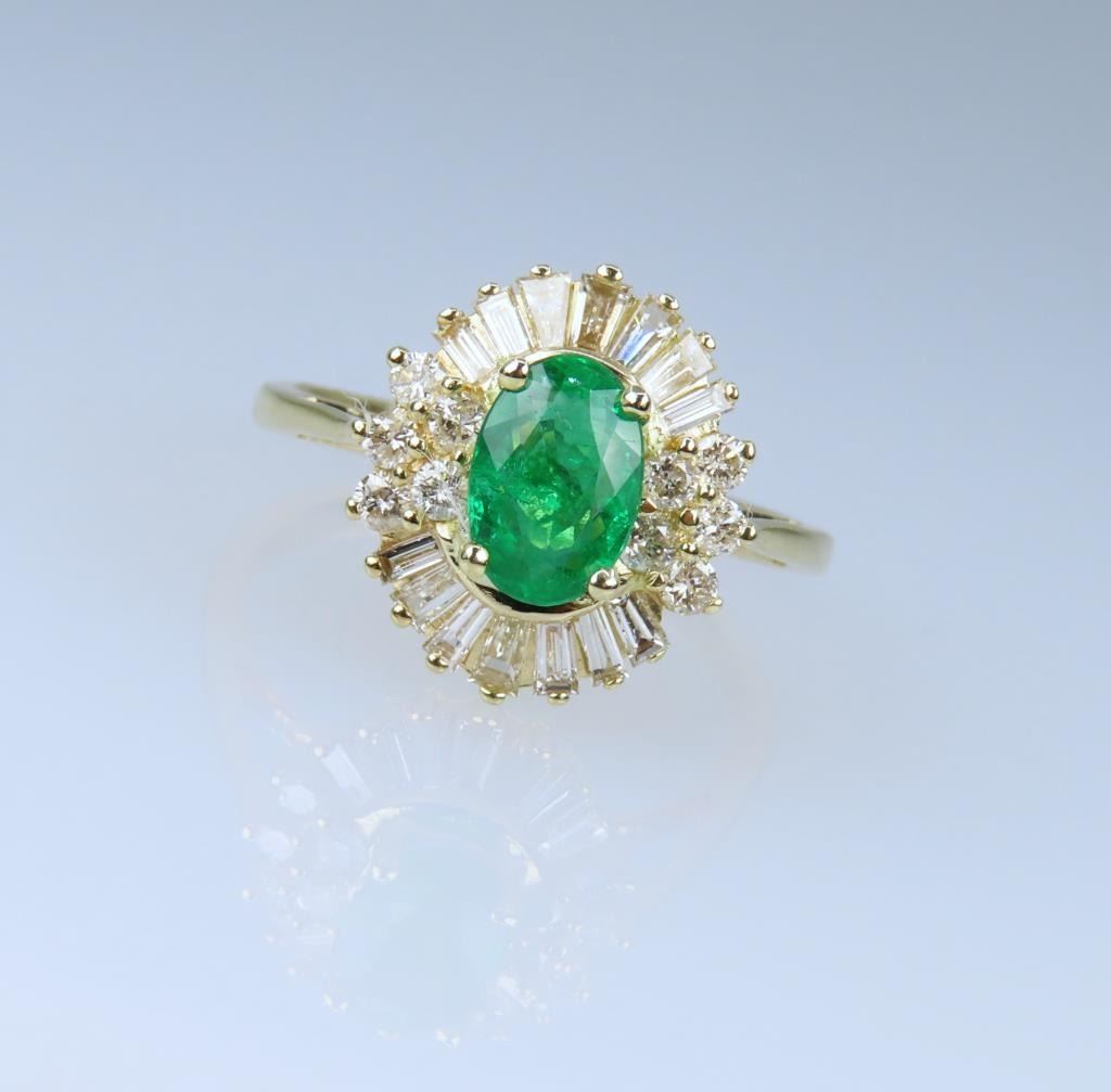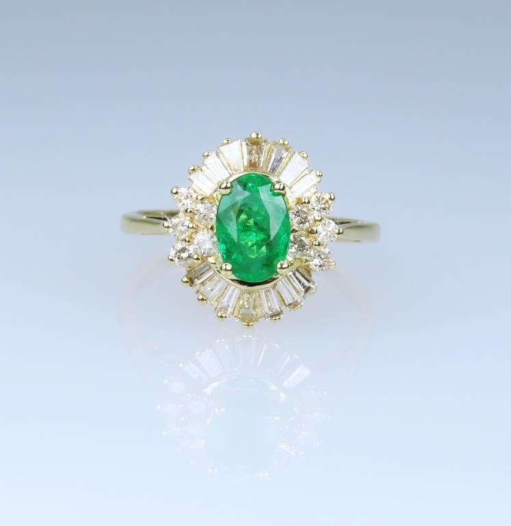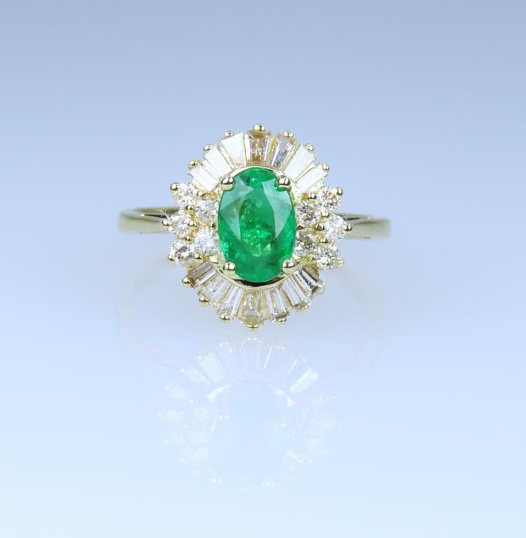 and Diamond Ring, featuring an oval cut Vivid Green Emerald weighing approx. 1.00 carat framed with 24 baguette and round cut Diamonds with G-H colors and VS-SI clarity, weighing approx. 1.00 carats, set in 14 karat yellow gold setting, ring size 6. Retail $4,000-$6,000.