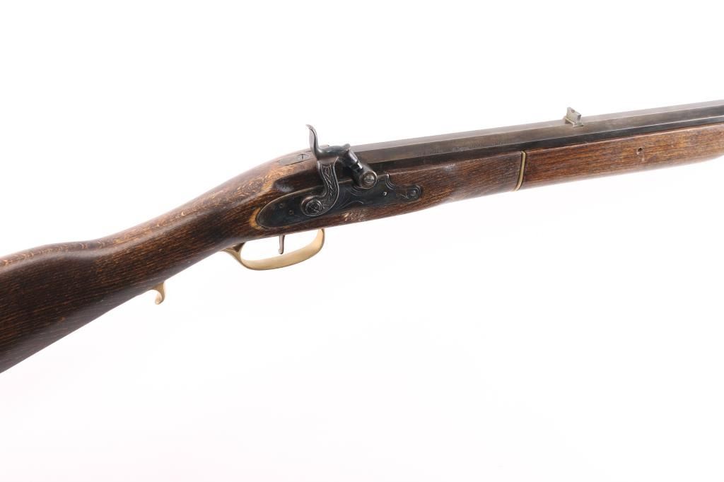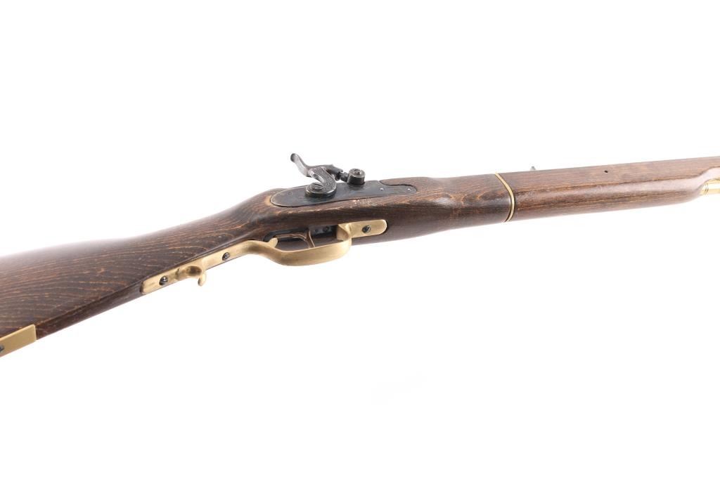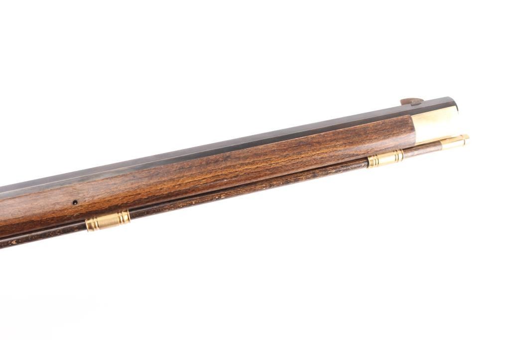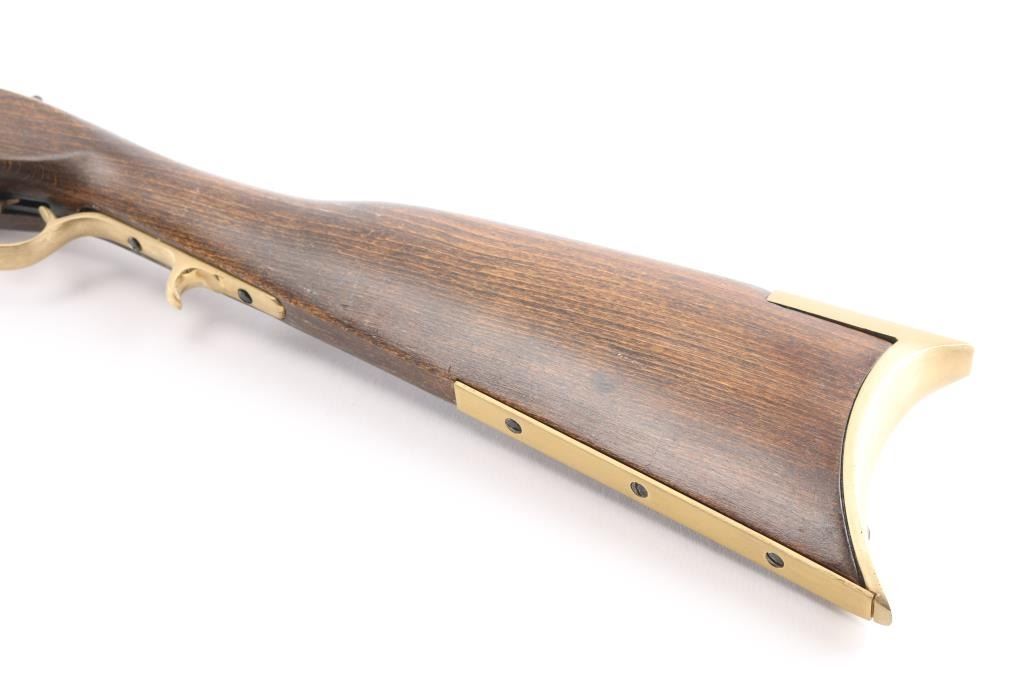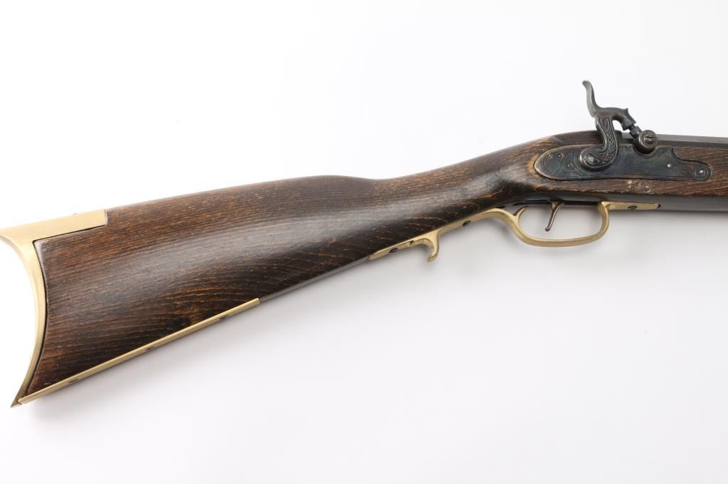 Made in Spain for Traditions, Old Saybrook, CT. Full stock Kentucky style percussion black powder muzzleloading rifle with a 33" octagon barrel, blade front sight, u-notch fixed rear, ramrod, brass plated fittings, case colored hammer, wedge and lock plate, wood stock with brass plated crescent butt plate. Barrel is turning a brown patina with edge wear on the flats. Bore is very good, strong rifling. Trigger works. Ramrod is wood. Case coloring is very good. Wood is very good/sound.NRA Condition-Very Good. Antique Firearm.