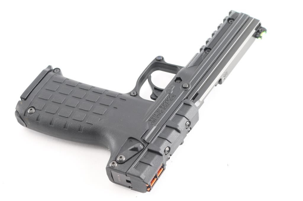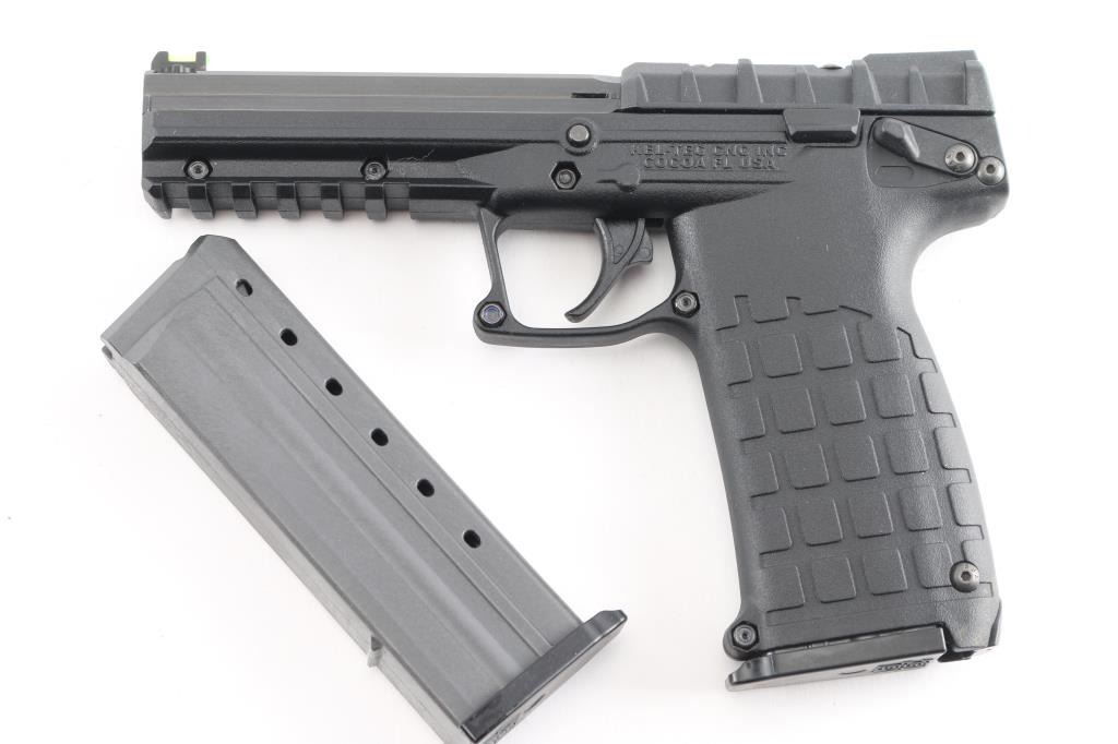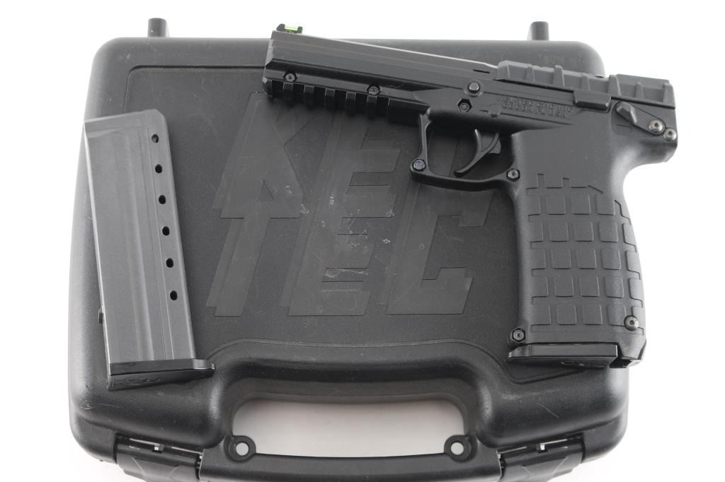 American made lightweight semi-automatic pistol, SA, hybrid blowback/locked-breech system lets you use a wide variety of ammunition and switches between them depending on the pressure of the cartridge, slide locks back after the last shot, approximately 4 1/4" barrel with blued finish,, bore is bright, high visibility fiber optic sights - single green in front sight and double orange in the rear, no exposed hammer, smooth trigger, black polymer frame with textured grips, accessory rail, ambidextrous manual safety, 30-round, double-stack magazine that fits completely in the grip. Includes a Kel-Tec case with instruction manual and spare magazine. (2) total.NRA Condition-Perfect-Like New. Modern Firearm.