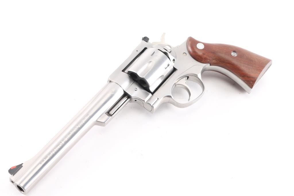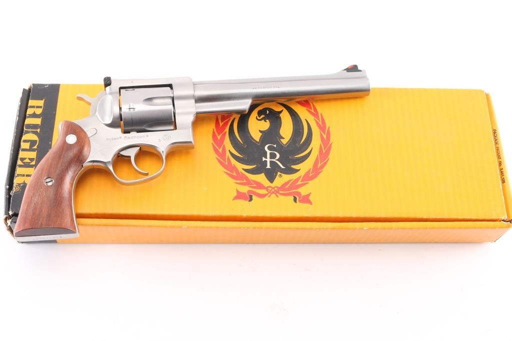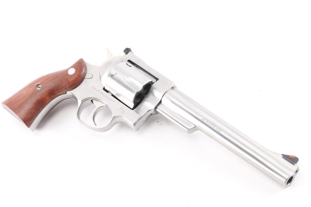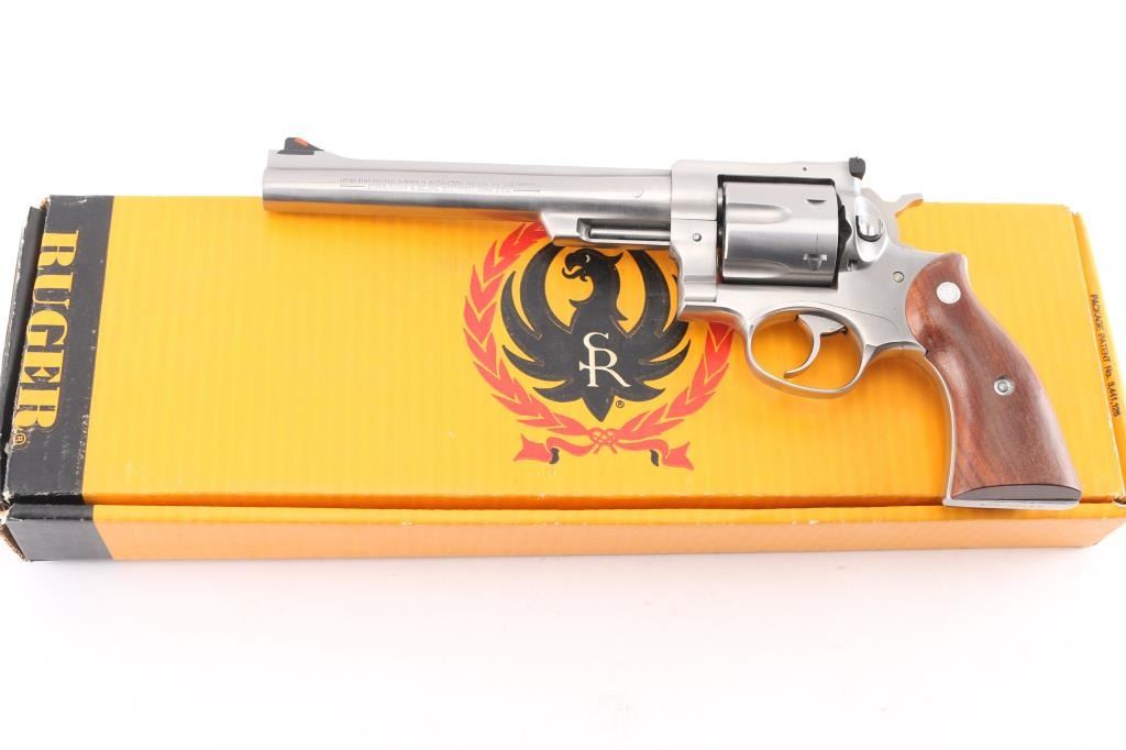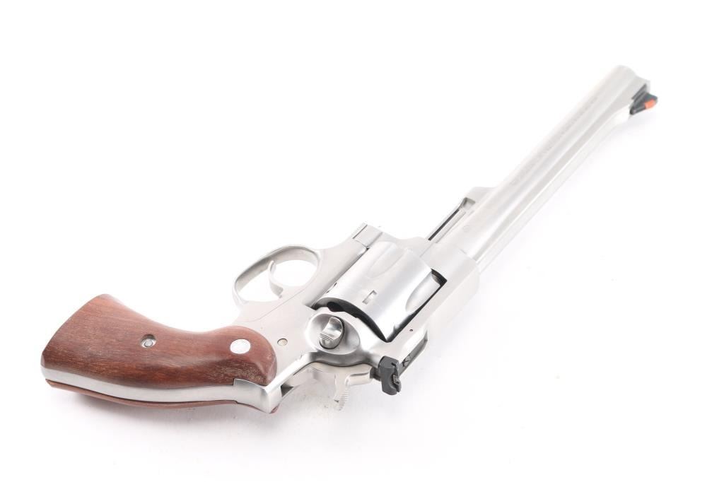 Large frame double-action six shot revolver chambered in .44 Magnum, circa 2000. Features a satin stainless finish, 7 1/2" barrel with serrated sighting rib, dovetailed serrated ramp front sight with orange insert, adjustable white square notch rear sight, smooth trigger, knurled hammer spur, transfer bar safety, fluted six-shot cylinder, shrouded ejector rod, and smooth brown wood grips with Ruger medallions. Bore is bright with strong rifling. Retains approx. 98% finish with no marks. Action is smooth with solid lock-up. Grips are very good.NRA Condition is excellent. ***Modern Firearm***