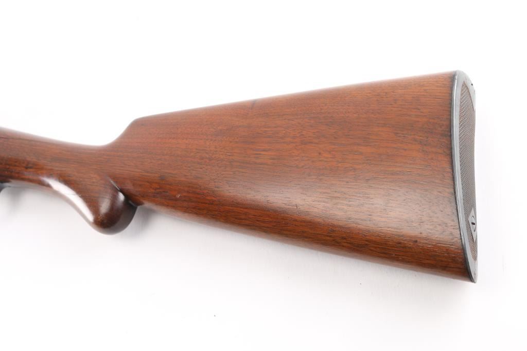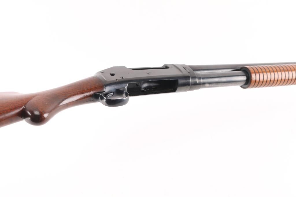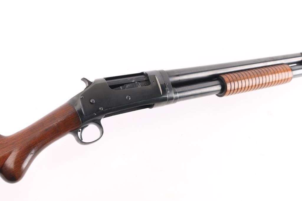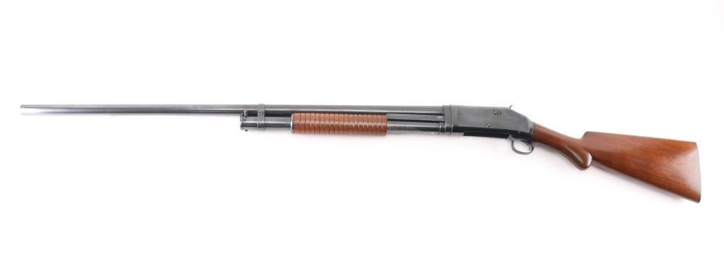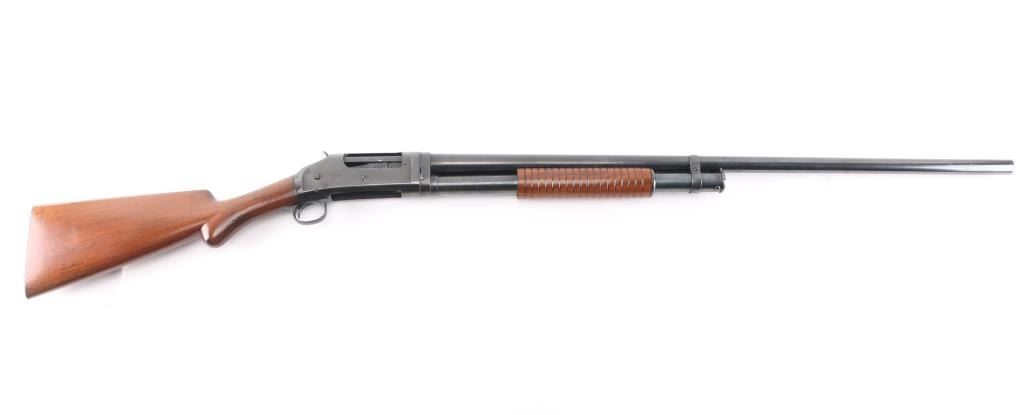 This Shotgun has been professionally restored. Vintage take down pump action shotgun manufactured circa 1905. Features 32" plain barrel marked FULL choke with a brass front bead, half length magazine tube, smooth wood semi-pistol grip stock & grooved pump handle. It has a thin smooth trigger and a Niedner checkered steel butt plate, exposed hammer. Bore is overall good/bright with some small areas of very light pin-prick pitting, action is crisp/tight, markings are a little feint from reblue but readable, refinished wood is excellent, reblue finish is about 95% with a little friction wear on the tube, action bar and bolt, there is a very small patch of light pitting on left barrel near the muzzle. LOP is 14" NRA Condition-Good. C&R Firearm.